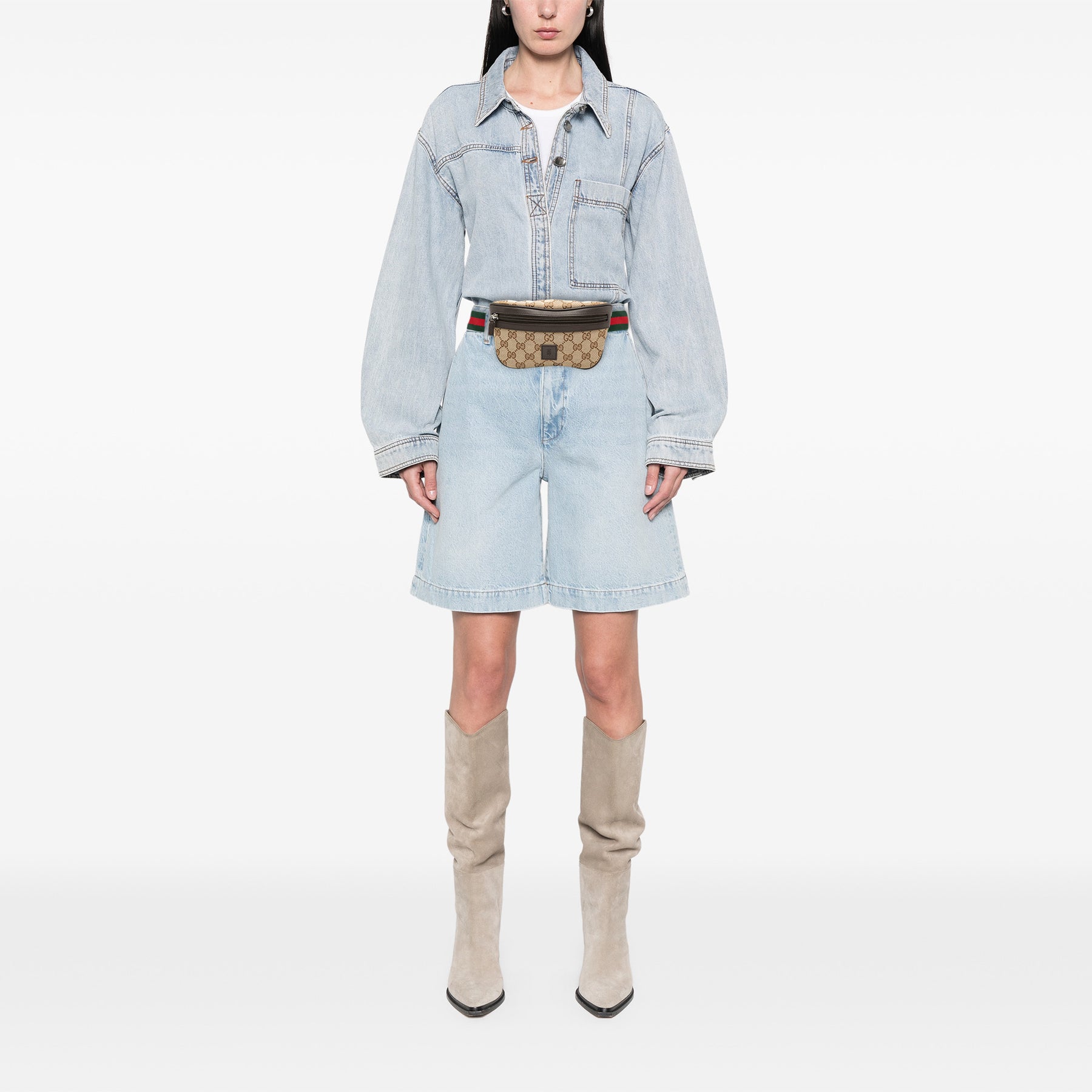 Ce sac banane est en toile avec des finitions en cuir, une bandoulière plate réglable en toile, une fermeture éclair et une poche intérieure plaquée. Il est en excellent état.