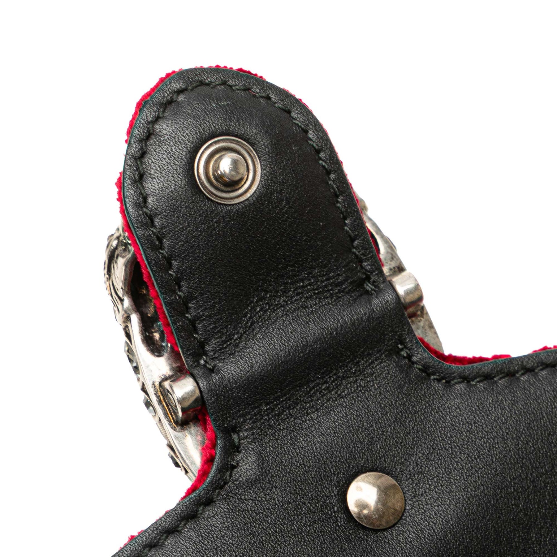 Le sac bandoulière Dionysus est en velours avec des finitions en cuir, une bandoulière chaîne argentée et un rabat à pression. Il est en bon état.