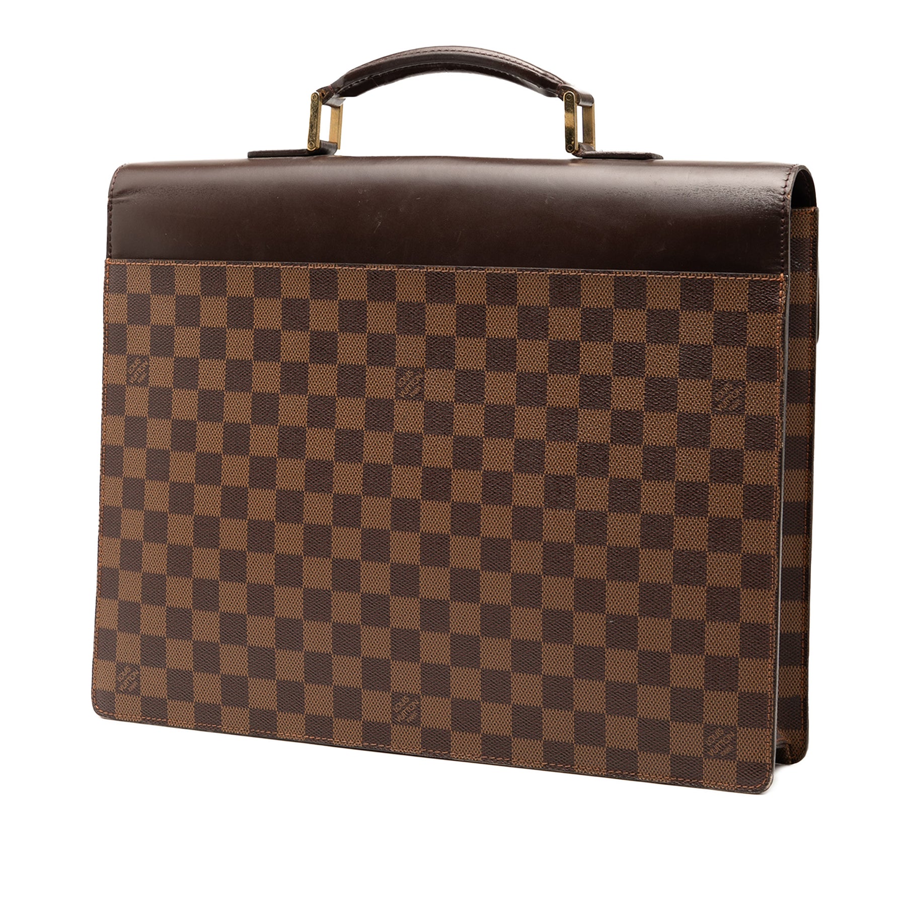 Le sac Altona PM est confectionné en toile Damier avec des finitions en cuir, une poignée supérieure plate en cuir, un rabat avant avec fermeture à pression et des poches intérieures plaquées. Il est en bon état.