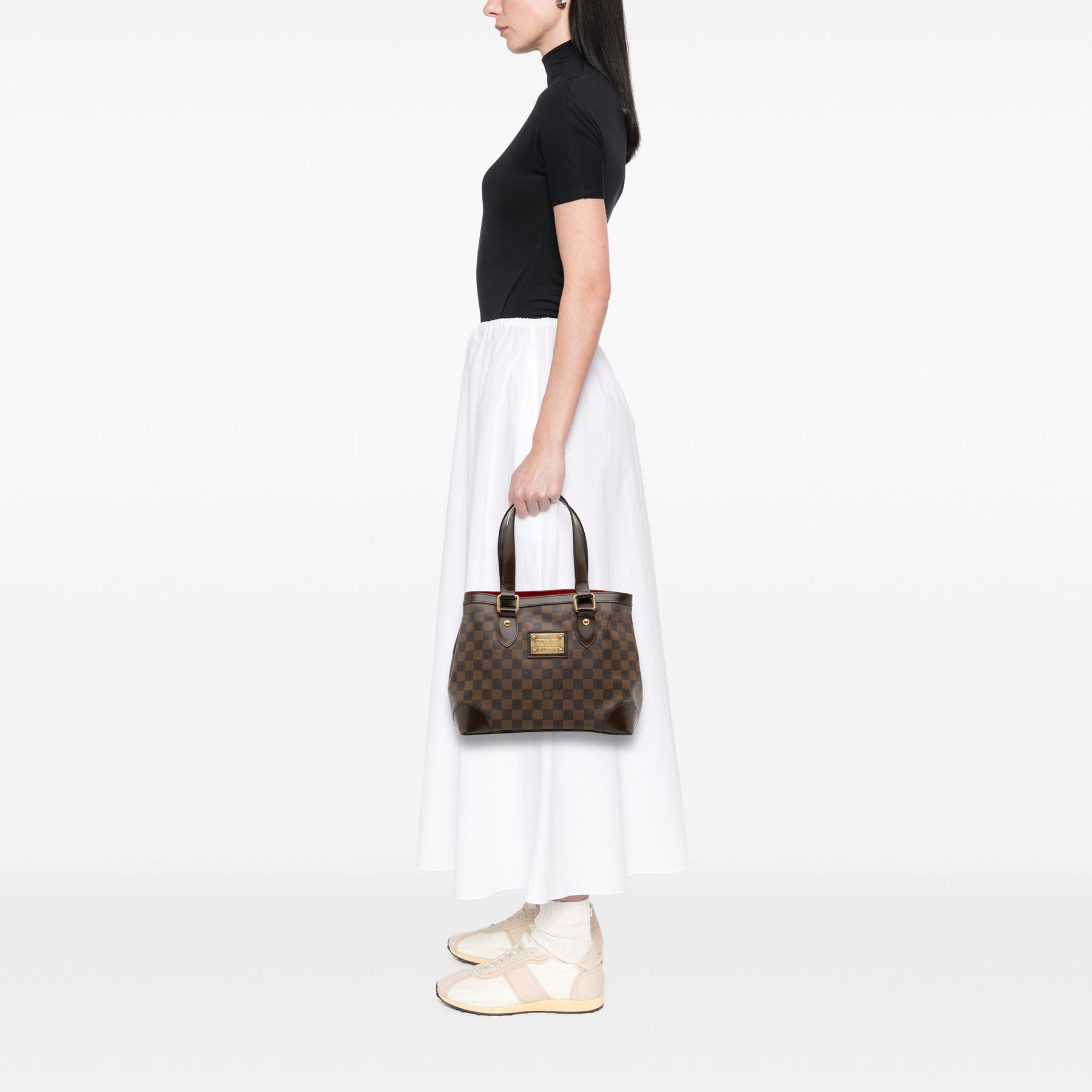Le sac Hampstead PM est confectionné en toile Damier Ébène avec des finitions en cuir, des anses plates en cuir, une ouverture sur le dessus avec fermeture à crochet, ainsi que des poches intérieures zippées et plaquées. Il est en bon état.