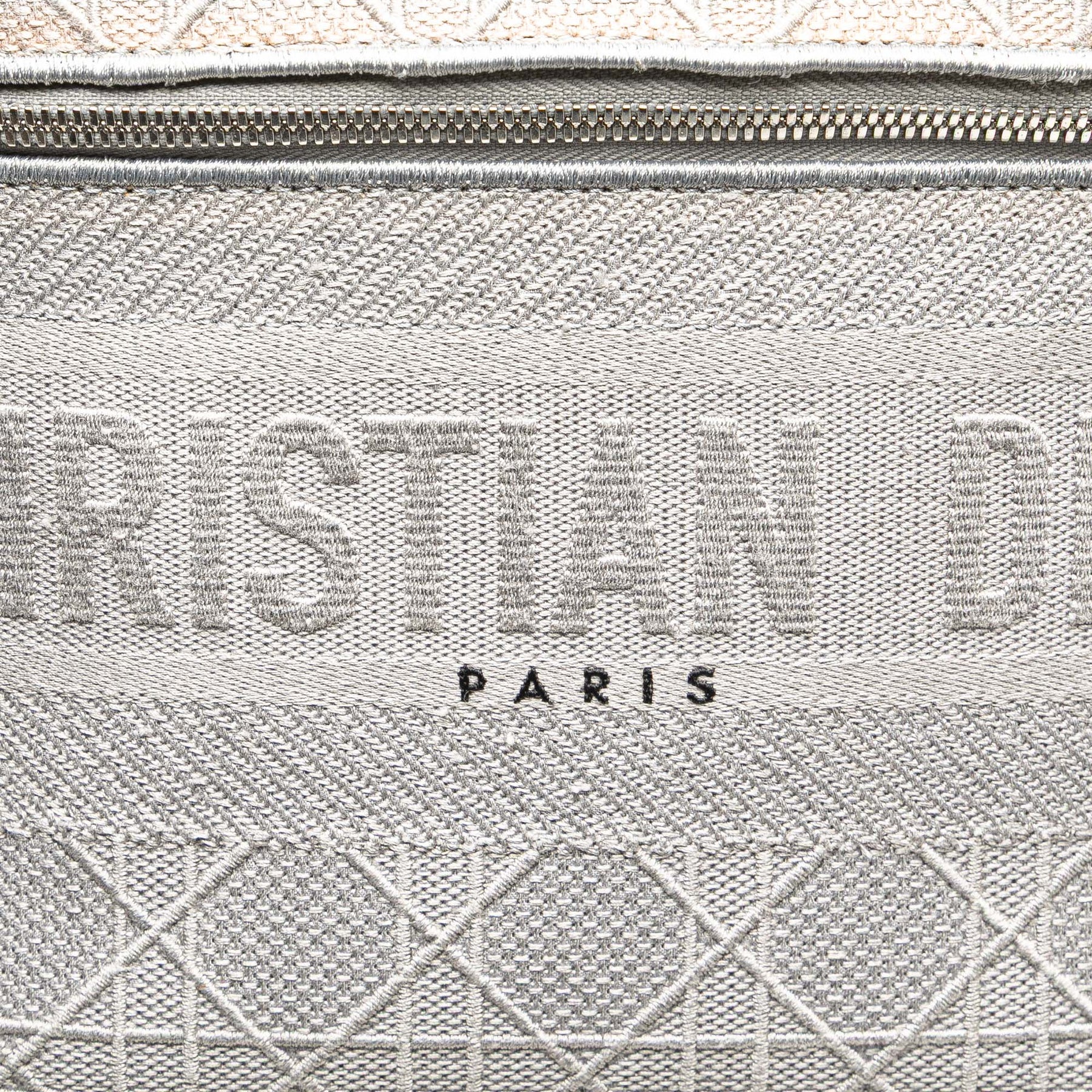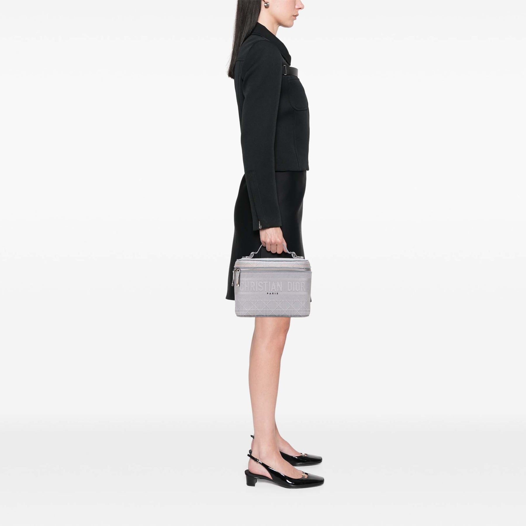 Ce sac vanity est en toile brodée, possède une poignée plate, une fermeture zippée et des poches intérieures plaquées. Il est en bon état.