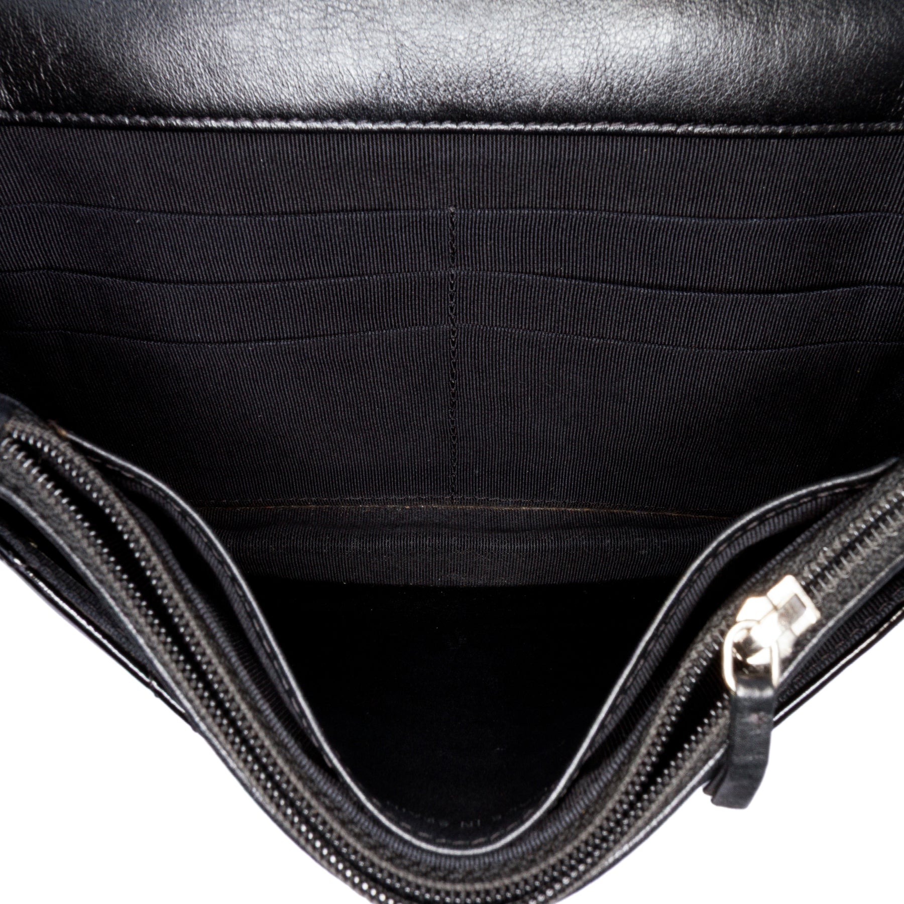 Ce portefeuille à chaîne est confectionné en cuir verni matelassé et possède une bandoulière en chaîne tressée de cuir, un rabat avant orné du logo CC laqué et d'une fermeture à pression, un compartiment intérieur zippé, ainsi que des poches intérieures zippées et plaquées. Il est en excellent état.
