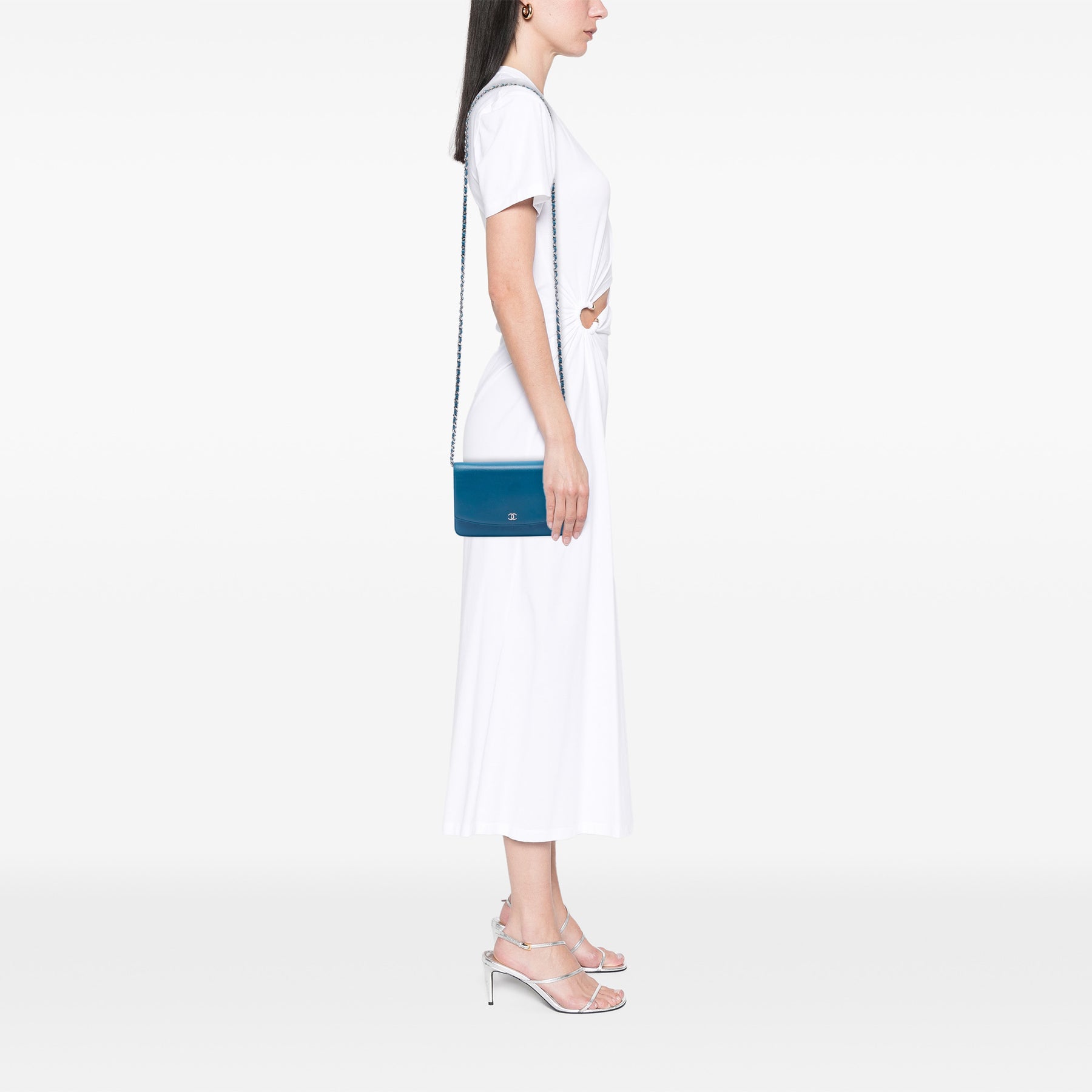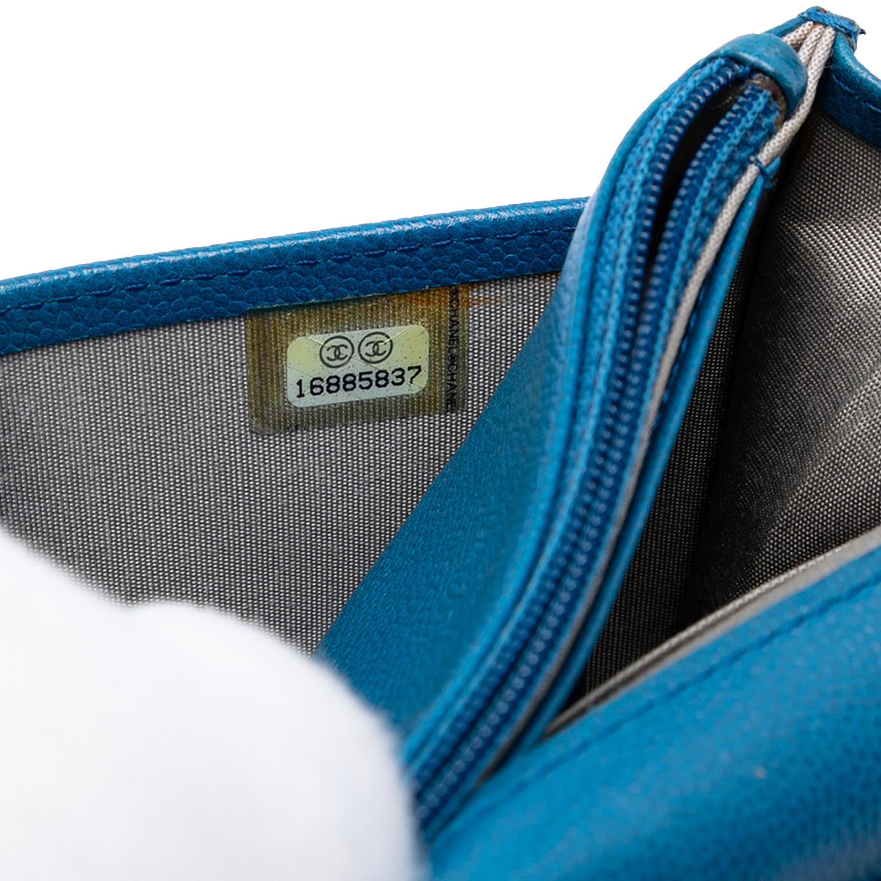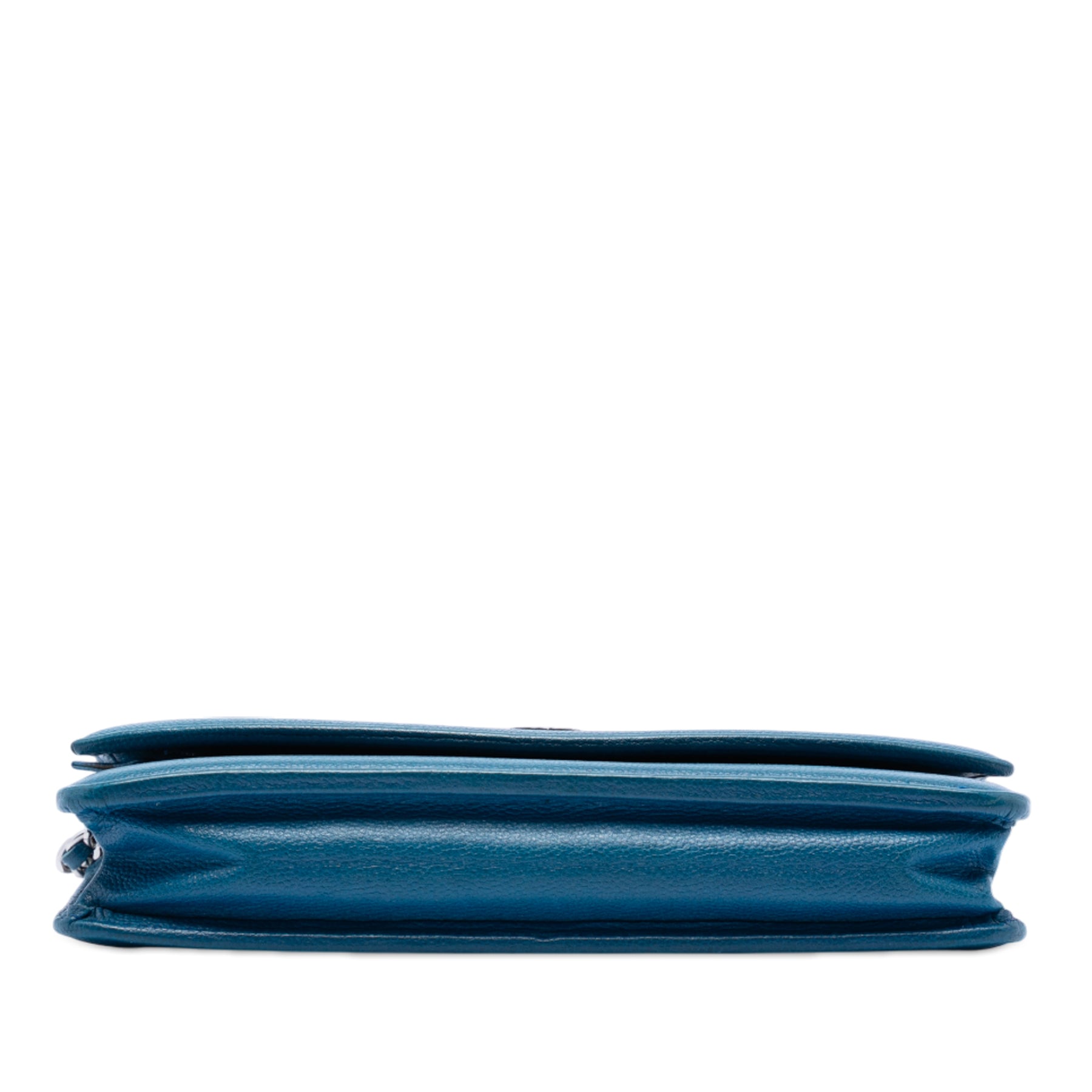 Ce portefeuille à chaîne est confectionné en cuir caviar et possède une bandoulière en chaîne tressée de cuir, un rabat avant à fermeture magnétique, ainsi que des poches intérieures zippées et plaquées. Il est en bon état.