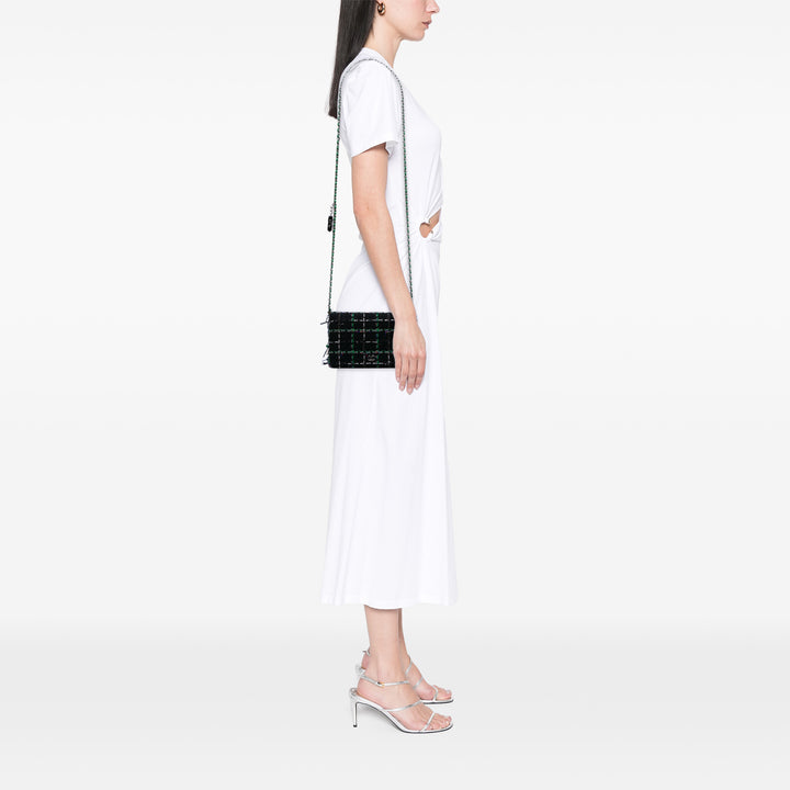 Ce sac bandoulière est doté d'un corps en tweed, d'une bandoulière en cuir tressé, d'un rabat à pression, d'un compartiment intérieur zippé et de poches intérieures zippées et plaquées. Il est en bon état.