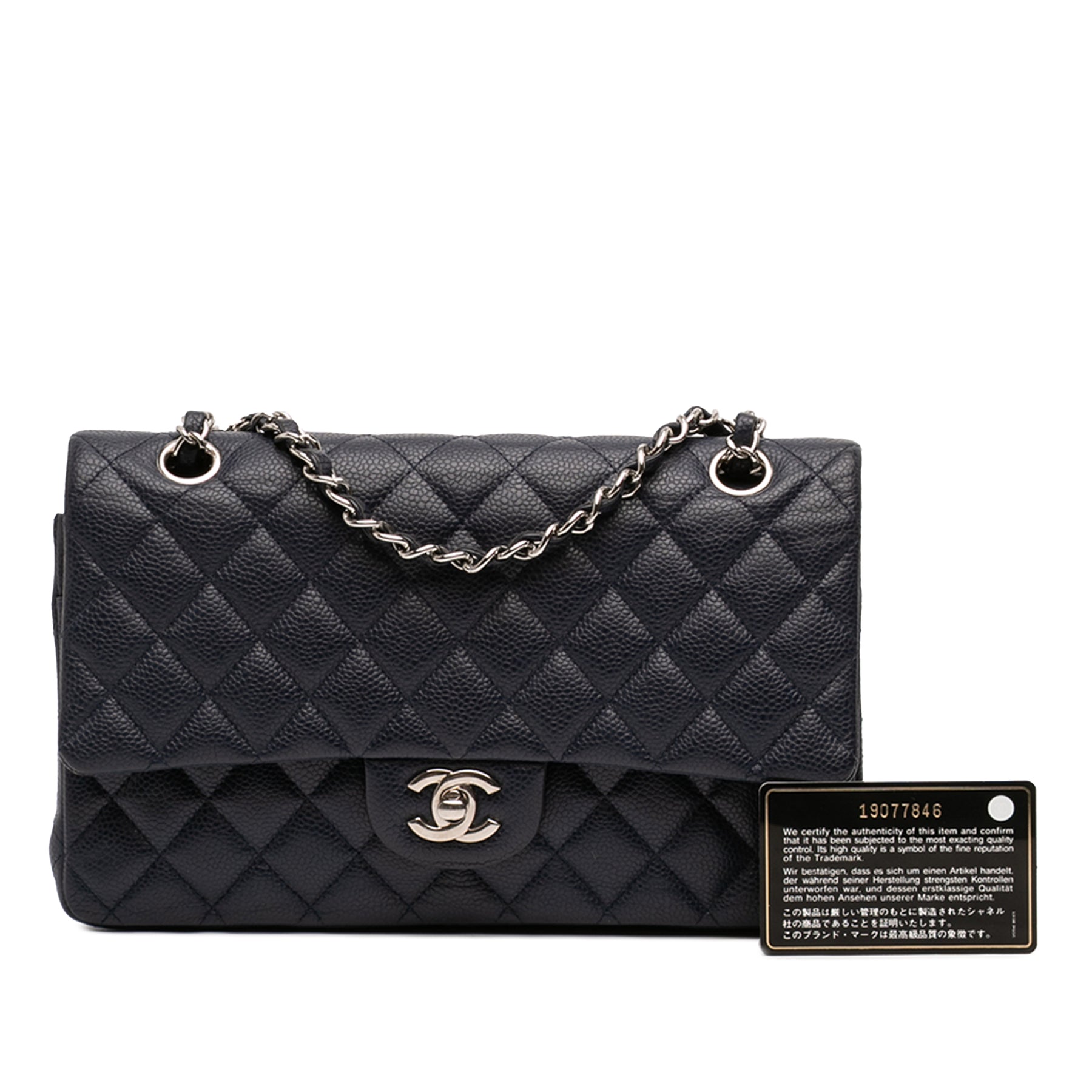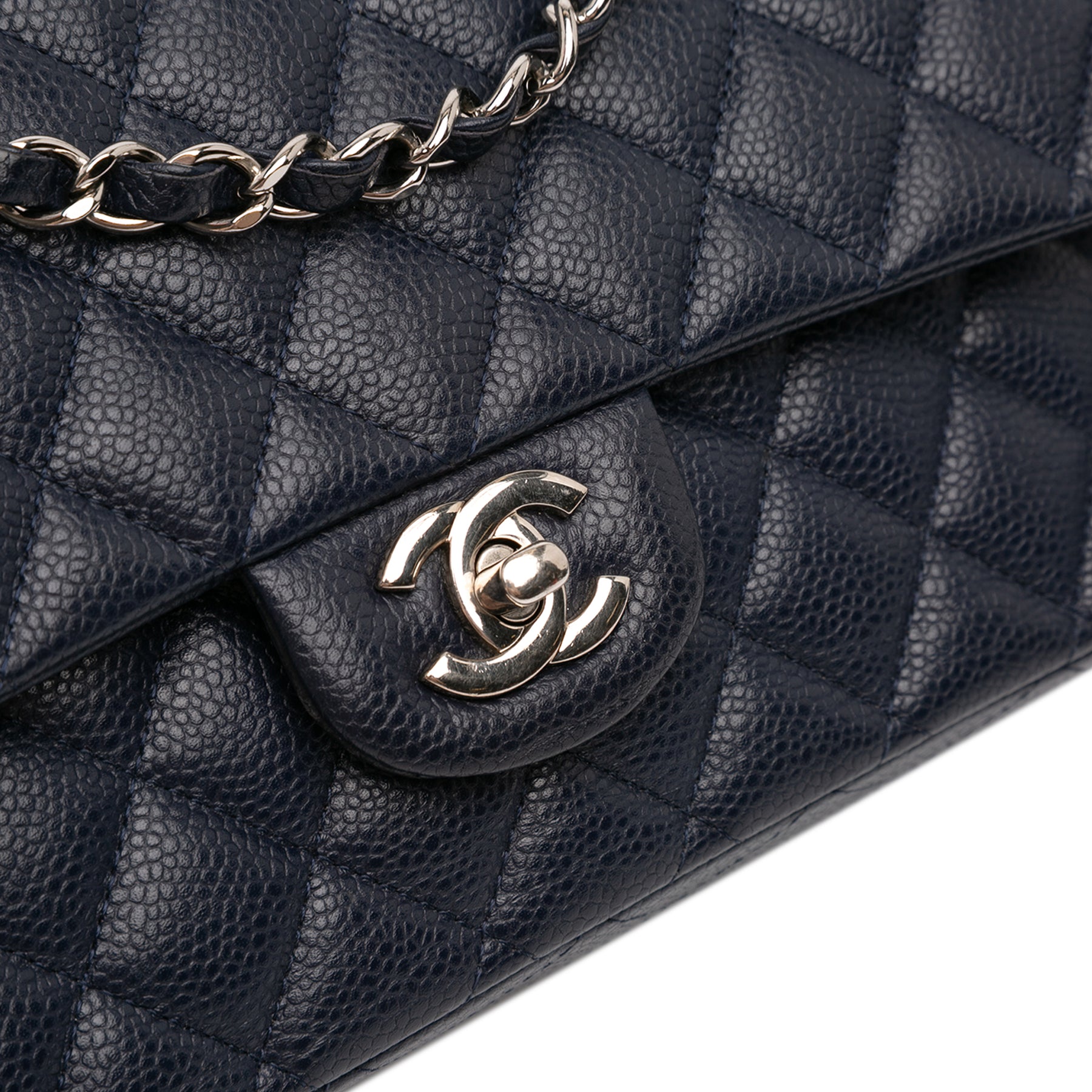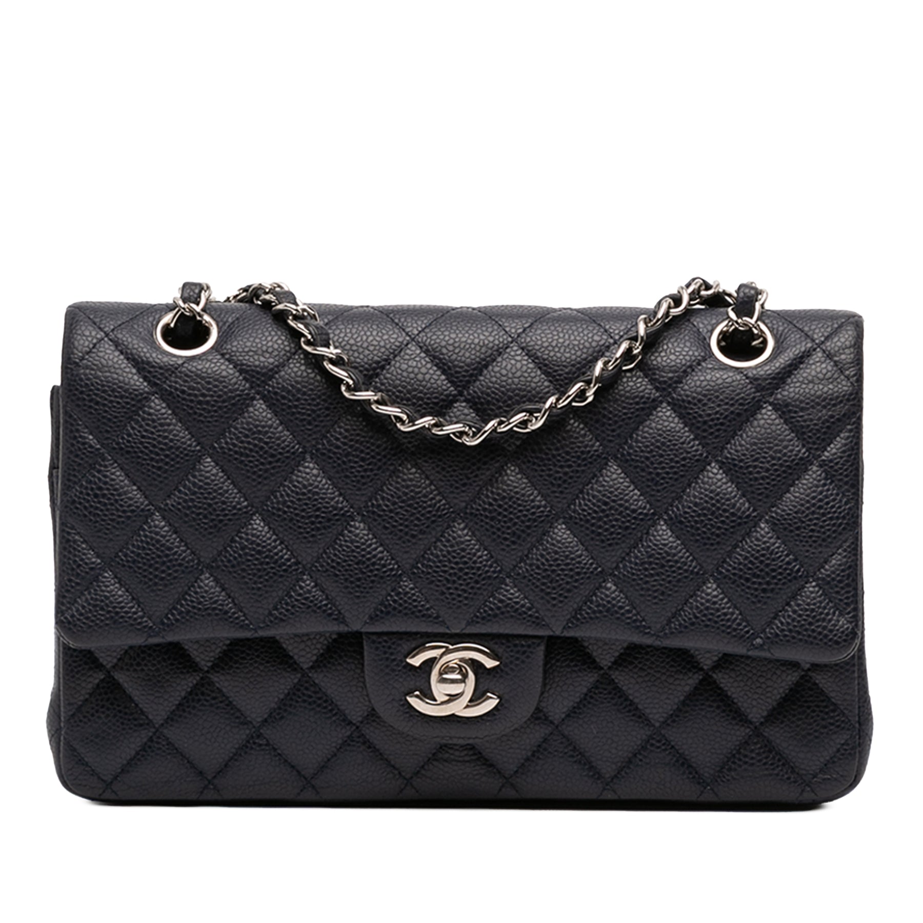 Ce sac bandoulière est confectionné en cuir caviar matelassé et possède une bandoulière en chaîne tressée, un double rabat avant avec fermoir CC, une poche plaquée extérieure au dos, ainsi que des poches intérieures zippées et plaquées. Il est en bon état.