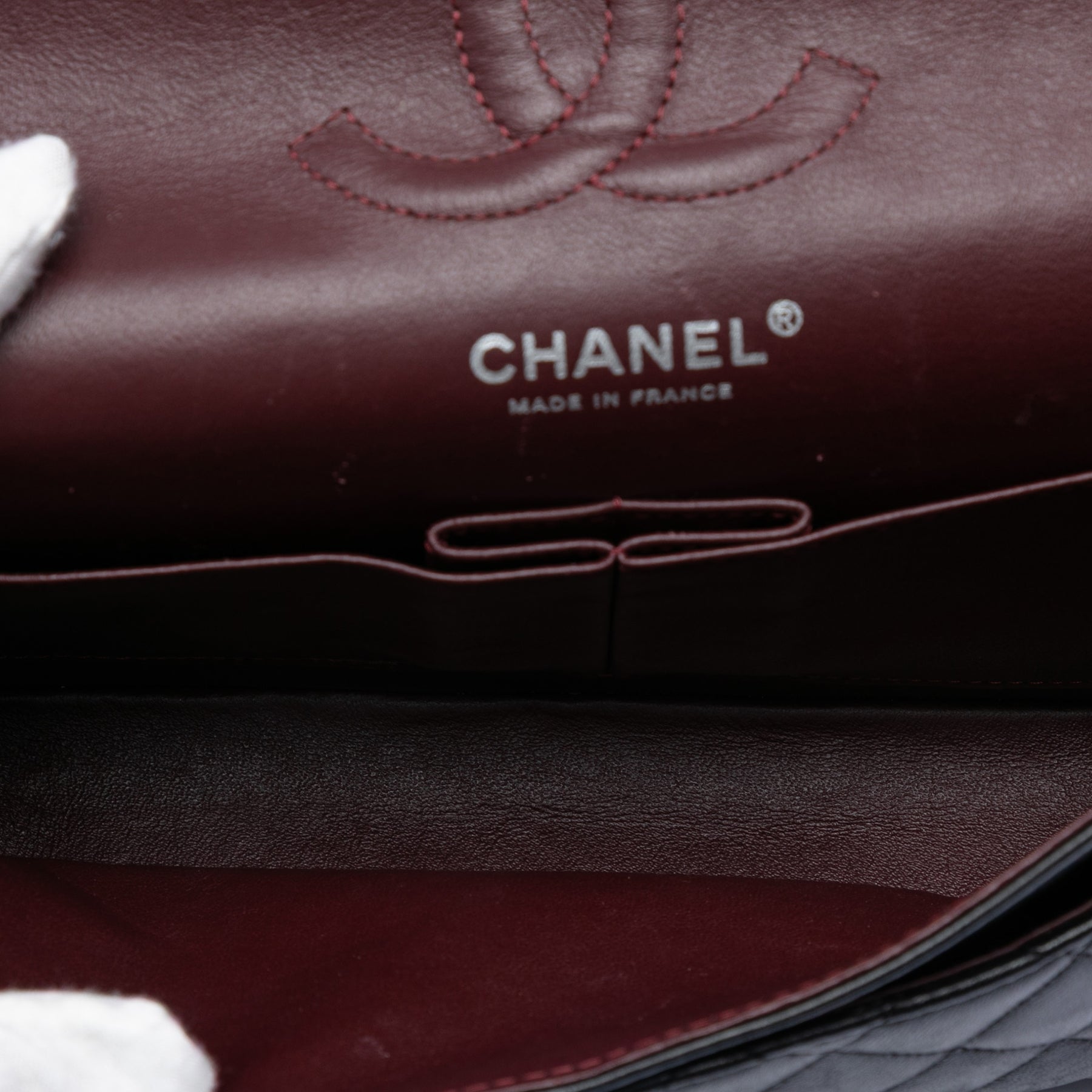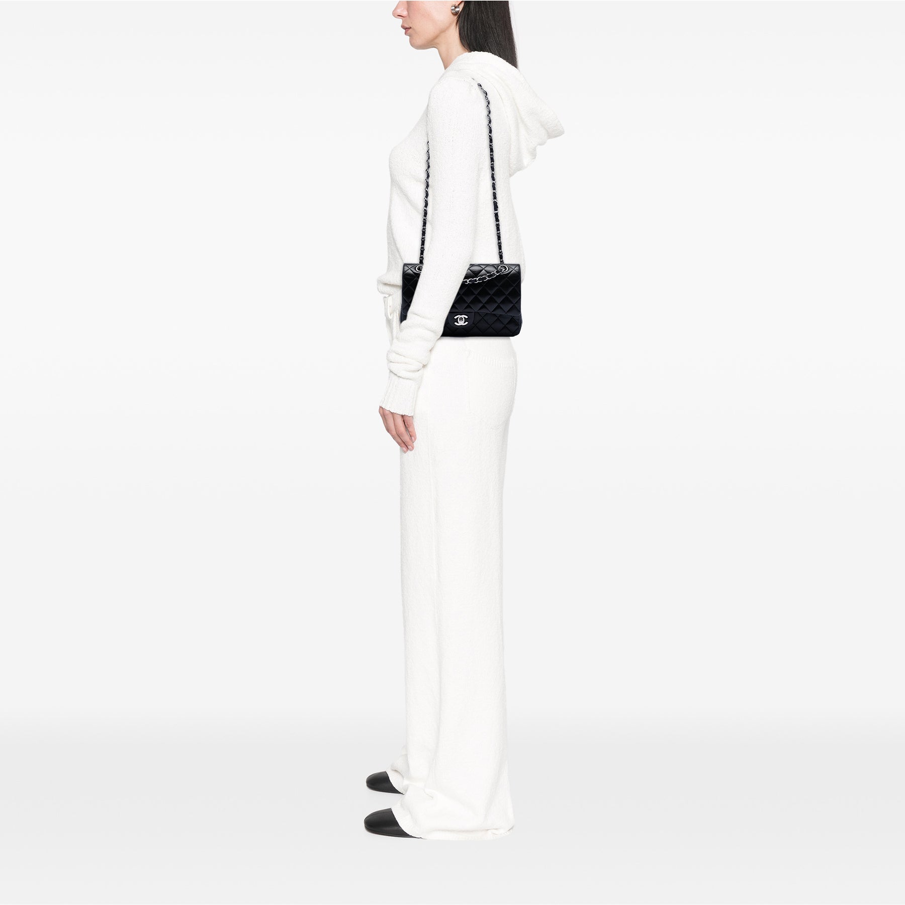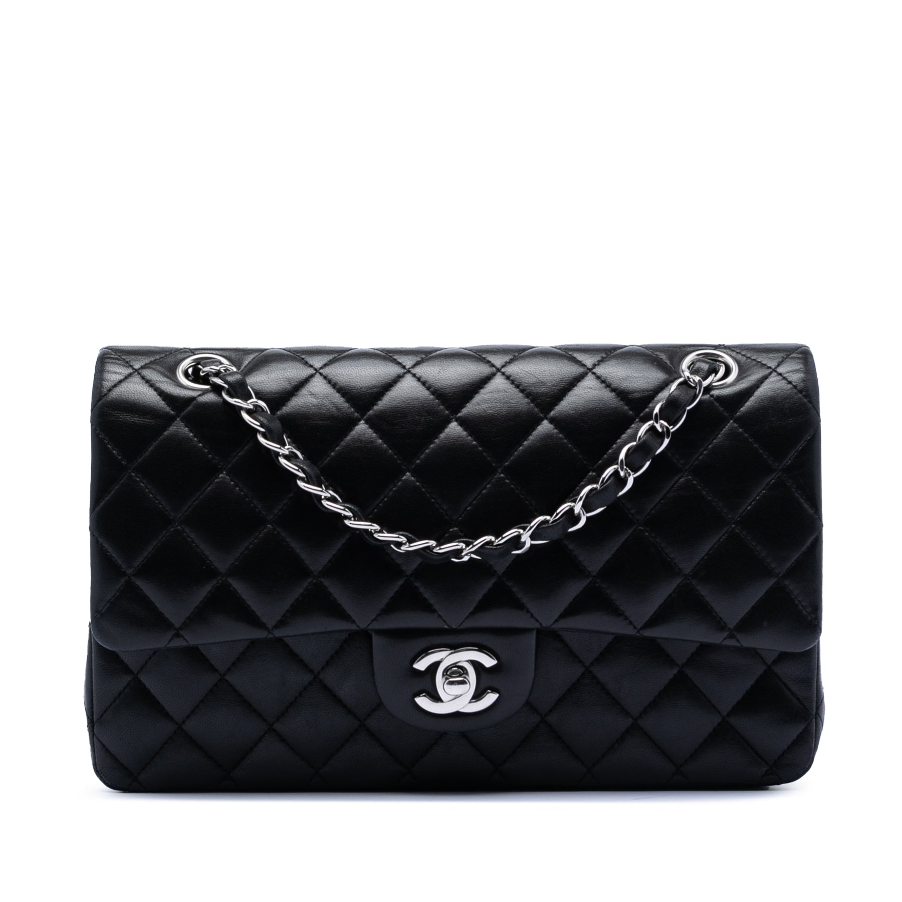 Ce sac bandoulière est confectionné en cuir d'agneau matelassé et présente des bandoulières en chaîne tressée de cuir, un double rabat avant orné du double C entrelacé et d'une fermeture à tourniquet, une poche plaquée extérieure au dos, ainsi que des poches intérieures zippées et plaquées. Il est en bon état.