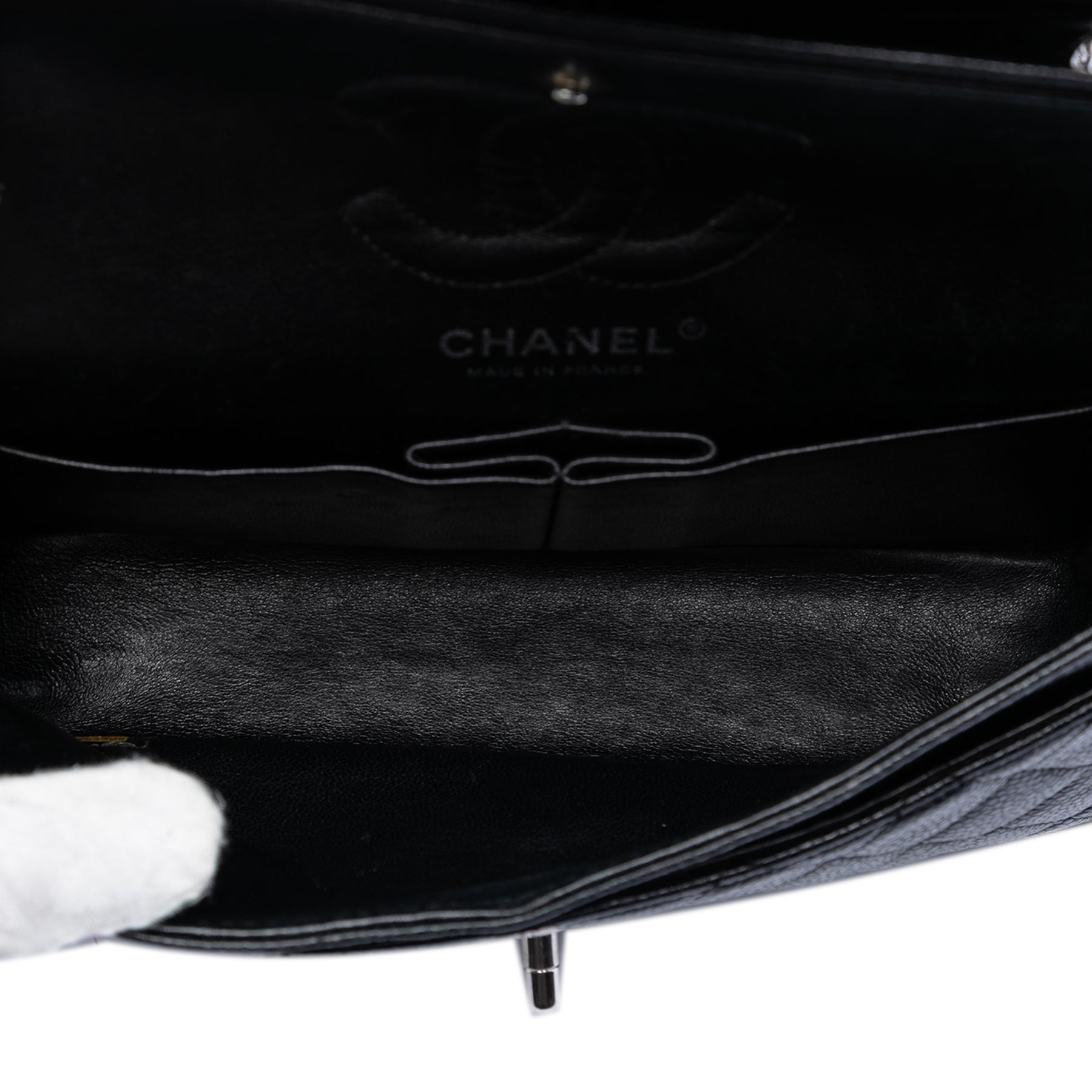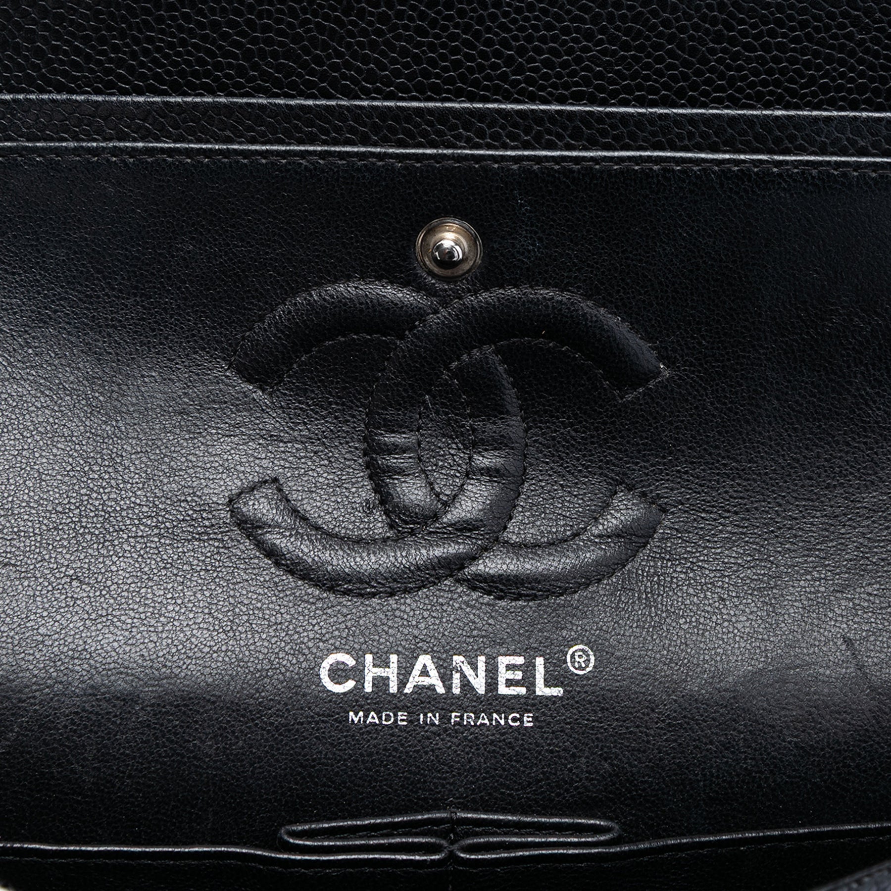 Ce sac bandoulière est confectionné en cuir caviar matelassé et possède une bandoulière en chaîne tressée argentée. Il est doté d'un double rabat avant avec fermoir CC, d'une poche plaquée extérieure au dos et de poches intérieures zippées et plaquées. Il est en bon état.