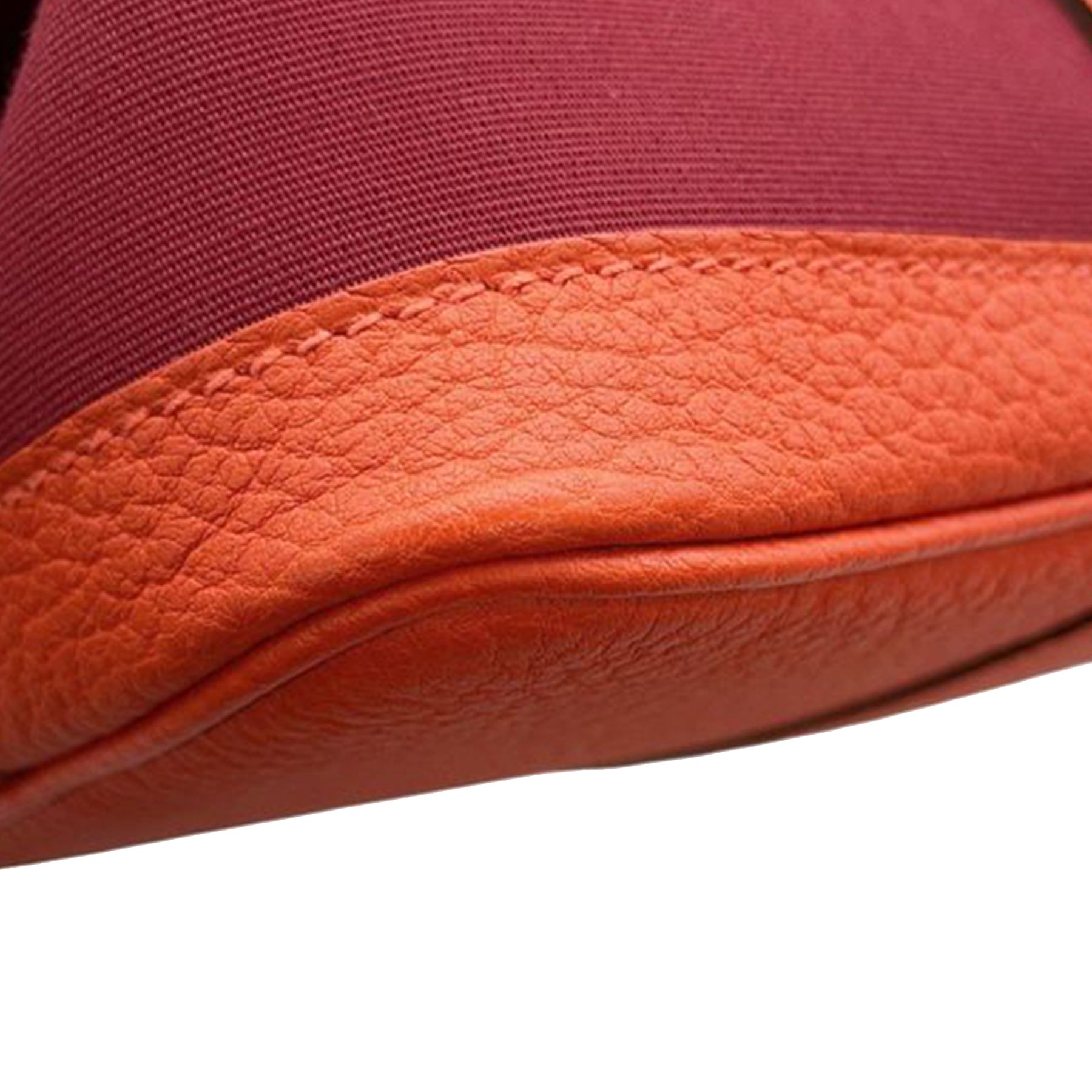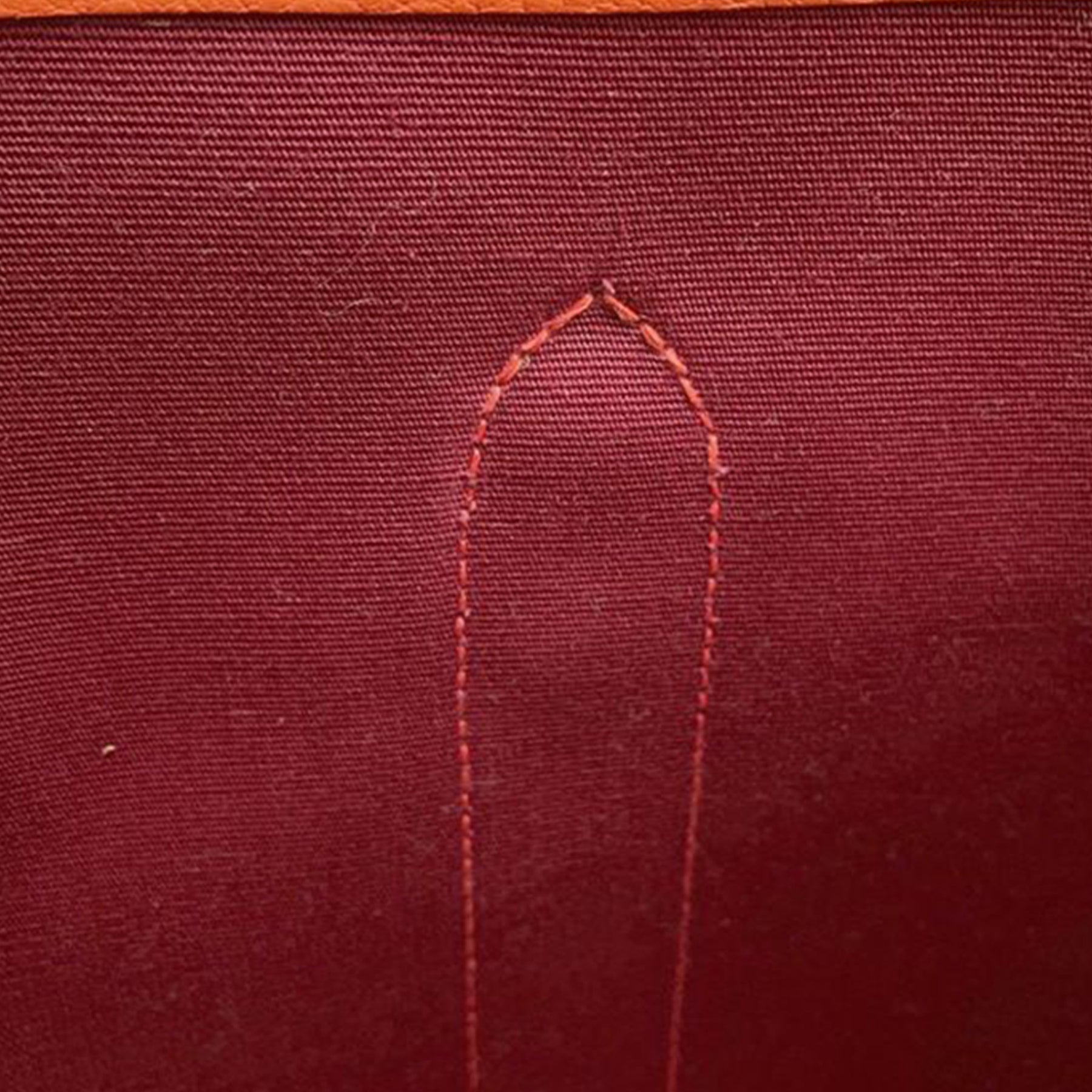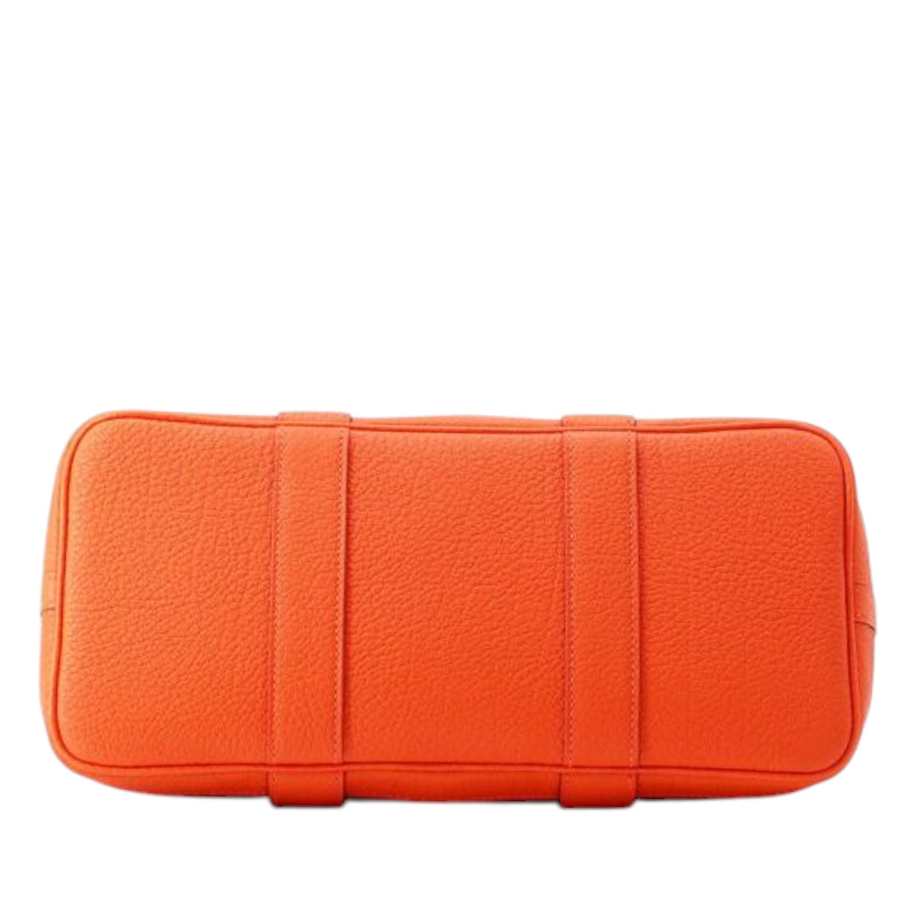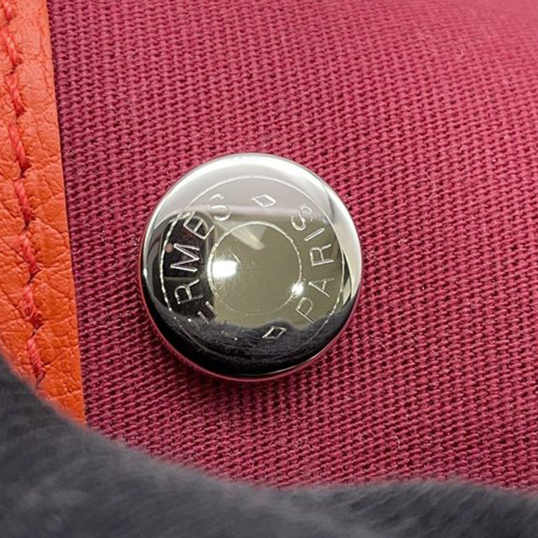 Ce sac Garden Party 30 est doté d'une structure en toile Rouge Grenat, de finitions en cuir Negonda couleur Orange Poppy, de poignées roulées en cuir et d'une ouverture sur le dessus avec fermeture à bouton-pression. Il est en excellent état.
