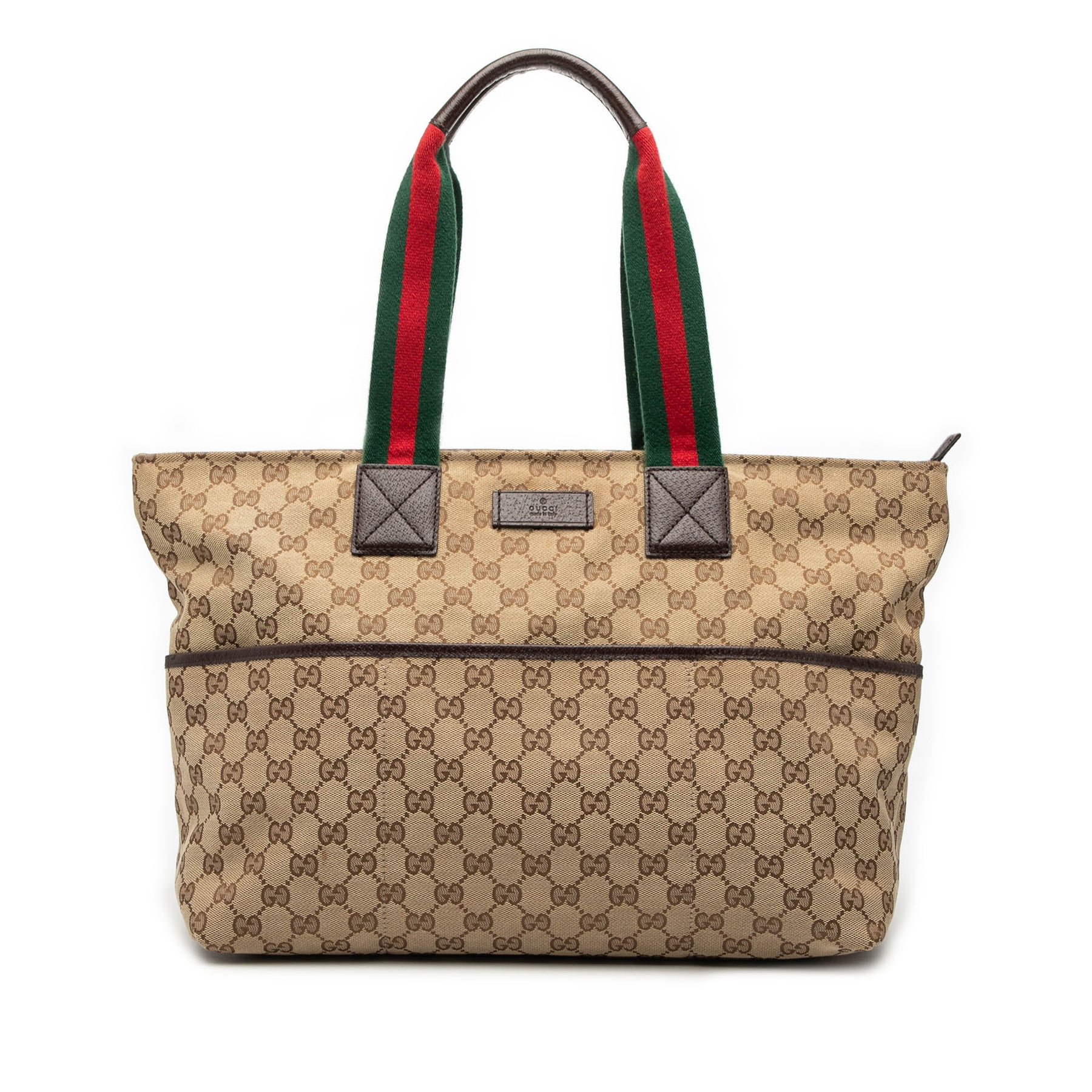 Ce sac cabas est en toile avec des finitions en cuir, des bandoulières plates en toile, une fermeture zippée sur le dessus, des poches extérieures plaquées et des poches intérieures zippées et plaquées. Il est en bon état.