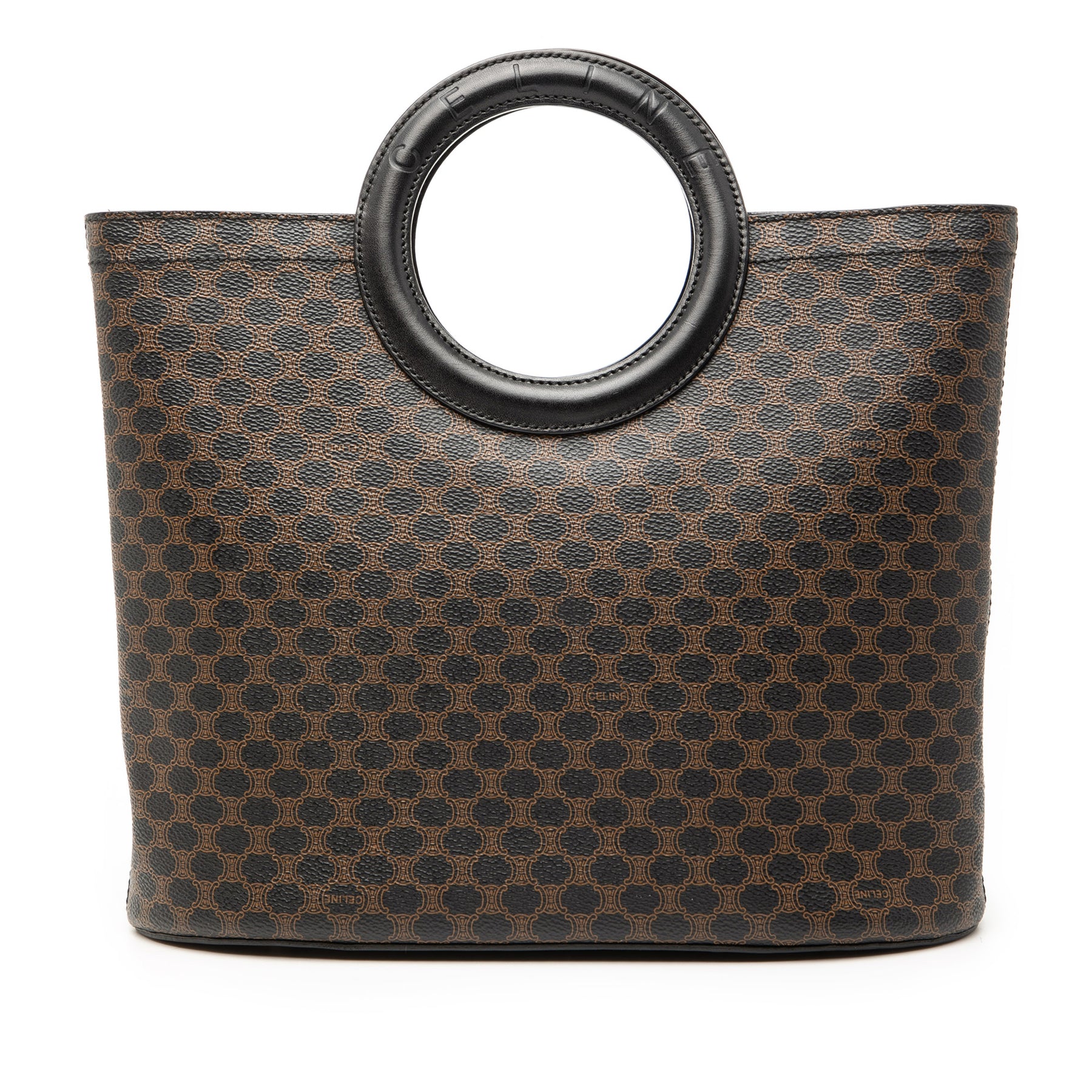 Ce sac cabas est en toile enduite avec des finitions en cuir, des anses plates en cuir, une ouverture sur le dessus et une poche intérieure. Il est en excellent état.