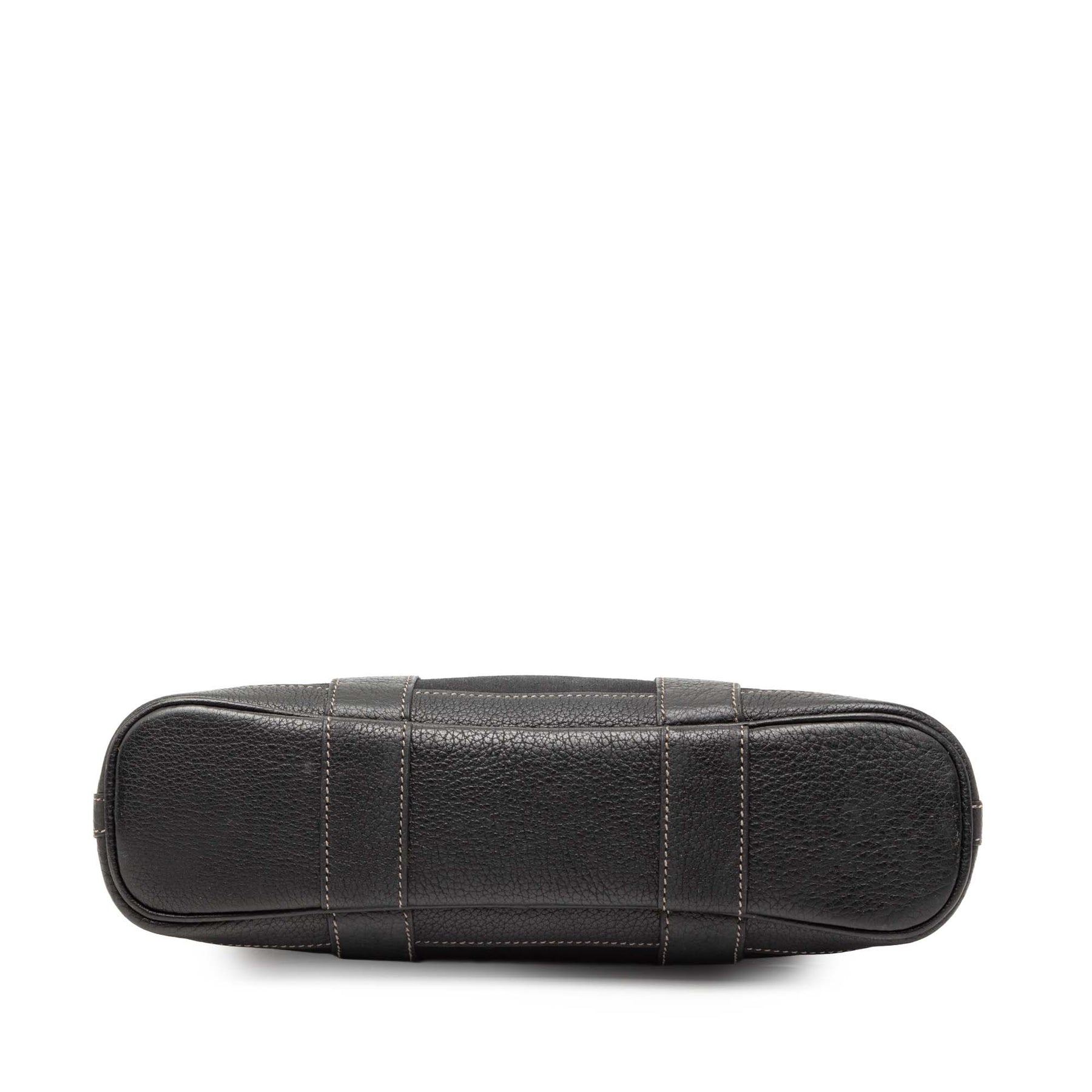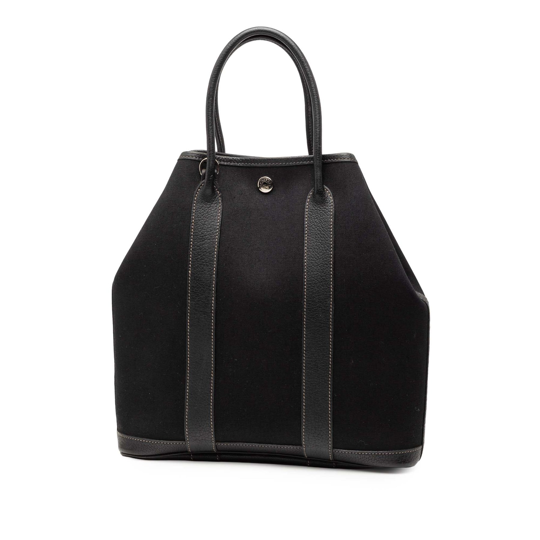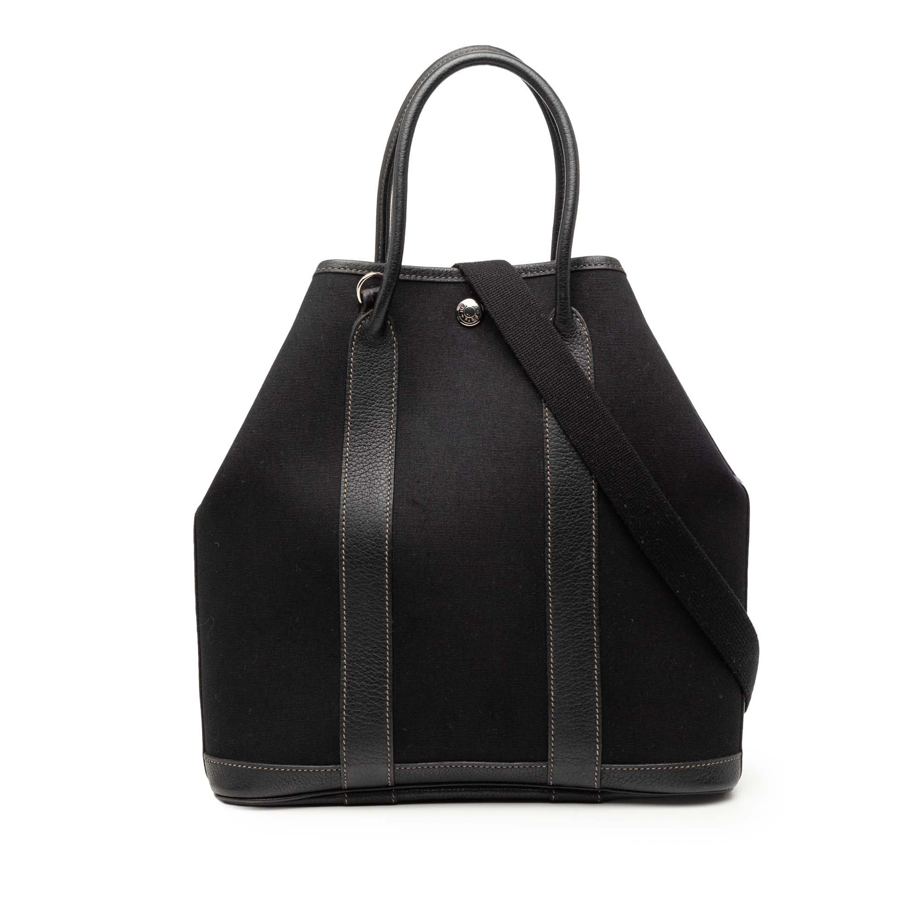Le porte-documents Toile Garden Party File 28 est confectionné en toile avec des finitions en cuir, des poignées roulées en cuir, une bandoulière plate amovible et une ouverture sur le dessus avec fermeture à bouton-pression. Il est en excellent état.