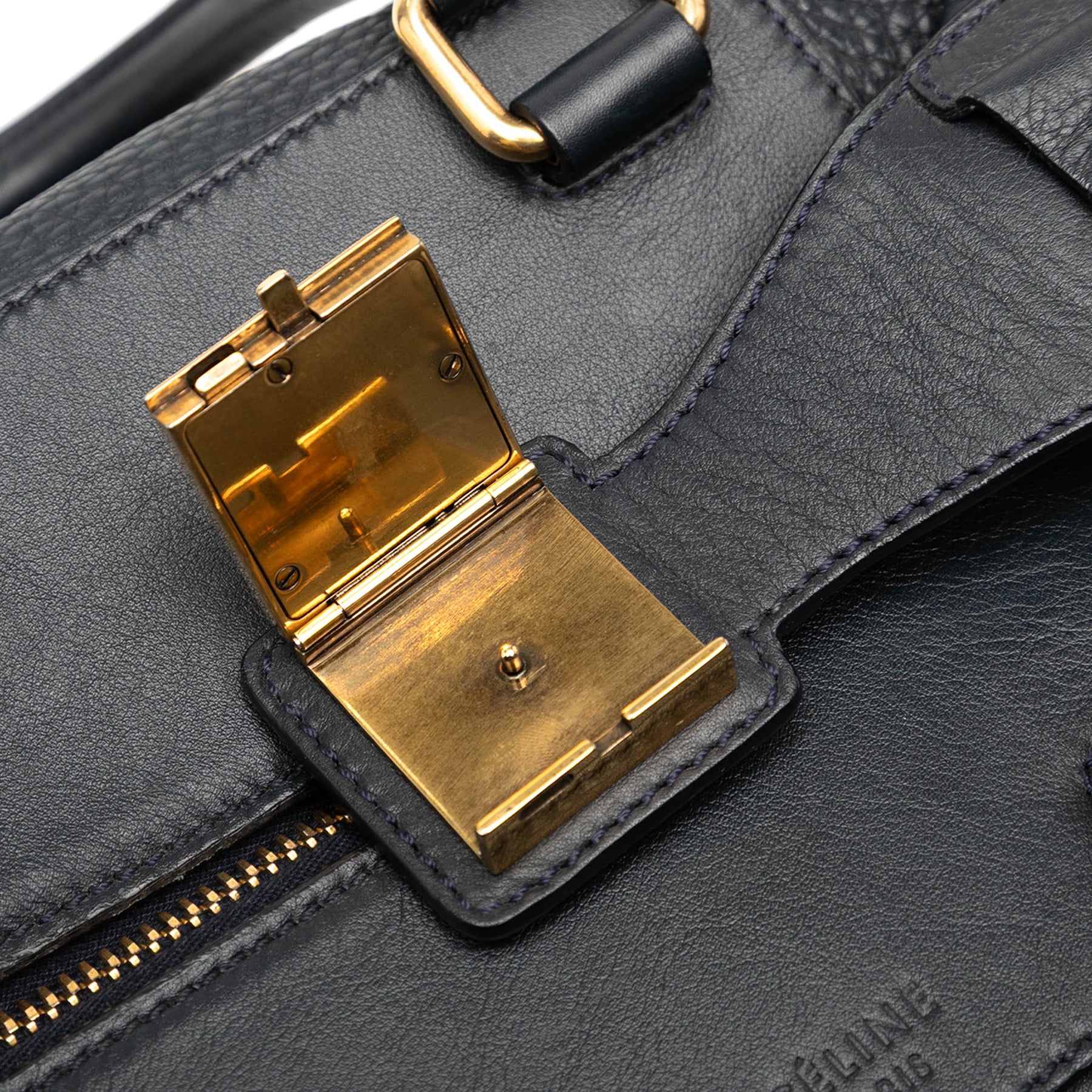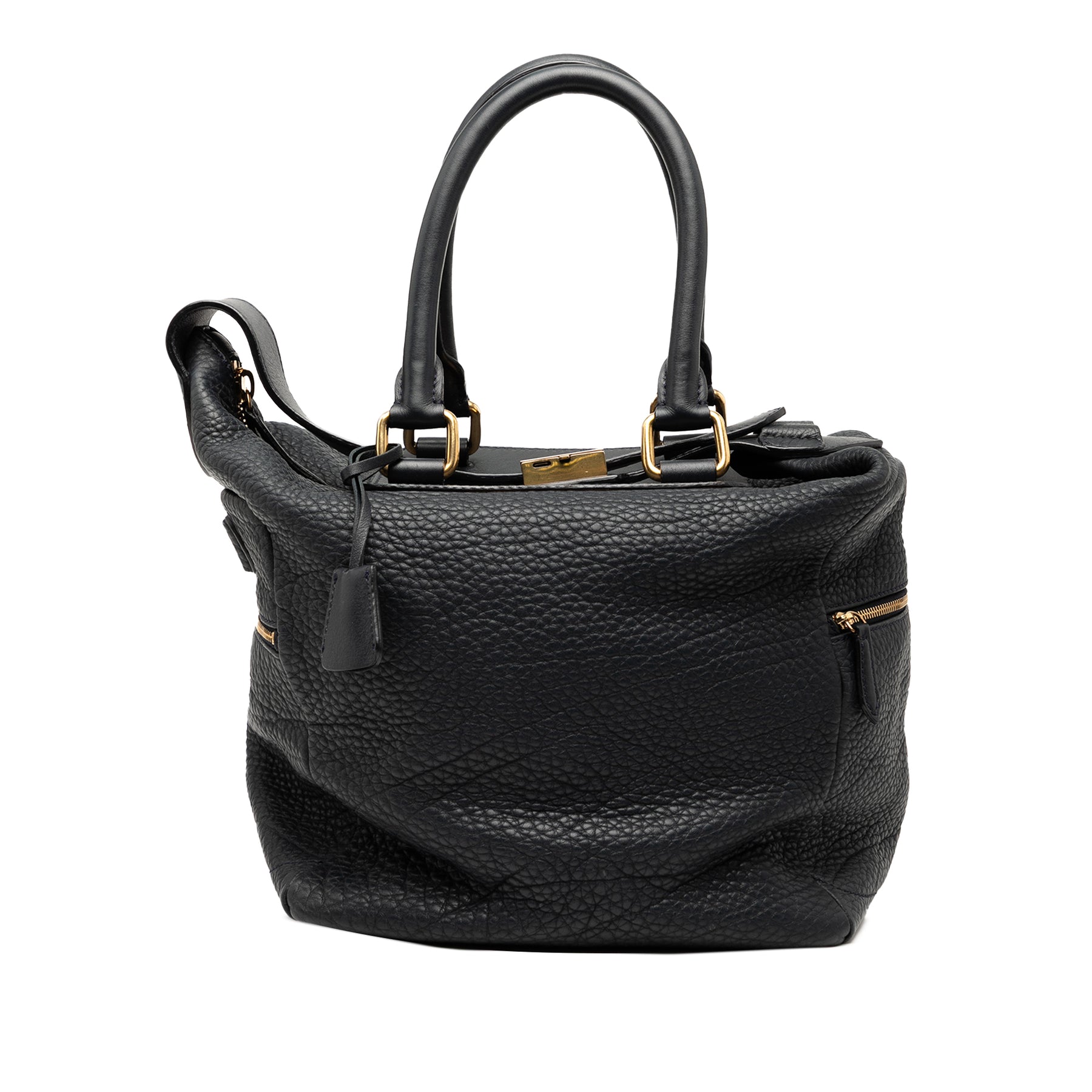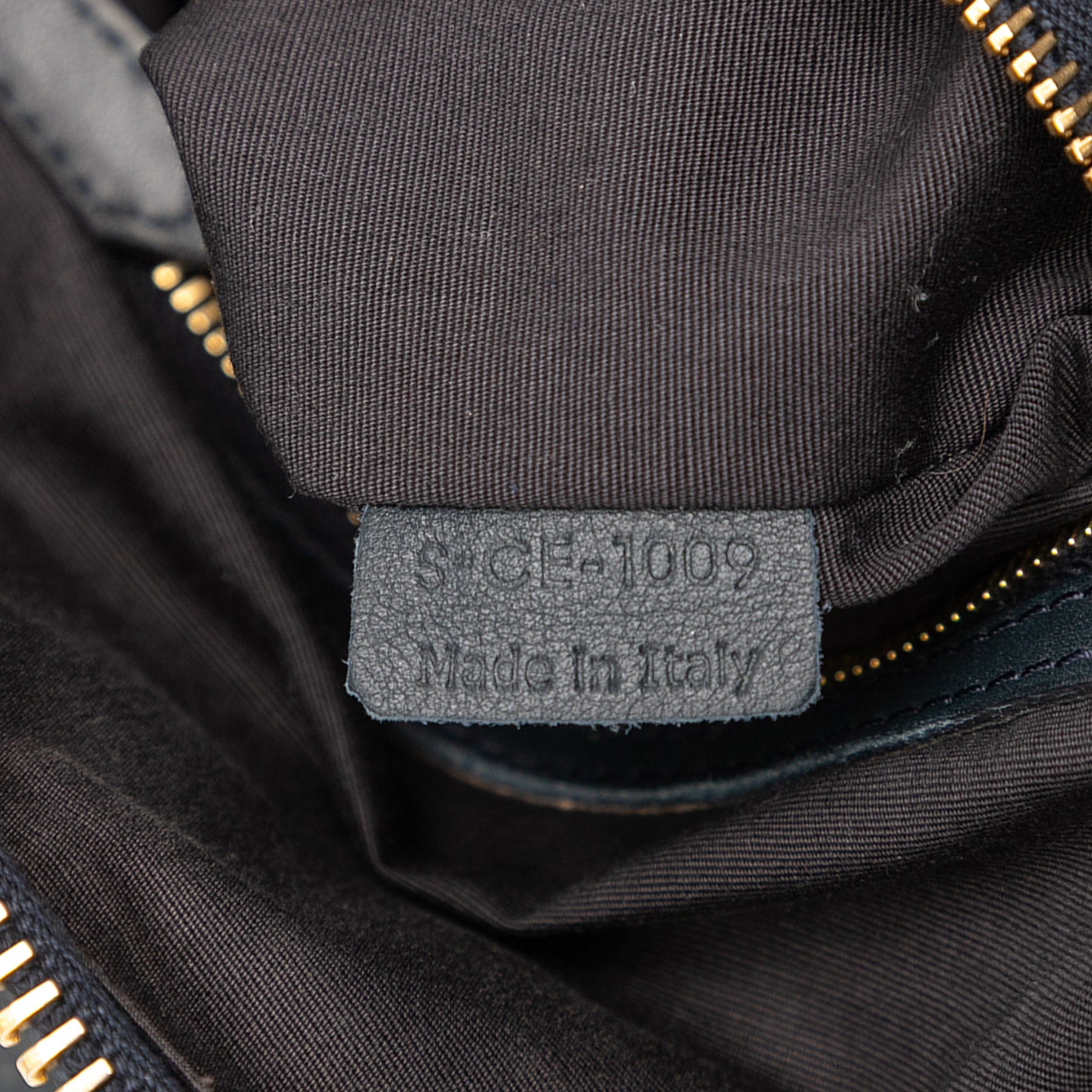Ce sac à main est en cuir et possède des poignées roulées, une bandoulière plate en cuir, une fermeture zippée sur le dessus, des poches extérieures zippées et des poches intérieures zippées et plaquées. Il est en bon état.