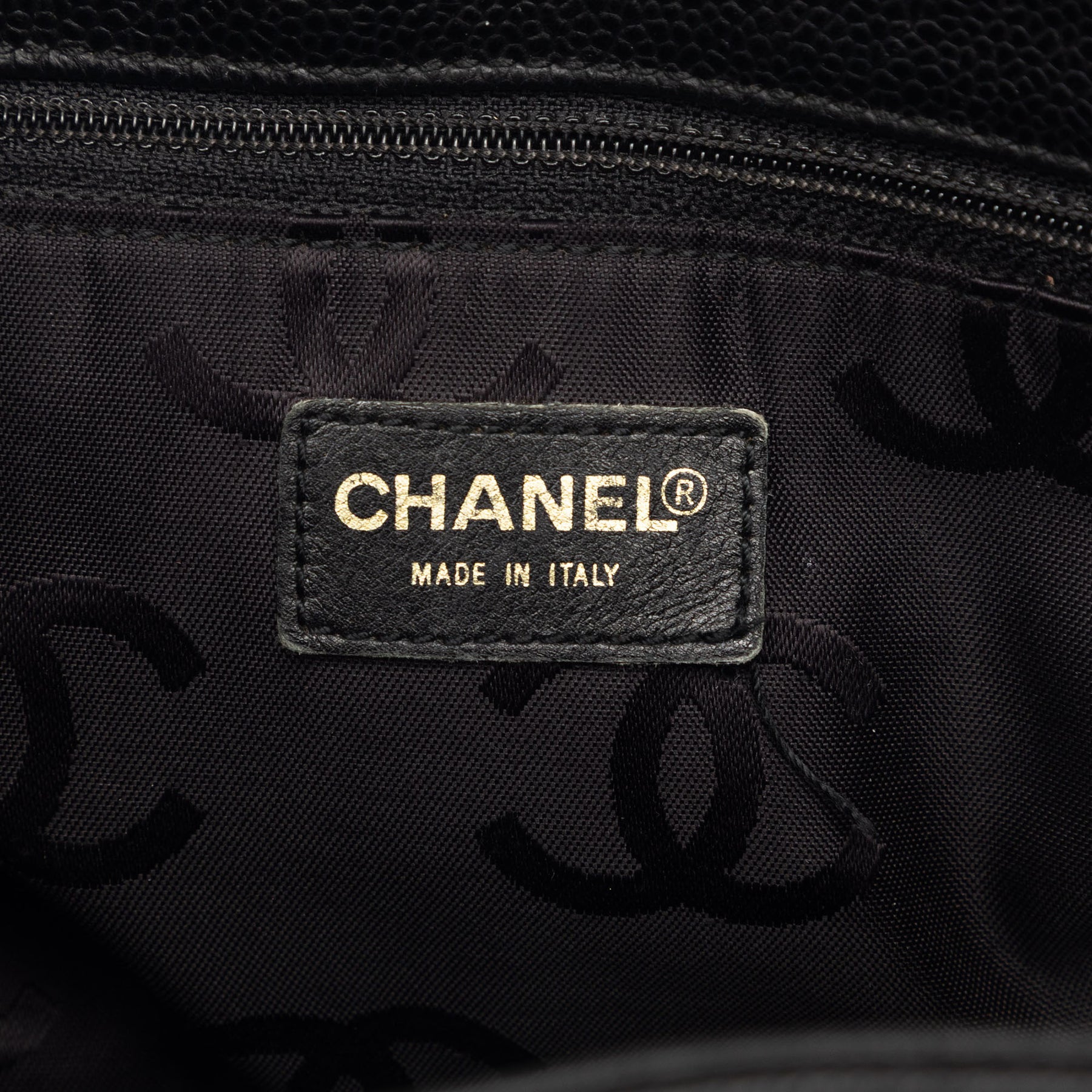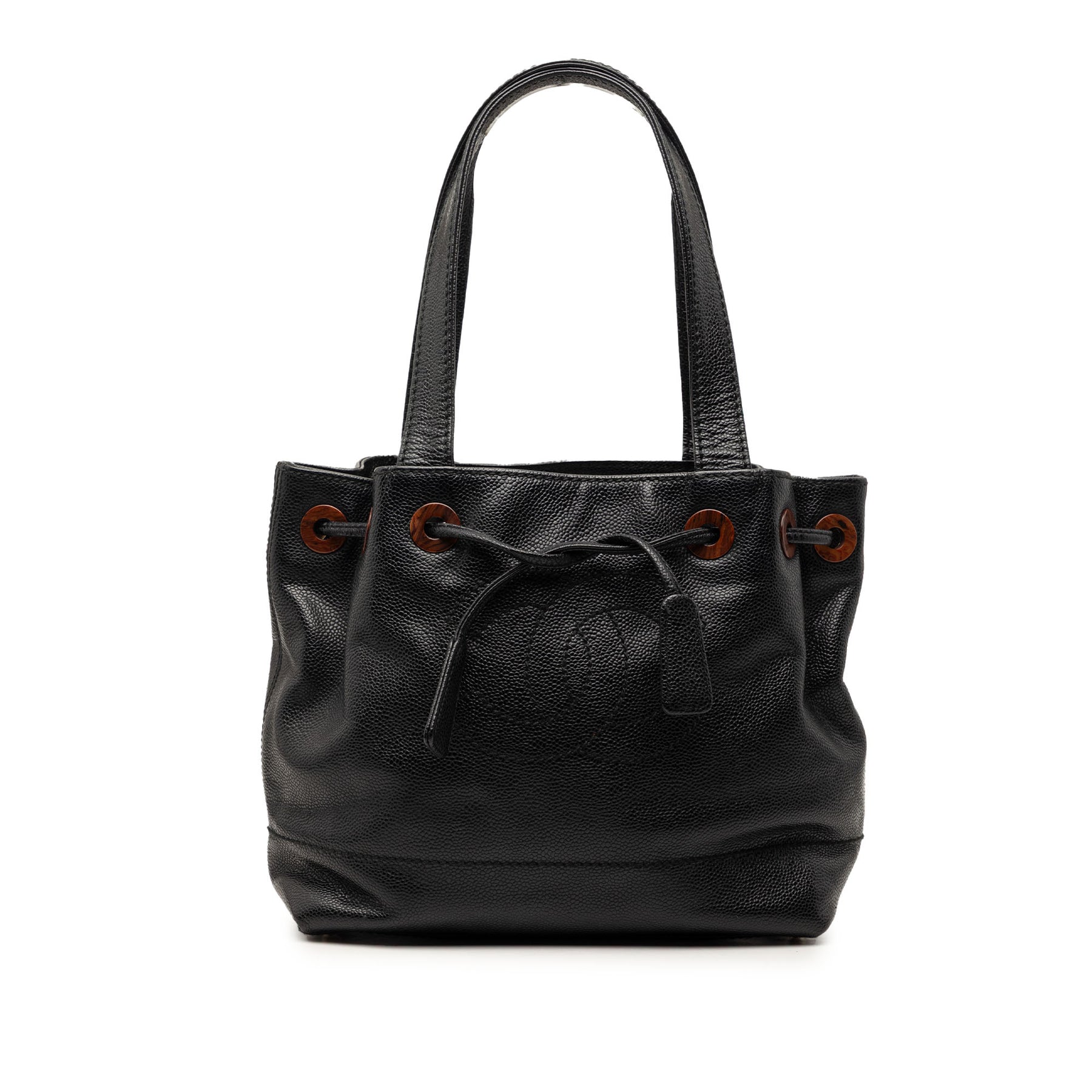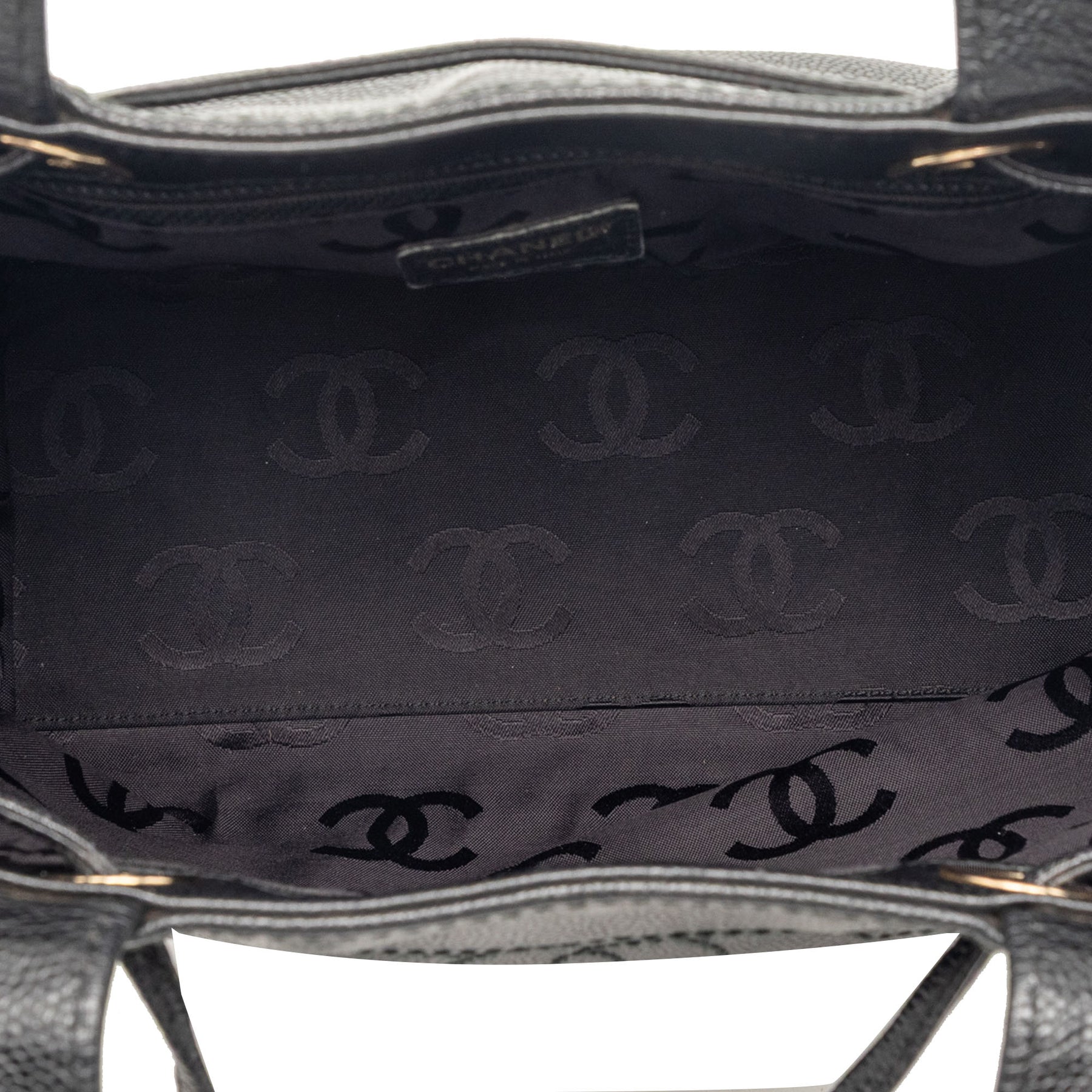 Ce sac cabas est en cuir caviar, possède des anses plates en cuir, une ouverture sur le dessus avec fermeture à cordon et une poche intérieure zippée. Il est en bon état.