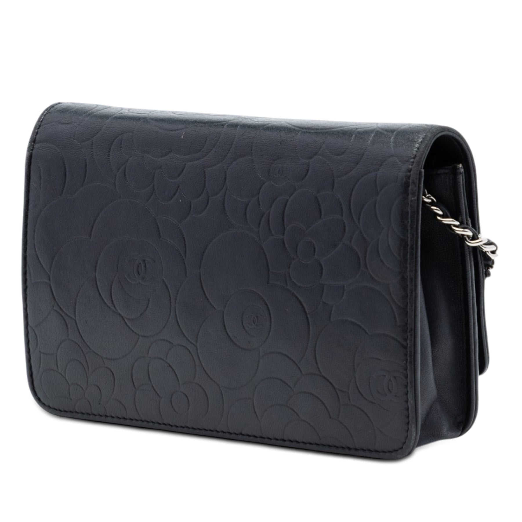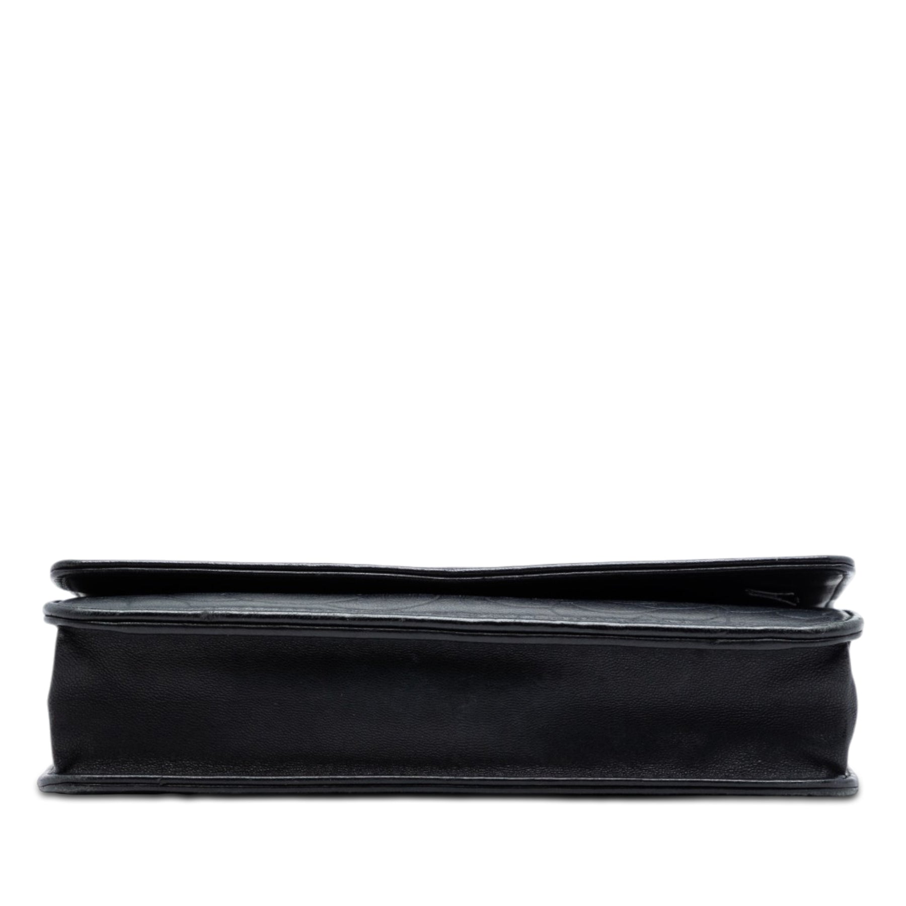 Ce portefeuille à chaîne est confectionné en cuir d'agneau matelassé et possède une bandoulière en chaîne tressée de cuir, un rabat à fermeture magnétique, ainsi que des poches intérieures zippées et plaquées. Il est en bon état.