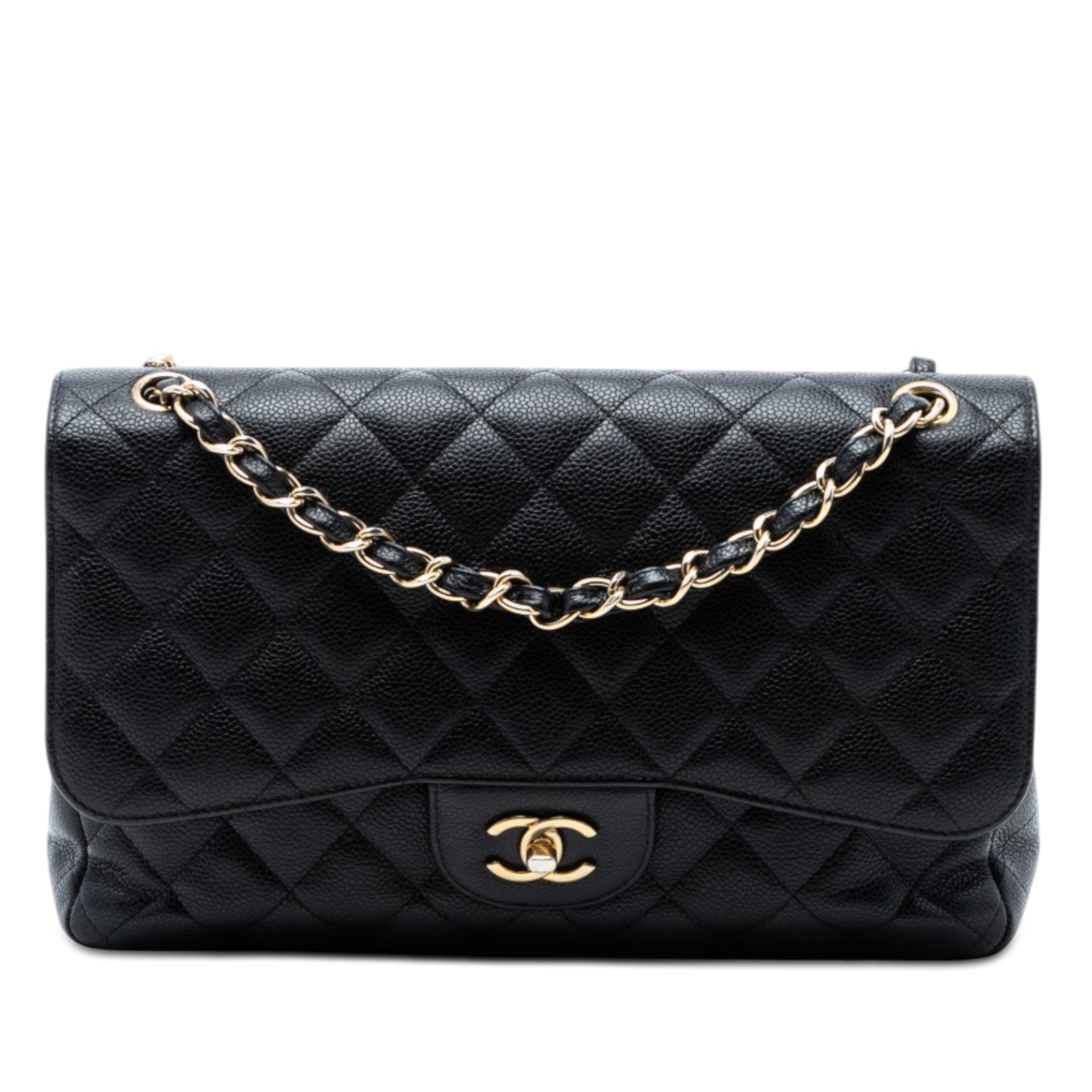 Ce sac bandoulière est confectionné en cuir caviar matelassé et possède une bandoulière en chaîne tressée couleur or, un double rabat avec fermoir CC, une poche plaquée extérieure au dos, ainsi que des poches intérieures zippées et plaquées. Il est en bon état.
