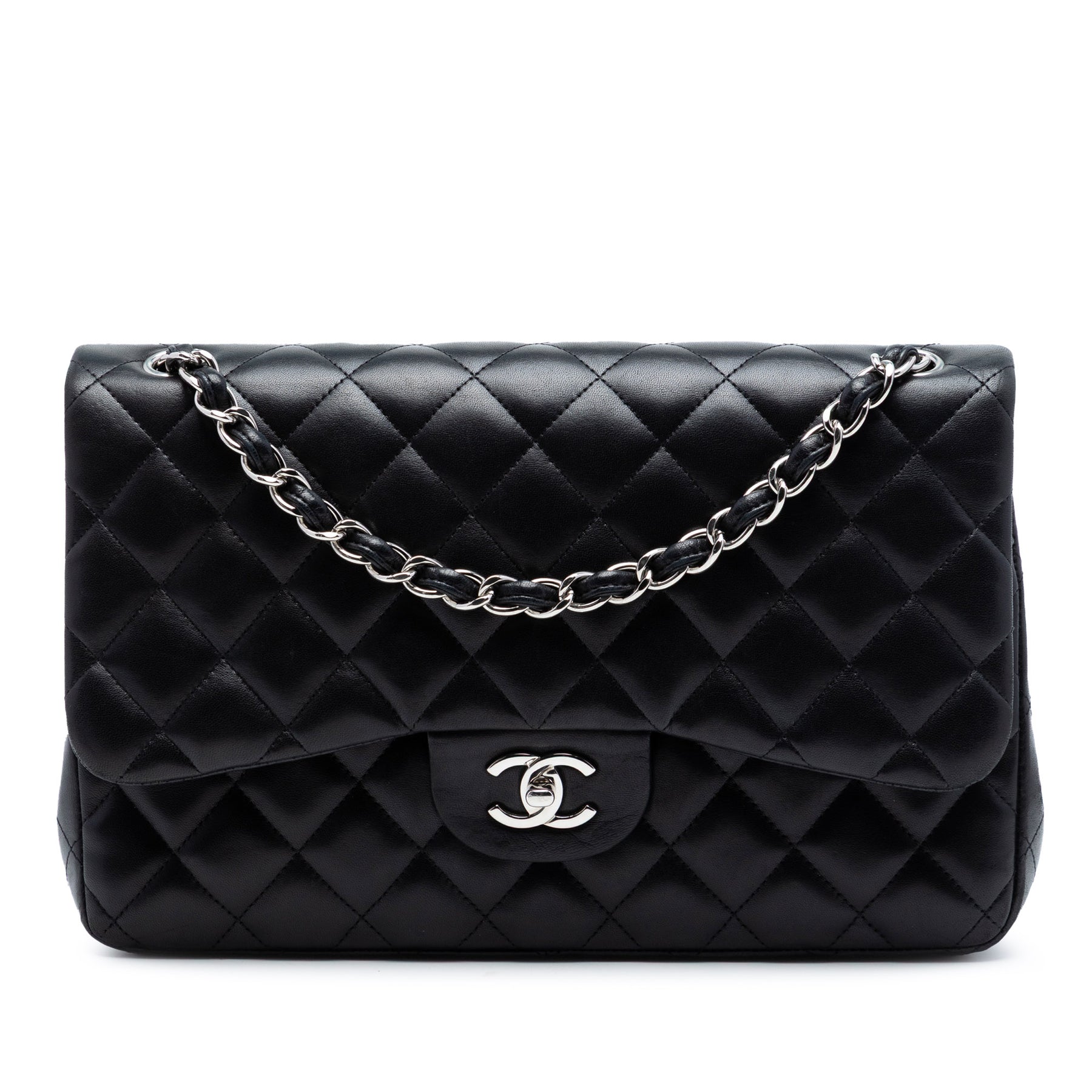 Ce sac bandoulière est confectionné en cuir d'agneau matelassé et possède une bandoulière en chaîne tressée de cuir, un double rabat avant avec fermoir CC, une poche plaquée extérieure au dos, ainsi que des poches intérieures zippées et plaquées. Il est en bon état.