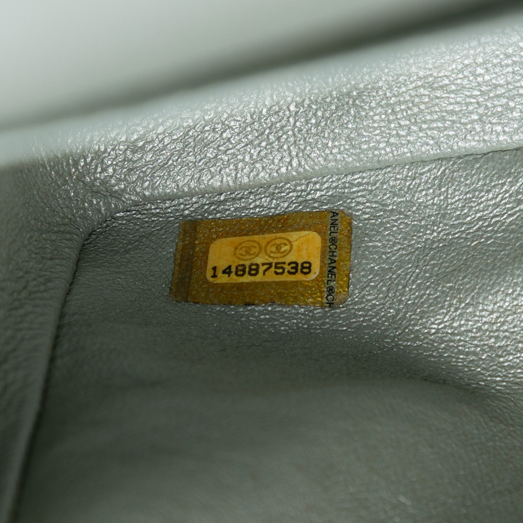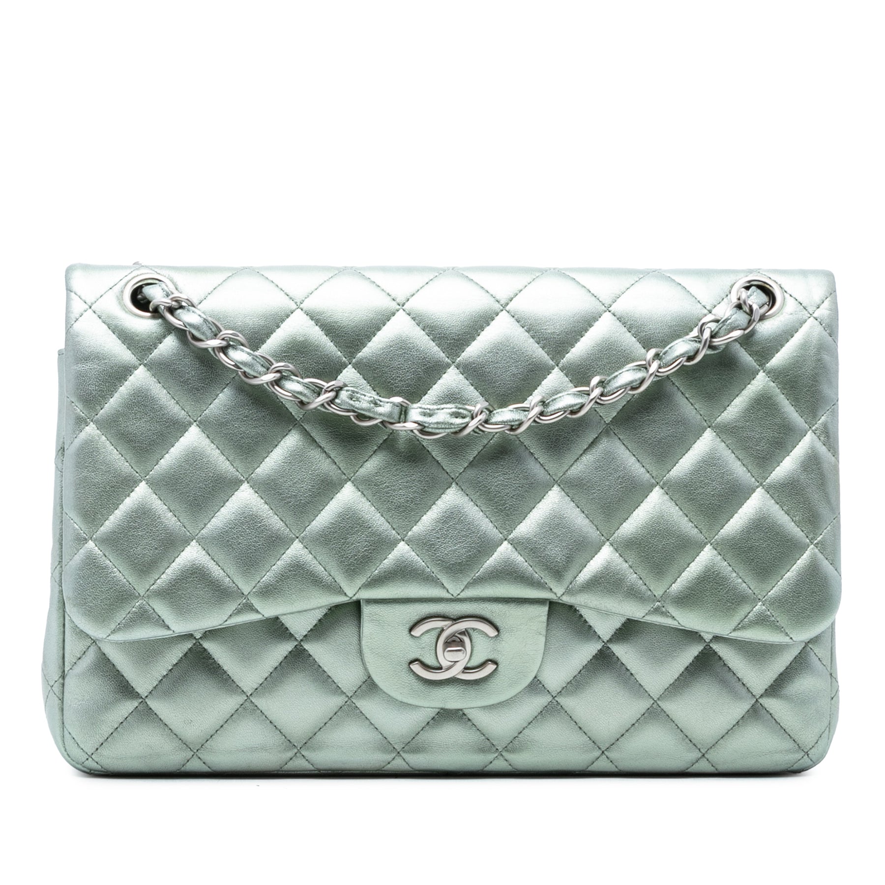 Le sac Classic Flap est confectionné en cuir d'agneau métallisé matelassé et présente une bandoulière en chaîne tressée, un double rabat avec fermoir CC, une poche plaquée extérieure au dos, ainsi que des poches intérieures zippées et plaquées. Le dos a été repeint. Il est en bon état.