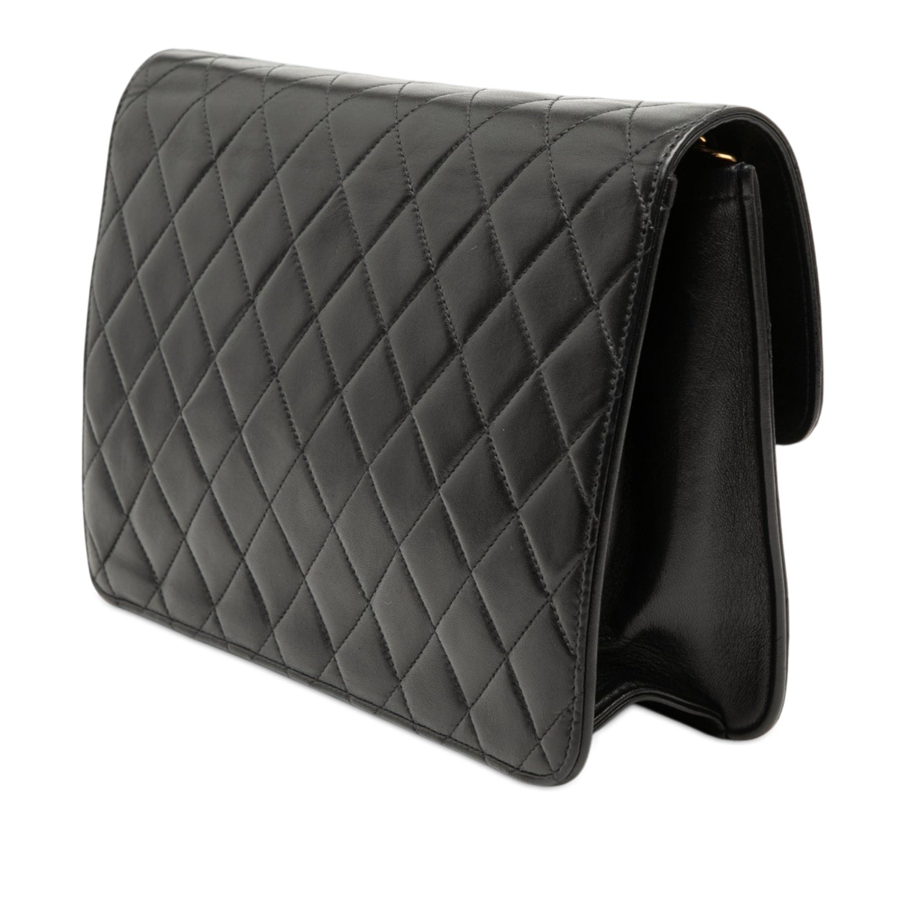 Ce sac bandoulière est confectionné en cuir d'agneau matelassé et possède une bandoulière en chaîne tressée, un rabat avant avec fermoir CC, ainsi qu'une poche intérieure zippée et des poches plaquées. Il est en bon état.