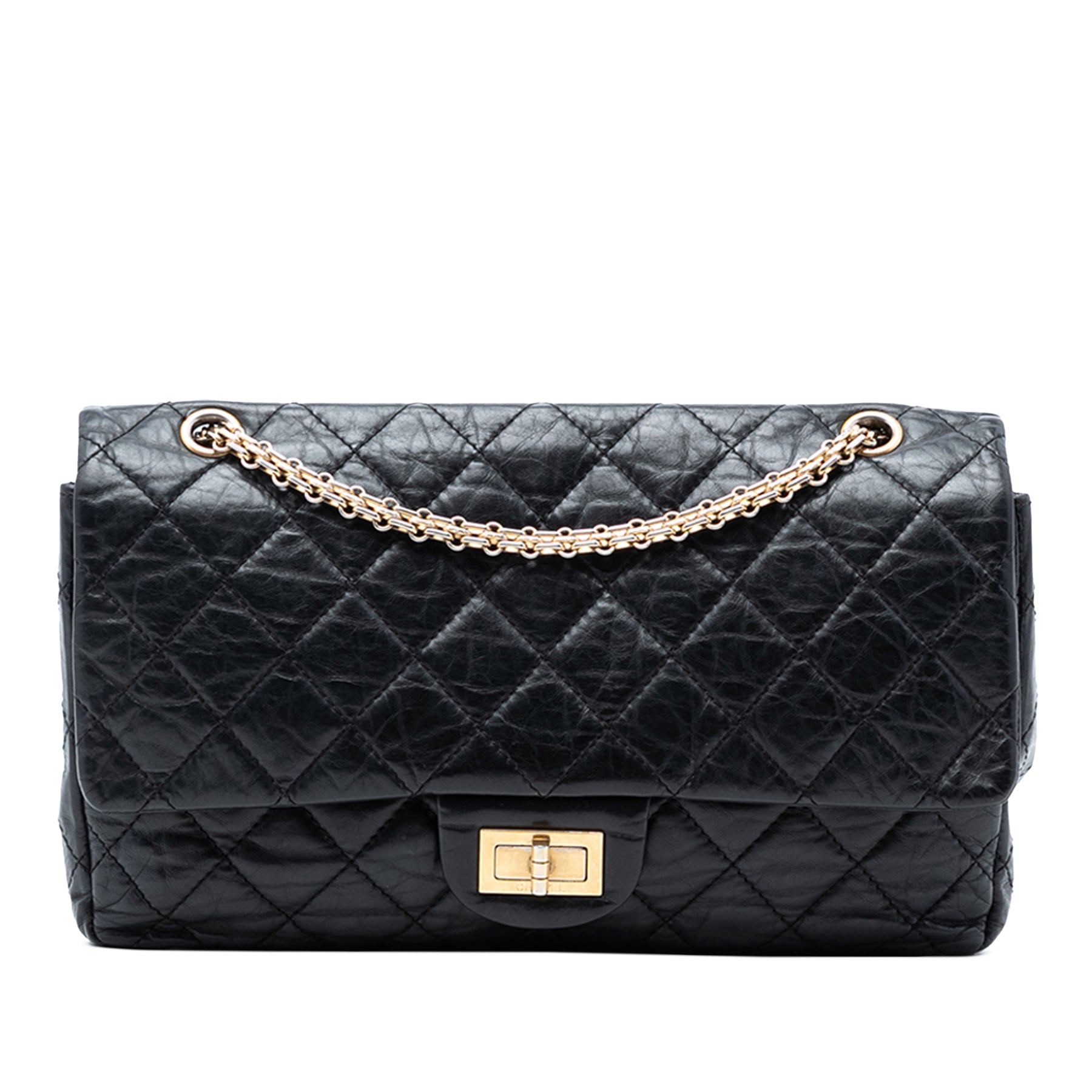 Ce sac bandoulière est confectionné en cuir de veau vieilli et possède une bandoulière chaîne dorée, un double rabat avant avec fermeture à tourniquet, une poche plaquée extérieure au dos, ainsi que des poches intérieures zippées et plaquées. Il est en bon état.