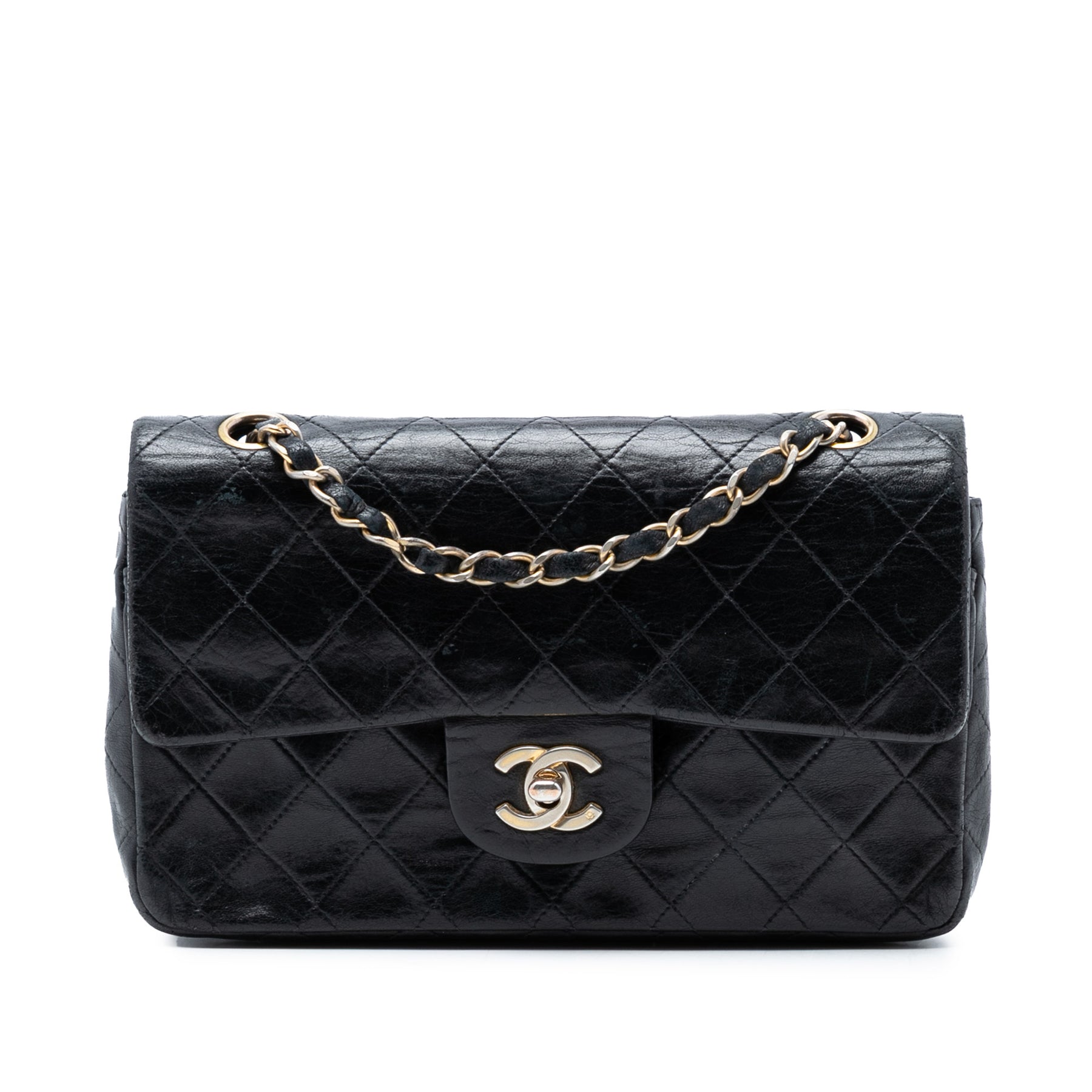 Ce sac bandoulière est confectionné en cuir d'agneau matelassé et possède une bandoulière en chaîne tressée de cuir, un double rabat avant orné du double C entrelacé et d'une fermeture à tourniquet, une poche plaquée extérieure au dos et des poches plaquées intérieures. Il est en bon état.