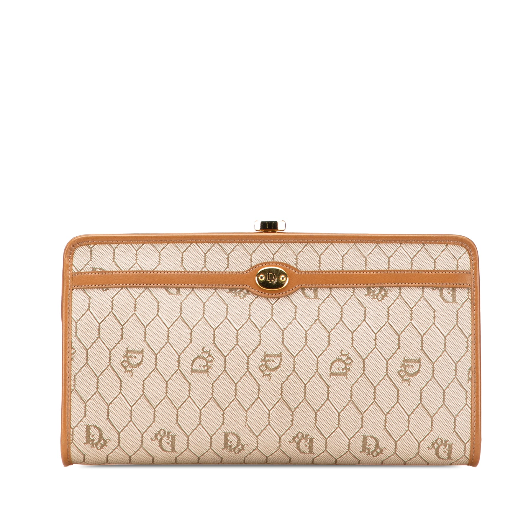 Cette pochette est en toile enduite avec des finitions en cuir et une fermeture à fermoir baiser. Elle est en bon état.