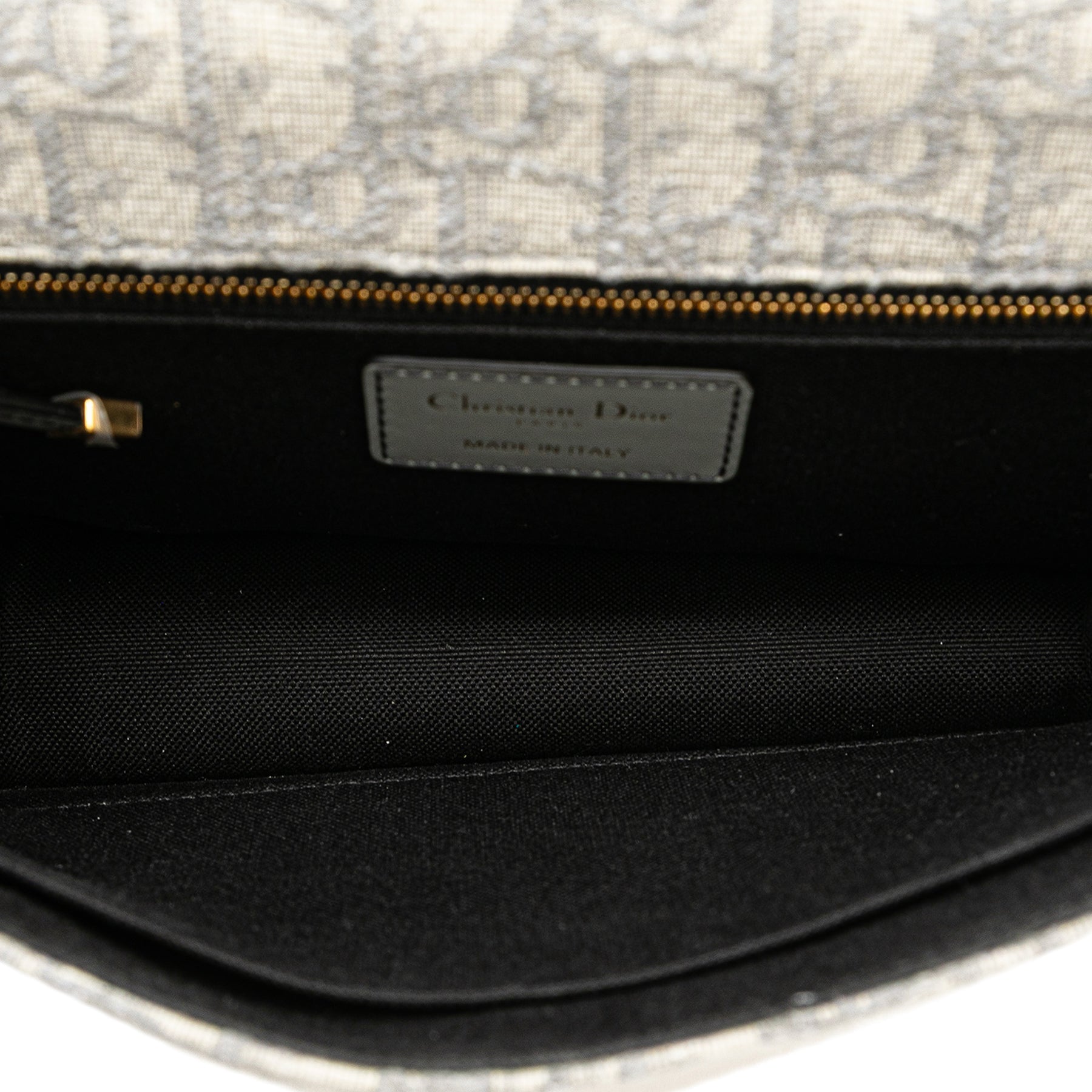 Ce sac bandoulière est en toile avec finitions en cuir, une bandoulière plate réglable en cuir, un rabat à fermoir, une poche extérieure plaquée au dos et des poches intérieures zippées et plaquées. Il est en bon état.