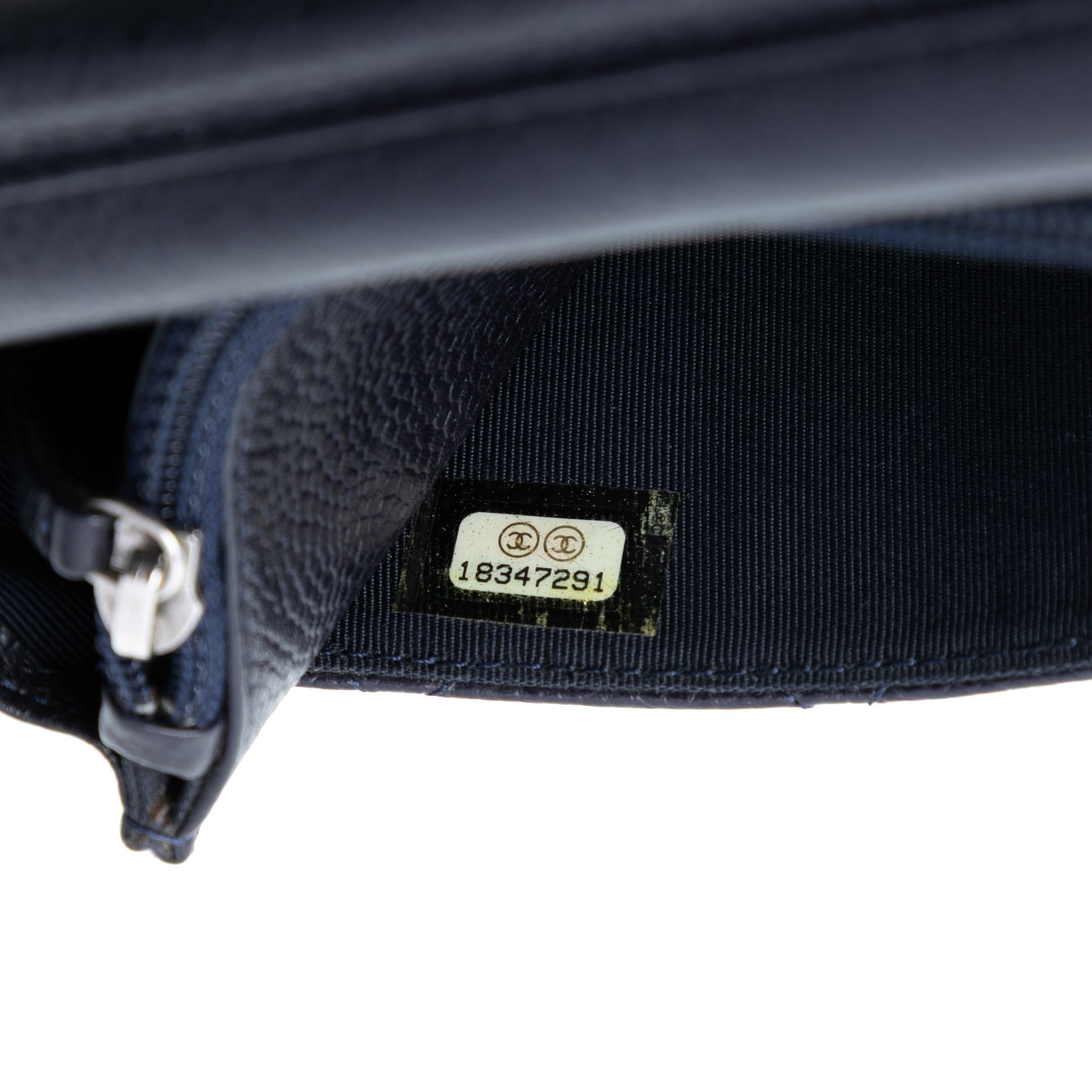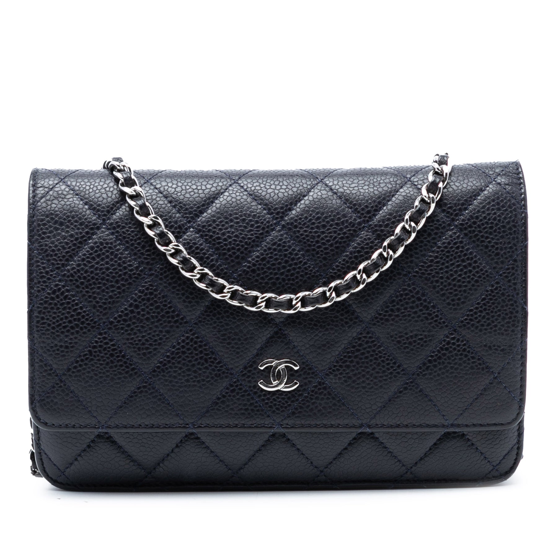 Ce portefeuille à bandoulière chaîne est confectionné en cuir caviar matelassé et possède une bandoulière chaîne argentée tressée, un rabat avant à fermeture magnétique, un compartiment intérieur zippé et des poches intérieures plaquées. Il est en bon état.