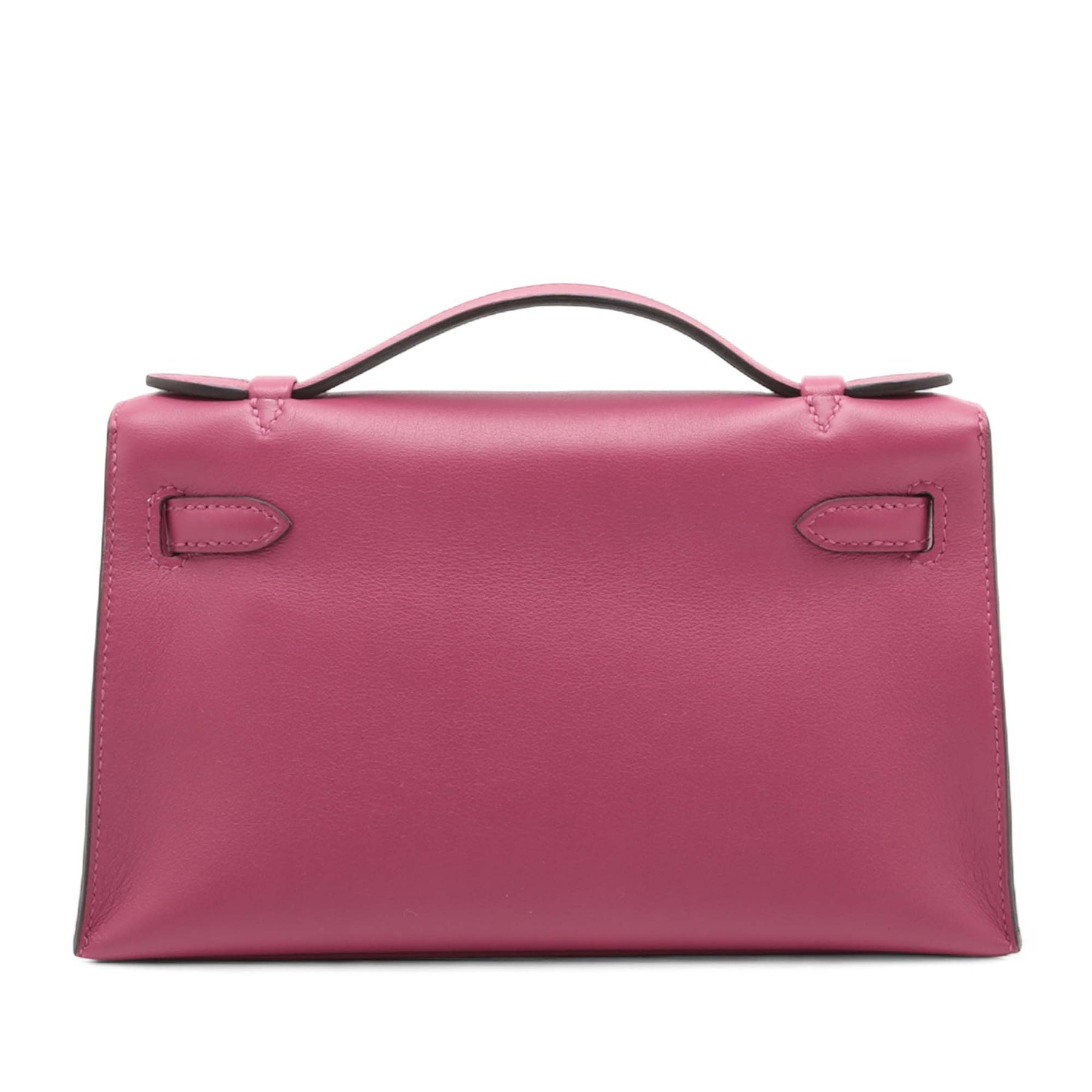 Cette pochette Kelly en cuir Swift couleur Rose Pourpre est dotée d'une anse plate, d'un rabat avant avec fermoir pivotant, de finitions argentées et d'une poche intérieure plaquée. Elle est en excellent état.