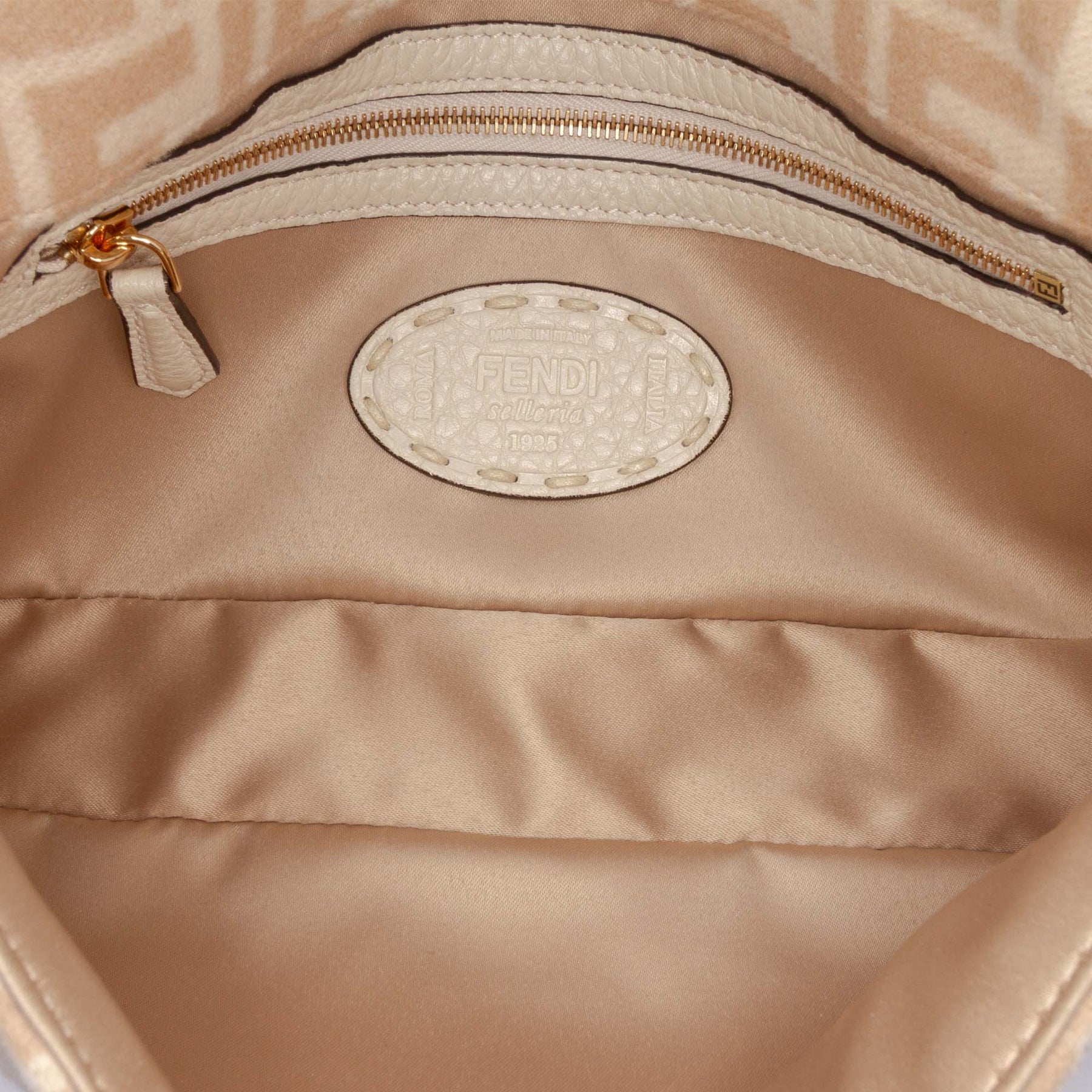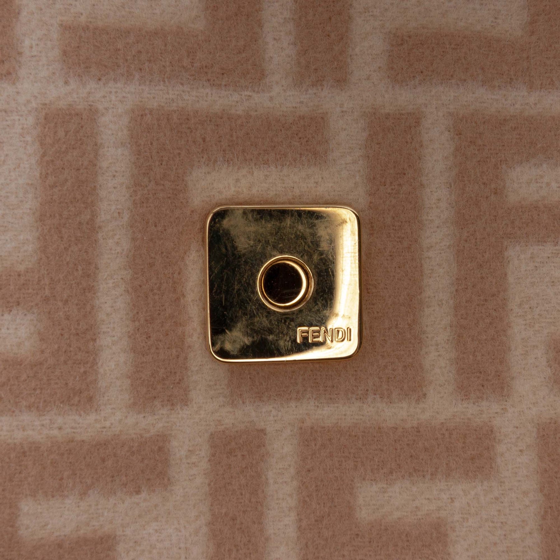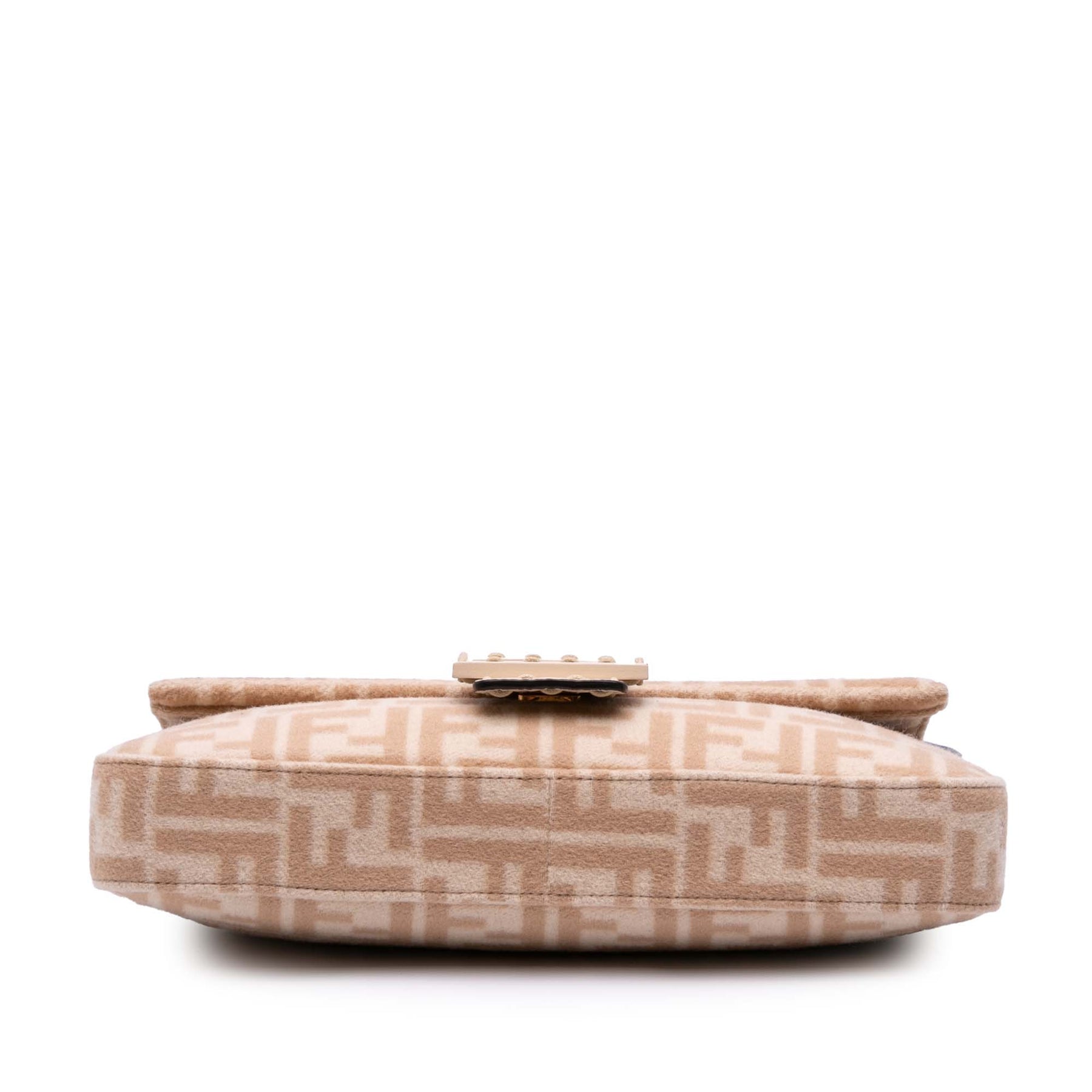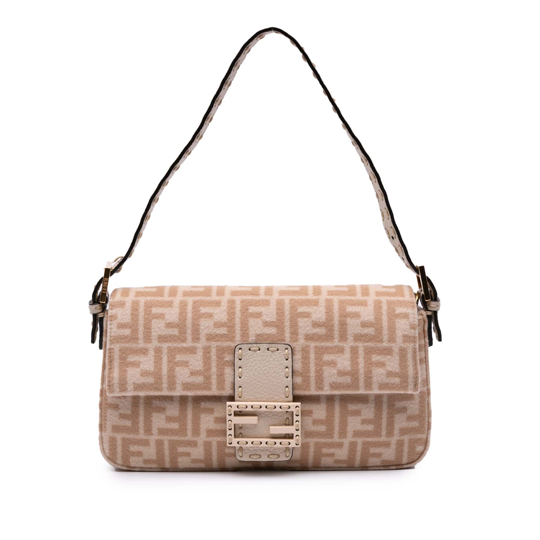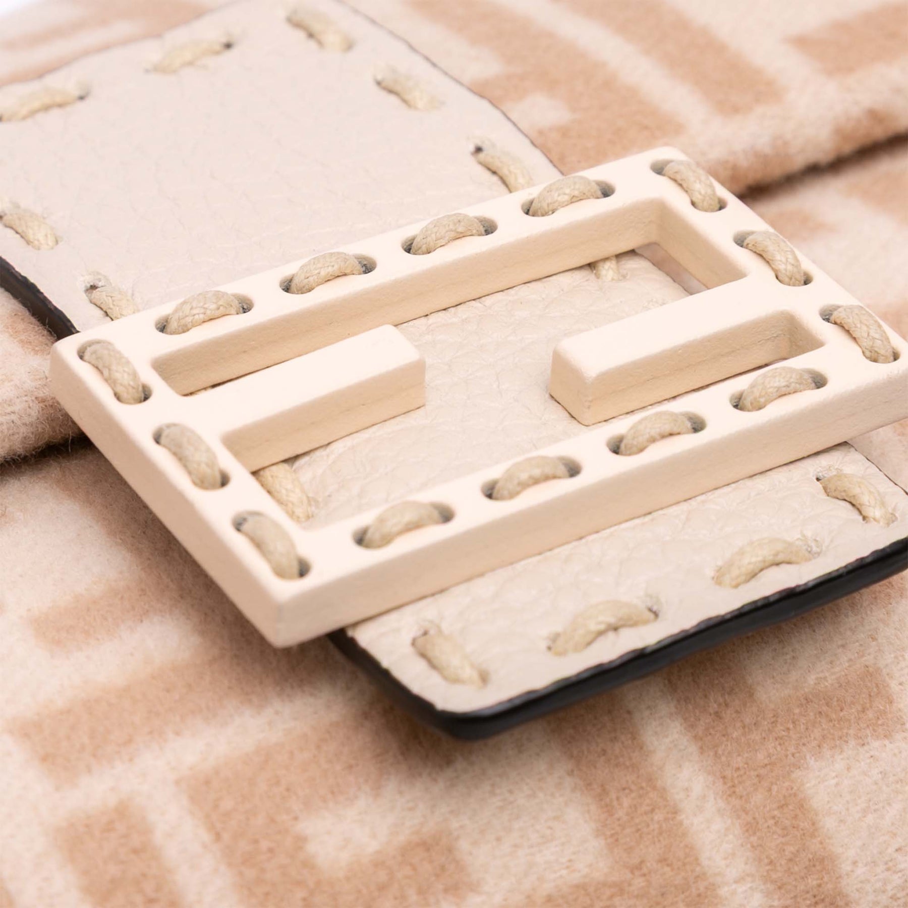 Le sac Baguette est en laine, possède une bandoulière plate en cuir, un rabat avant avec une fermeture magnétique et une sangle, ainsi qu'une poche intérieure zippée. Il est en bon état.