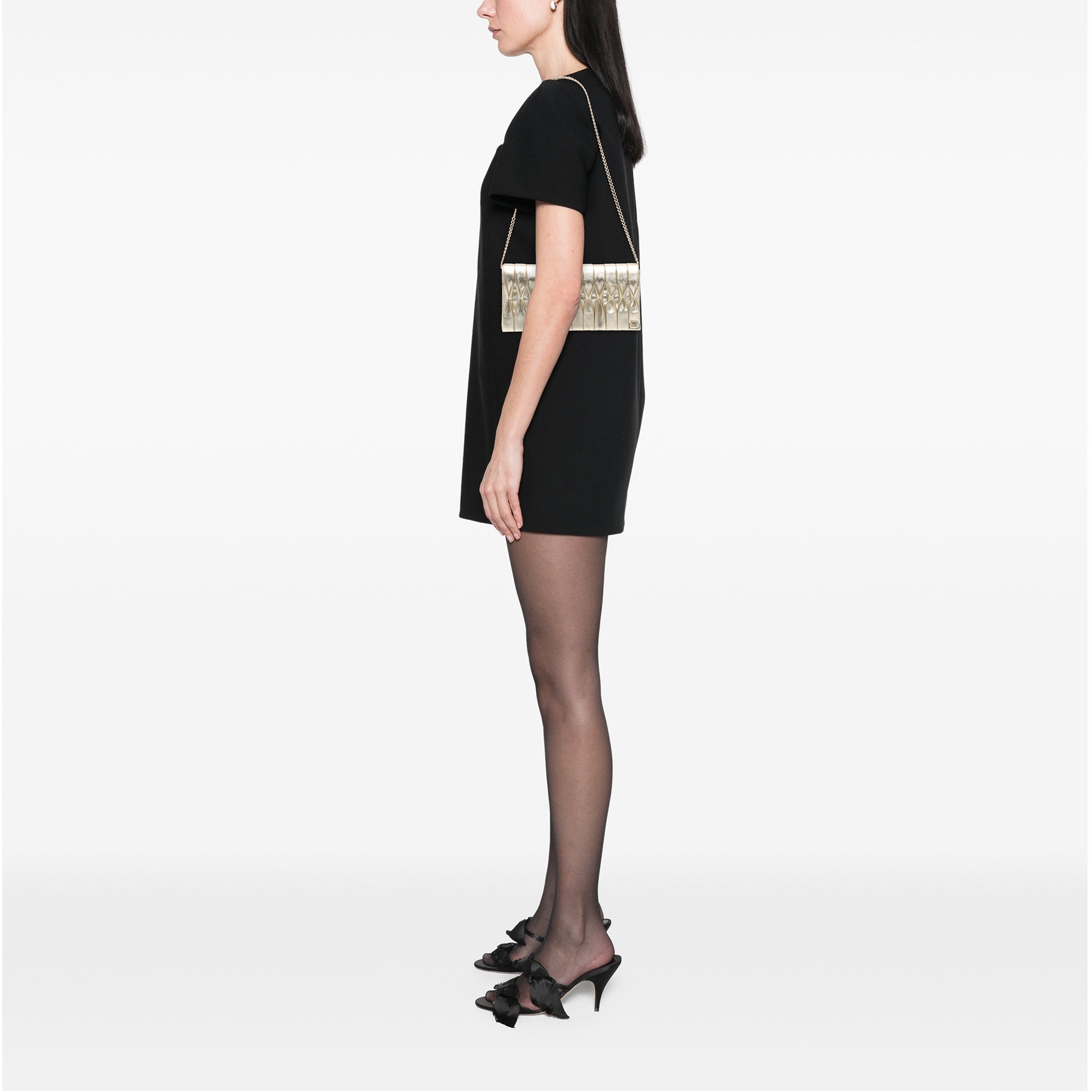 Ce sac bandoulière est doté d'un corps en cuir d'agneau métallisé, d'une bandoulière chaîne dorée, d'un rabat avant à fermeture magnétique et de poches intérieures. Il est en bon état.