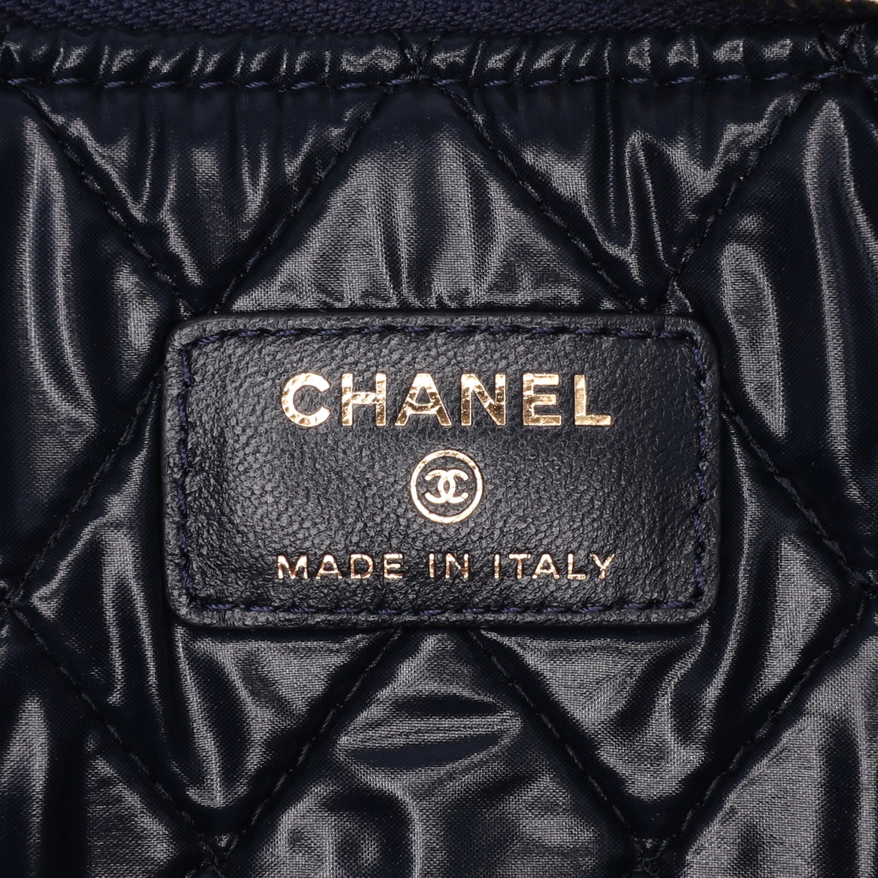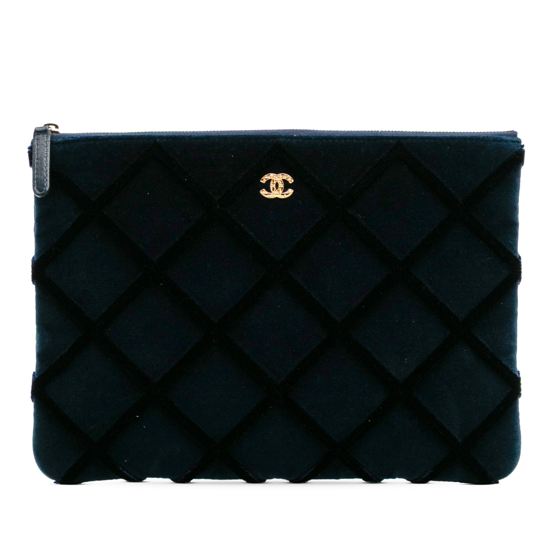 Cette pochette est en velours matelassé et dotée d'une fermeture éclair sur le dessus. Son état est excellent.