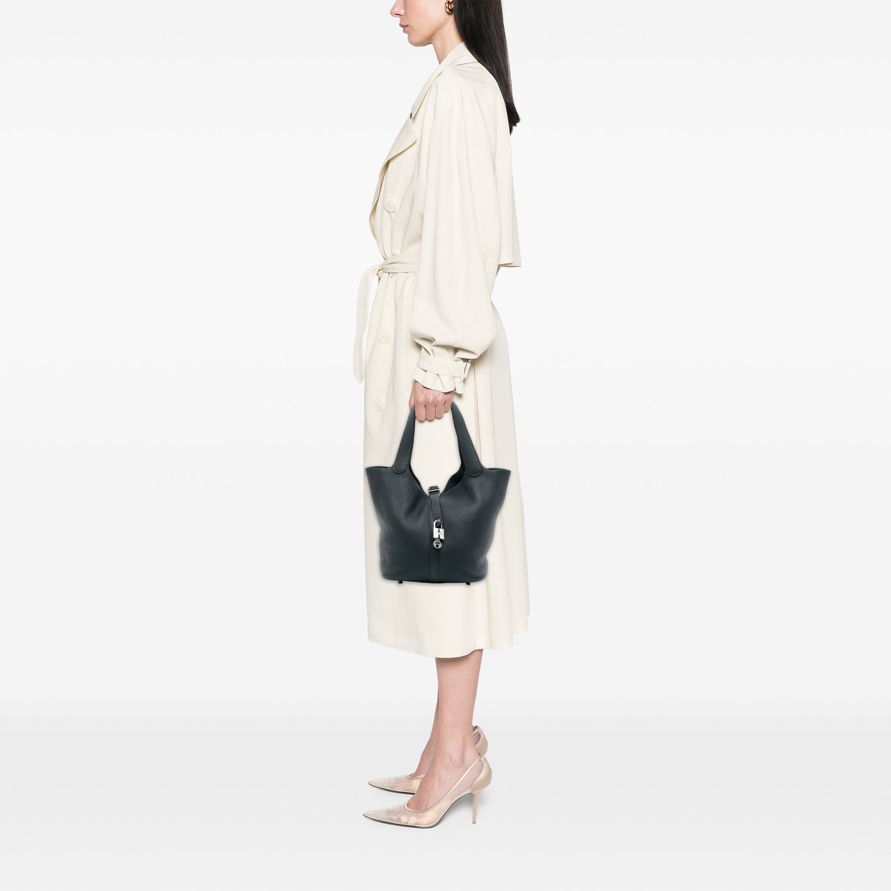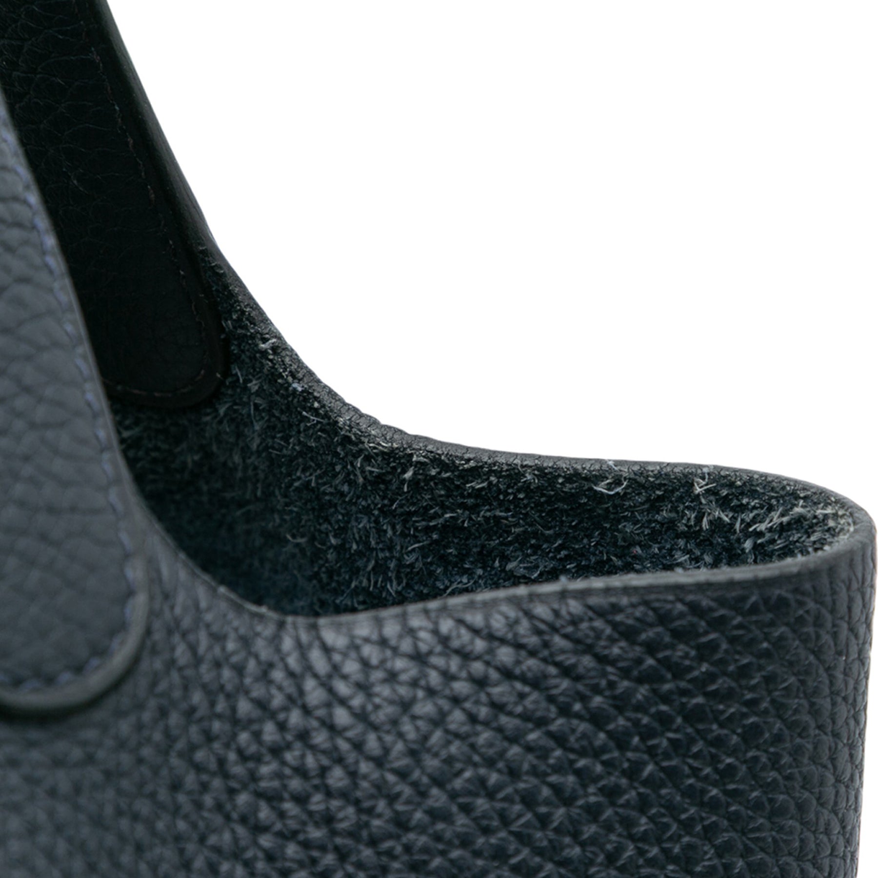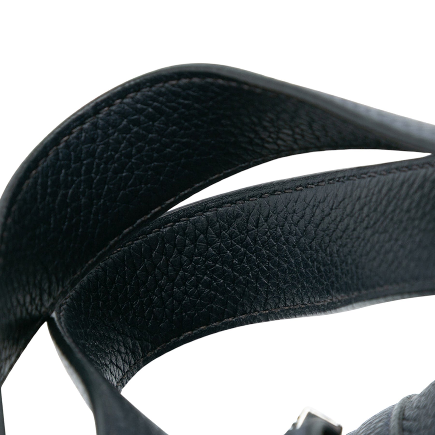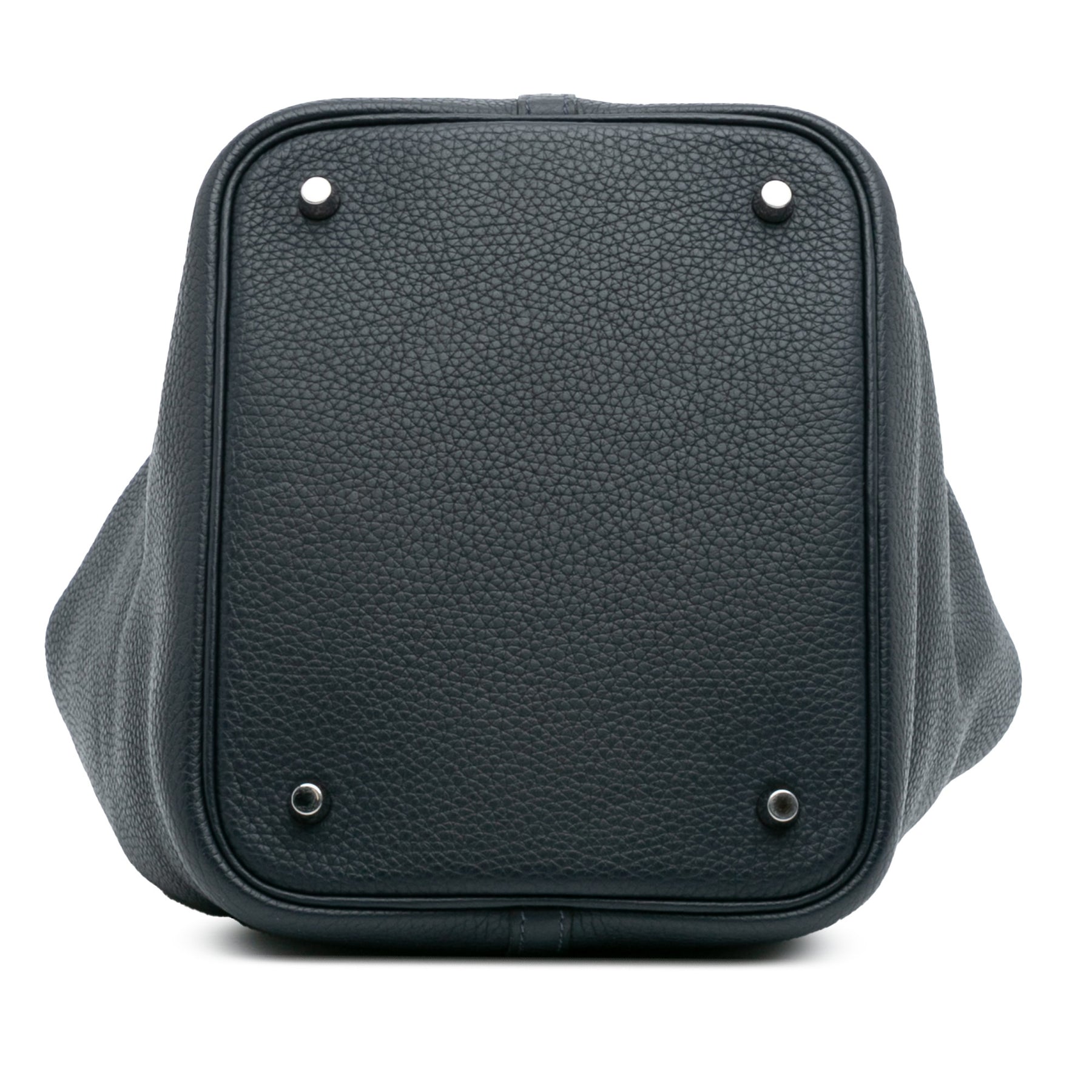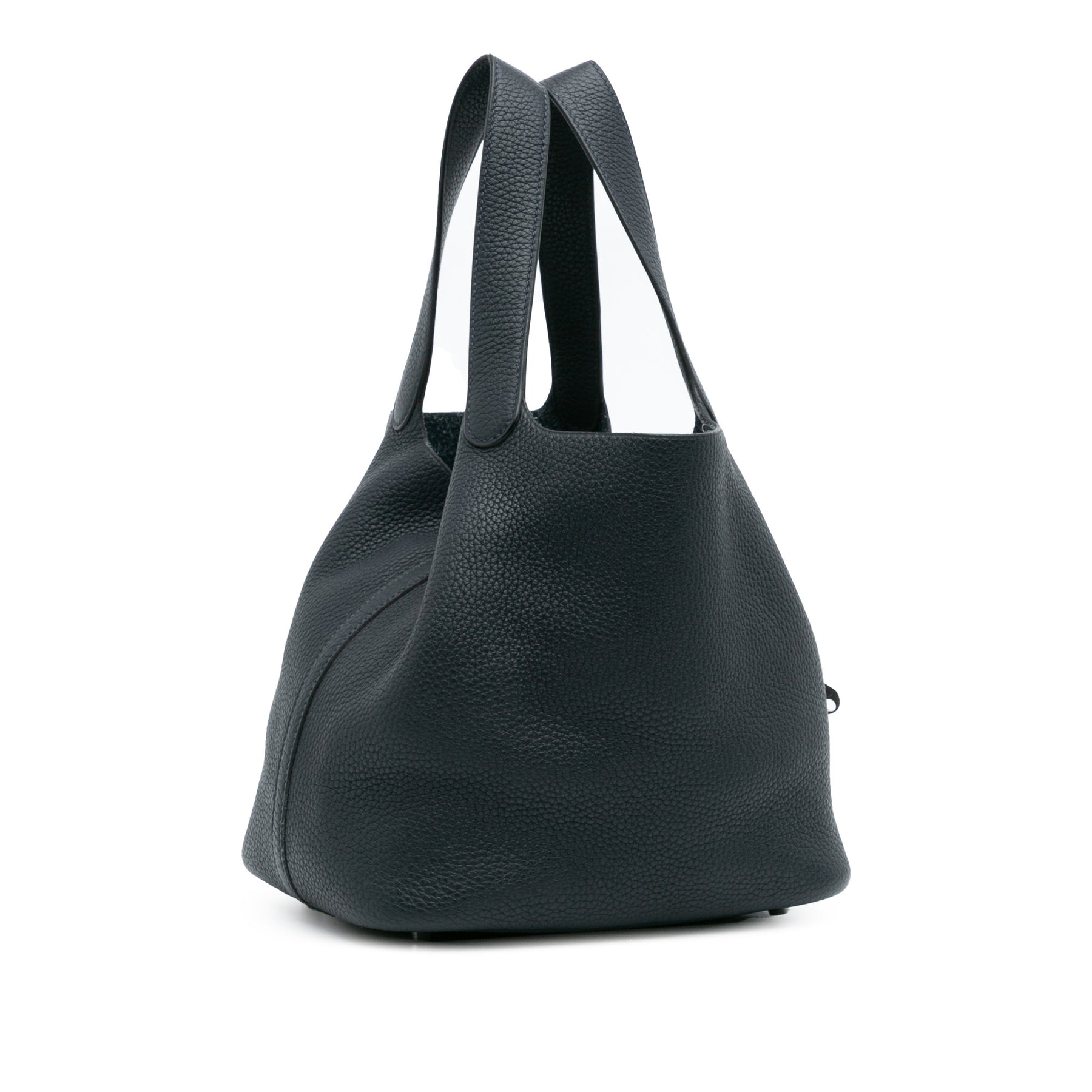 Le Picotin 22 est doté d'un corps en cuir Clémence, de poignées plates et d'un dessus ouvert avec une sangle plate et une fermeture à cadenas. Les sangles ont été repeintes. Son état est bon.