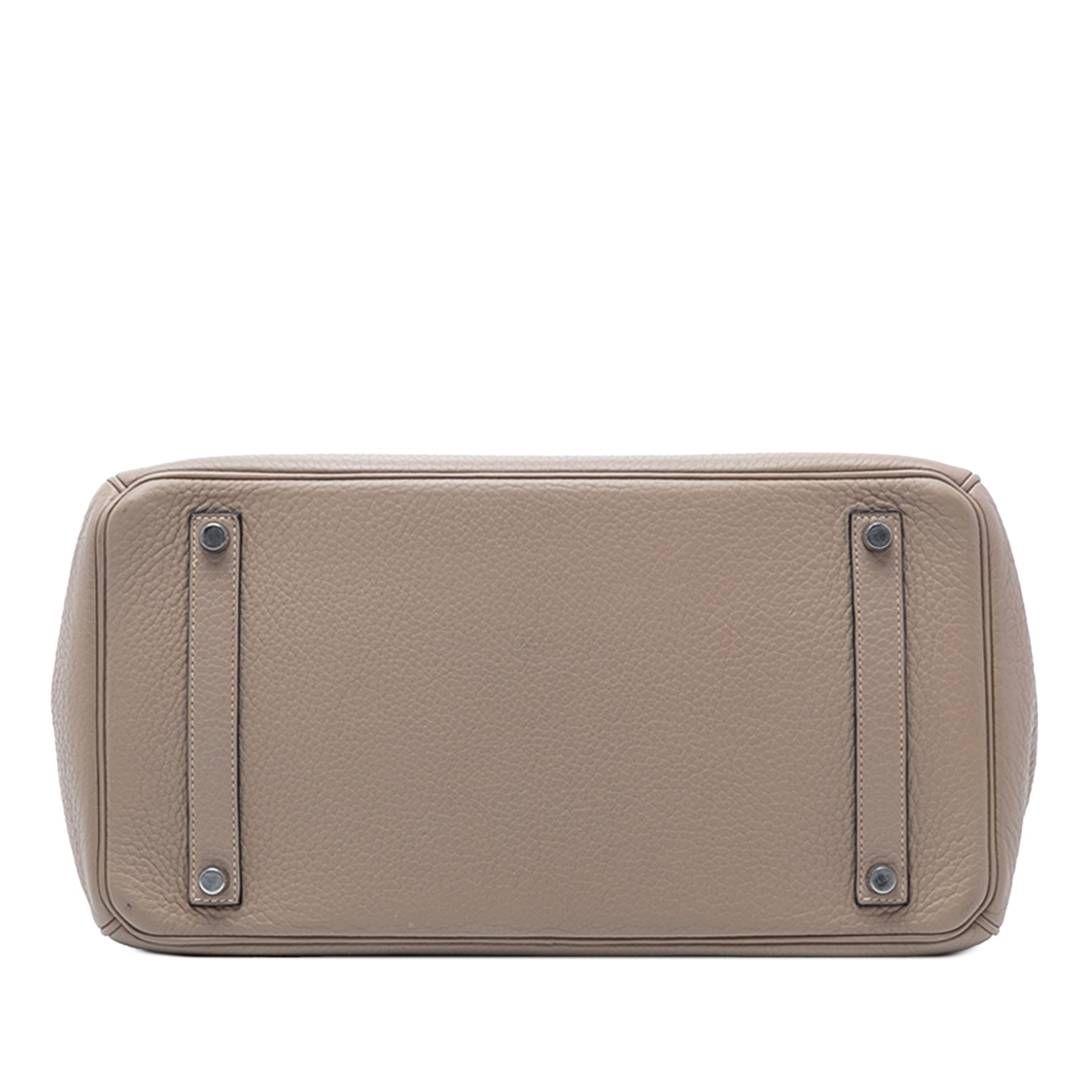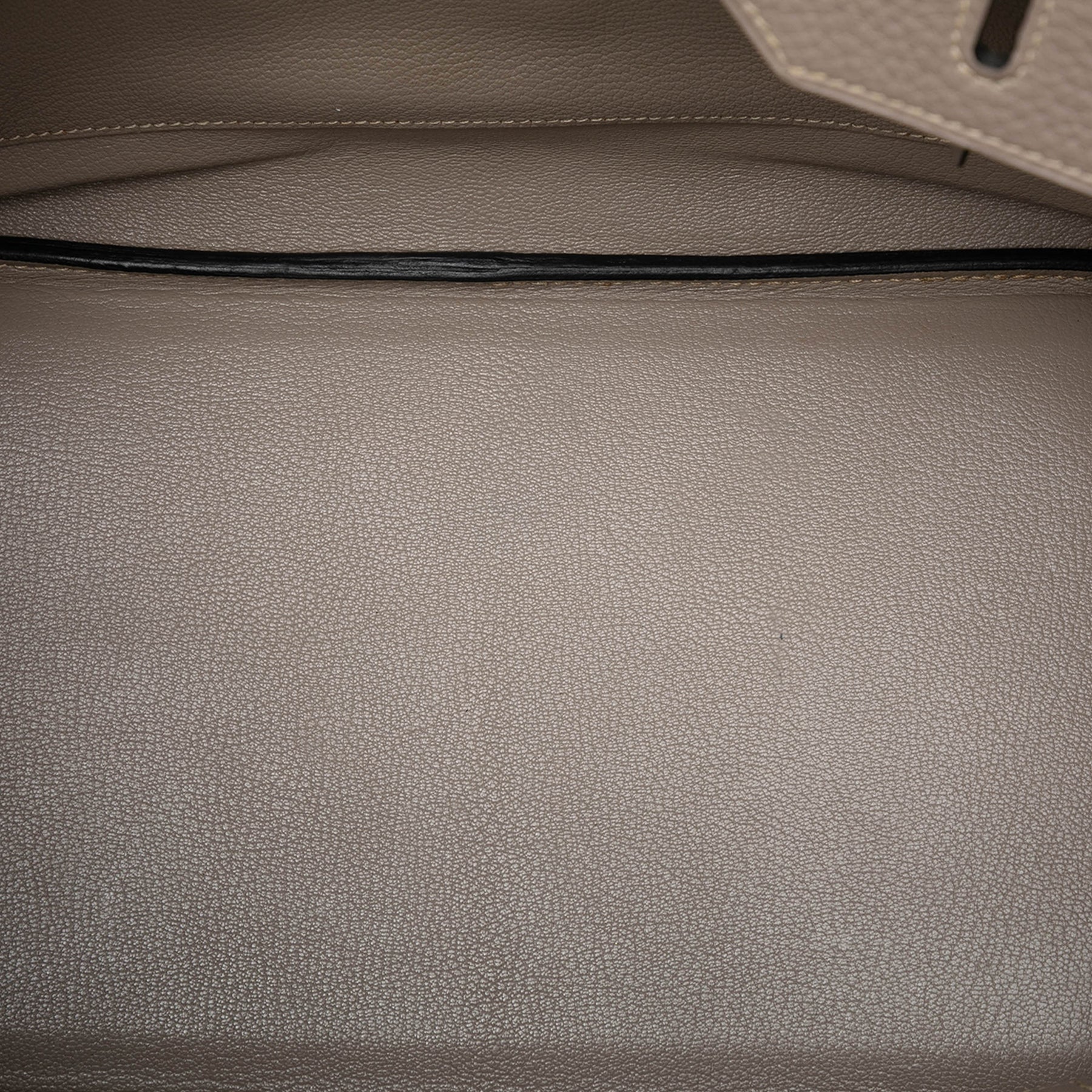 Le Birkin 35 est confectionné en cuir Togo gris asphalte, possède des anses roulées, un rabat avant avec fermoir tourniquet et des poches intérieures plaquées et zippées. Les coins extérieurs ont été repeints. Il est en bon état.