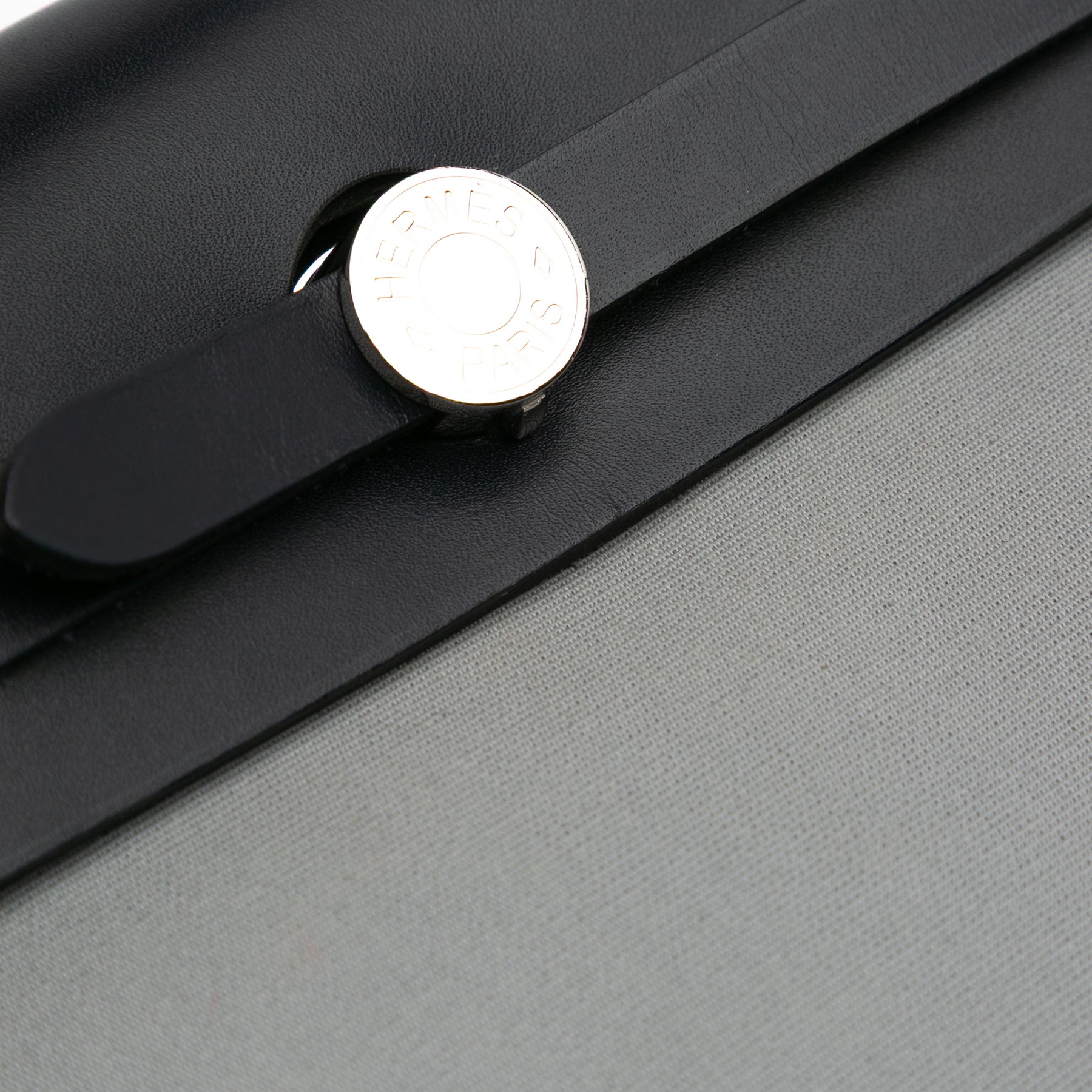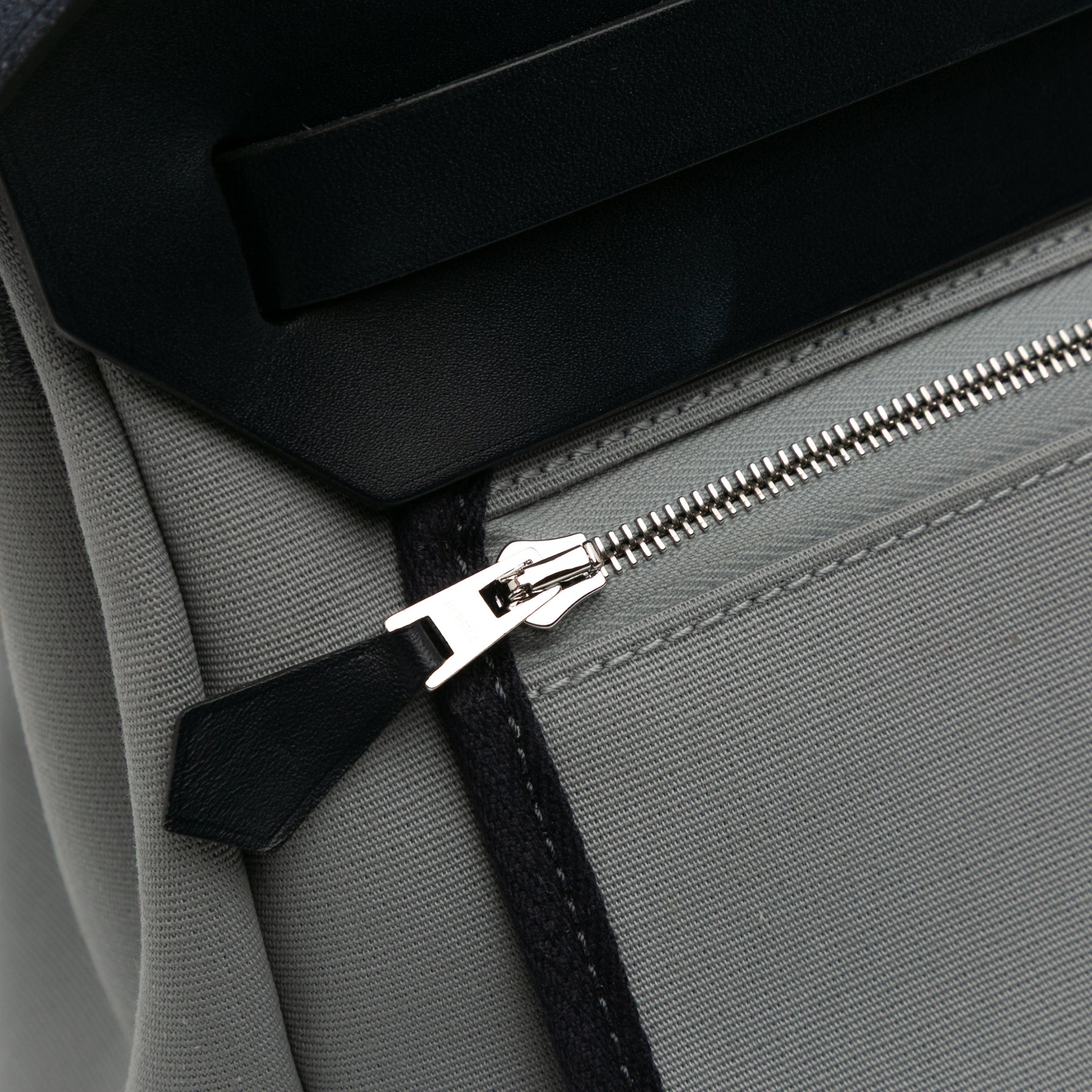 Le Herbag Zip est doté d'un corps en toile avec bordure en cuir, d'une poignée supérieure plate en cuir, d'une bandoulière plate en cuir, d'un rabat supérieur avec fermeture à glissière, d'une poche arrière extérieure zippée et d'une pochette intérieure zippée amovible. Il est en bon état.