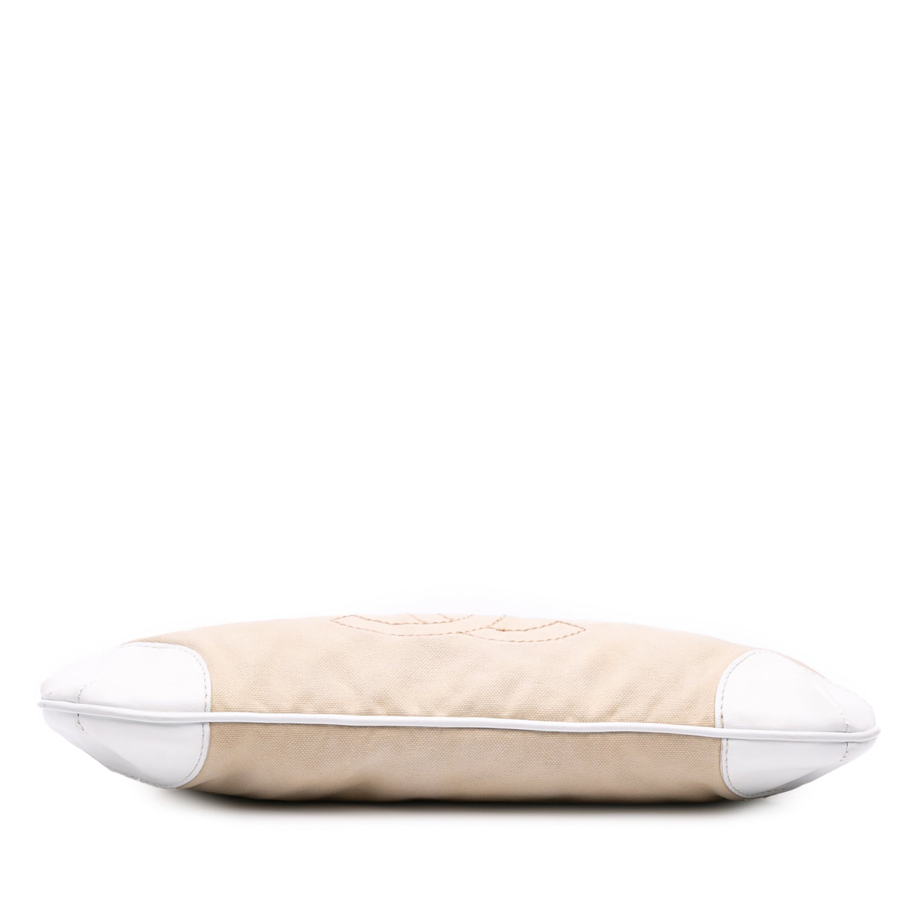Ce sac bandoulière est en toile avec des finitions en cuir, une bandoulière en chaîne tressée de cuir, une ouverture sur le dessus avec fermeture magnétique et une poche intérieure zippée. Il est en bon état.