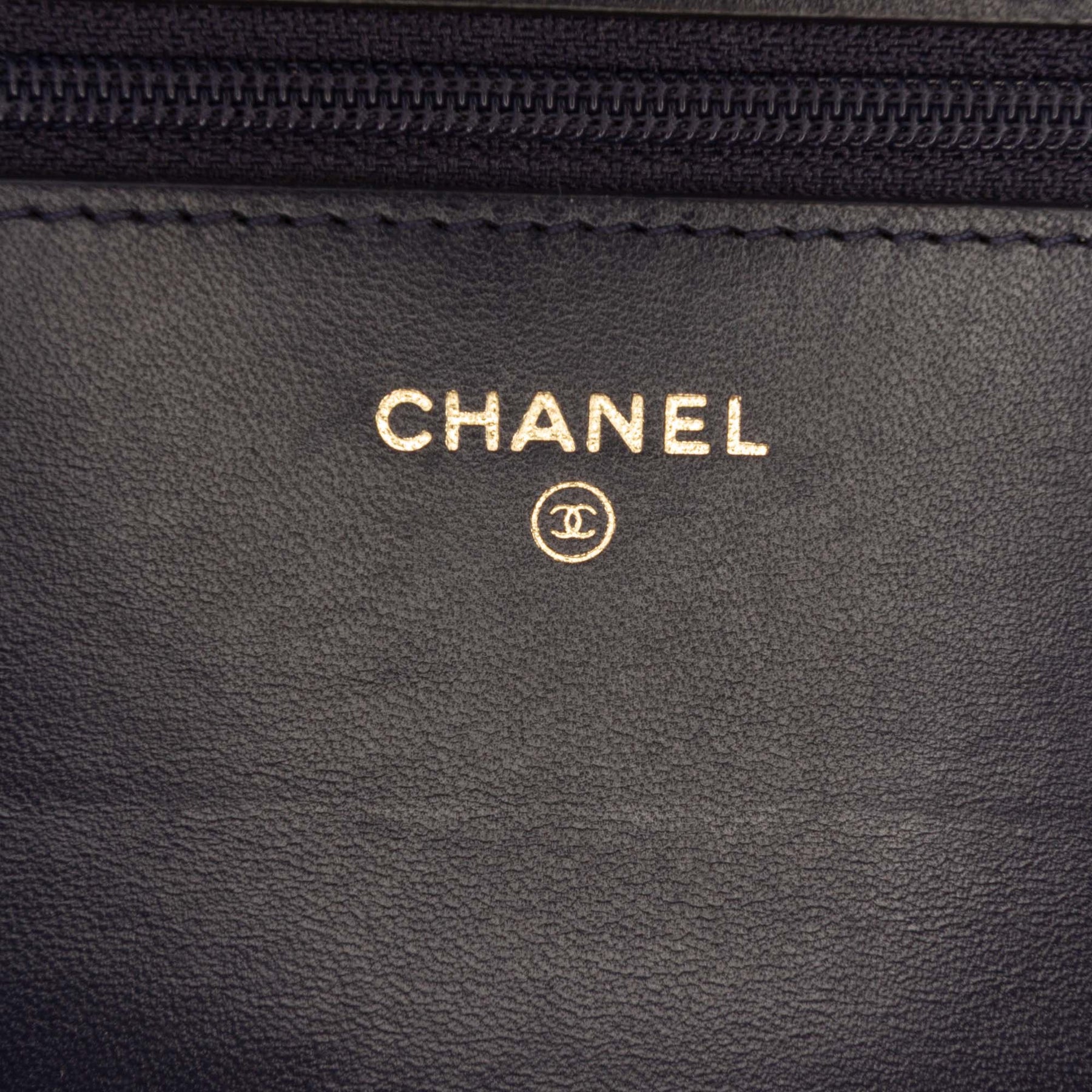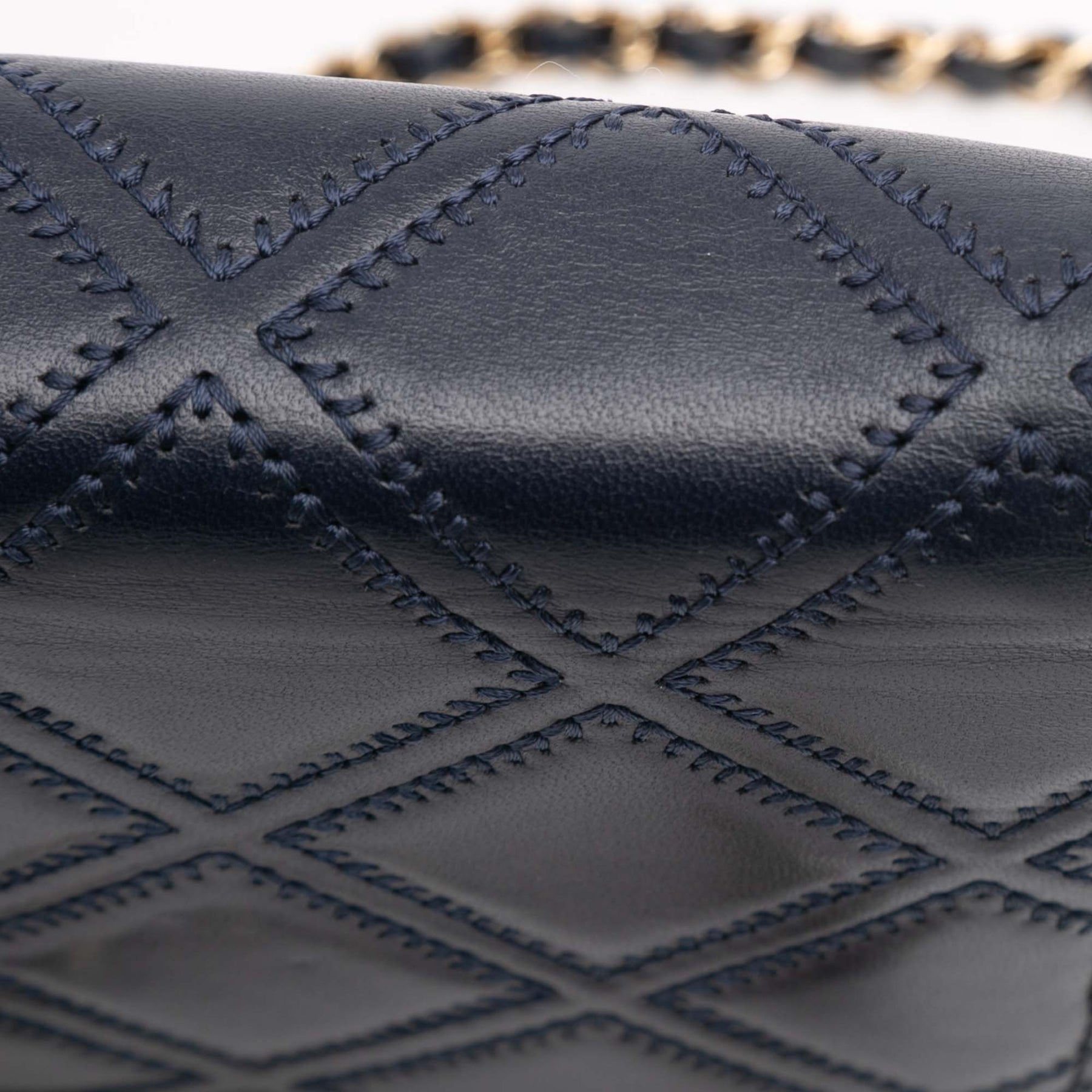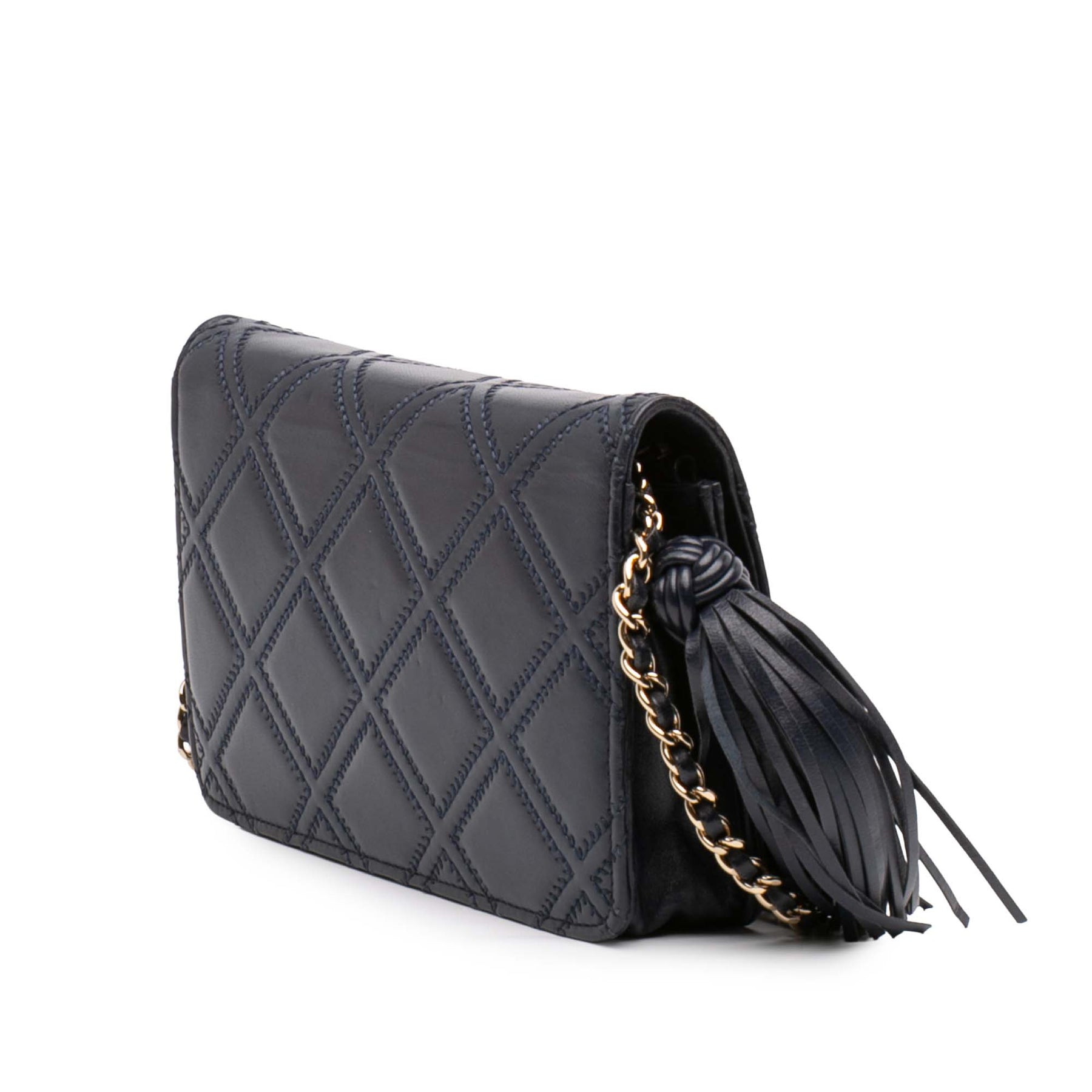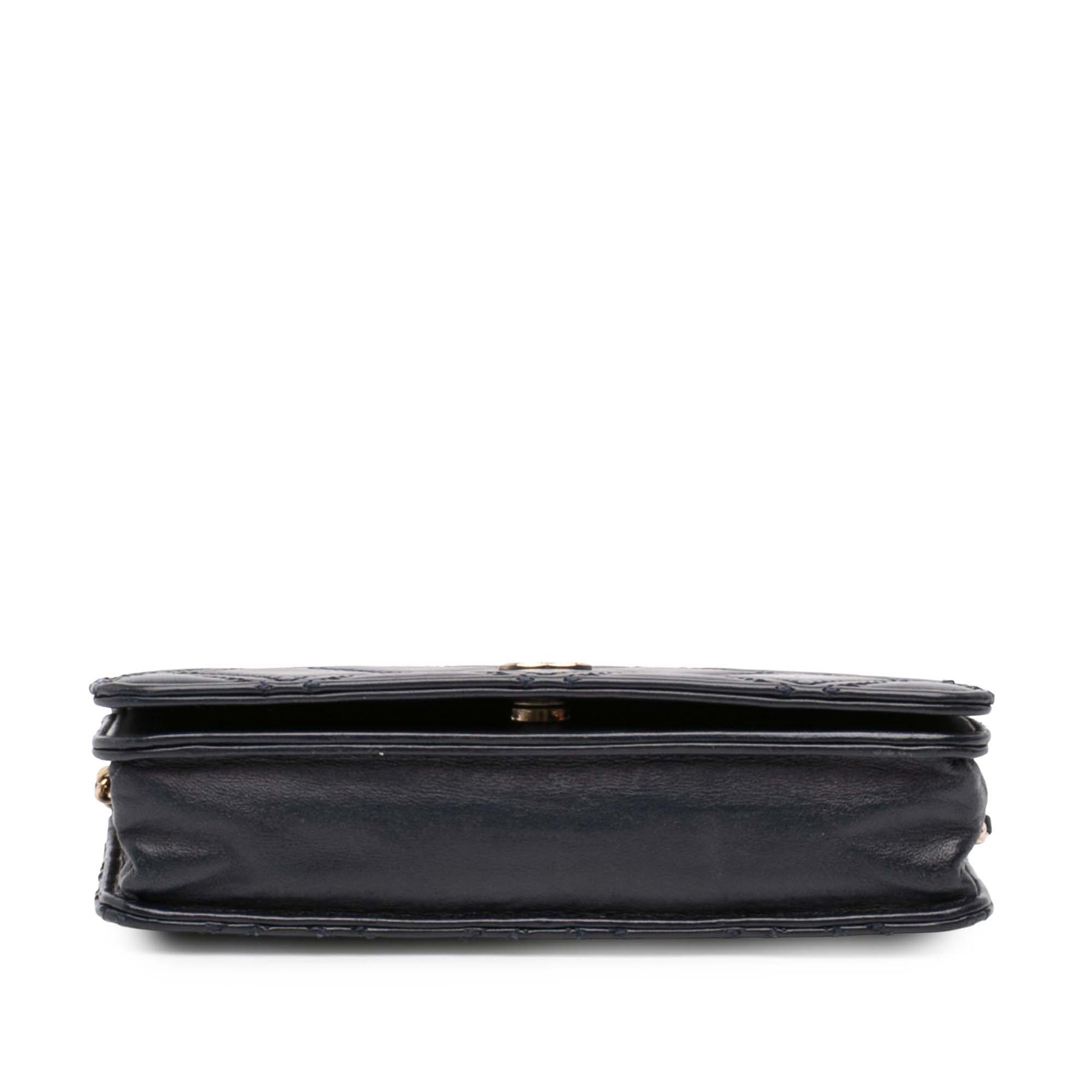 Ce portefeuille à bandoulière est confectionné en cuir d'agneau matelassé et possède une bandoulière en chaîne tressée de cuir, un rabat avant à fermeture magnétique, ainsi que des poches intérieures zippées et plaquées. Il est en bon état.