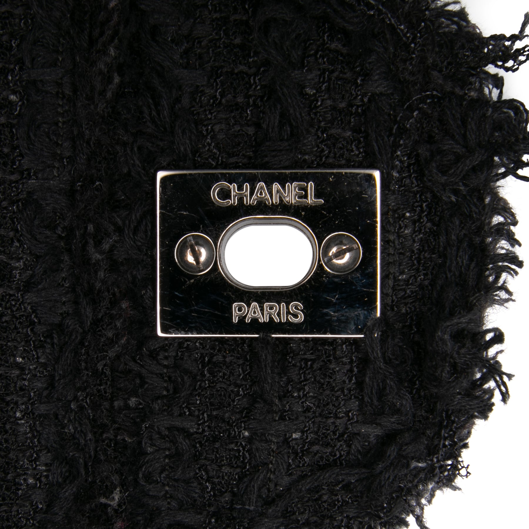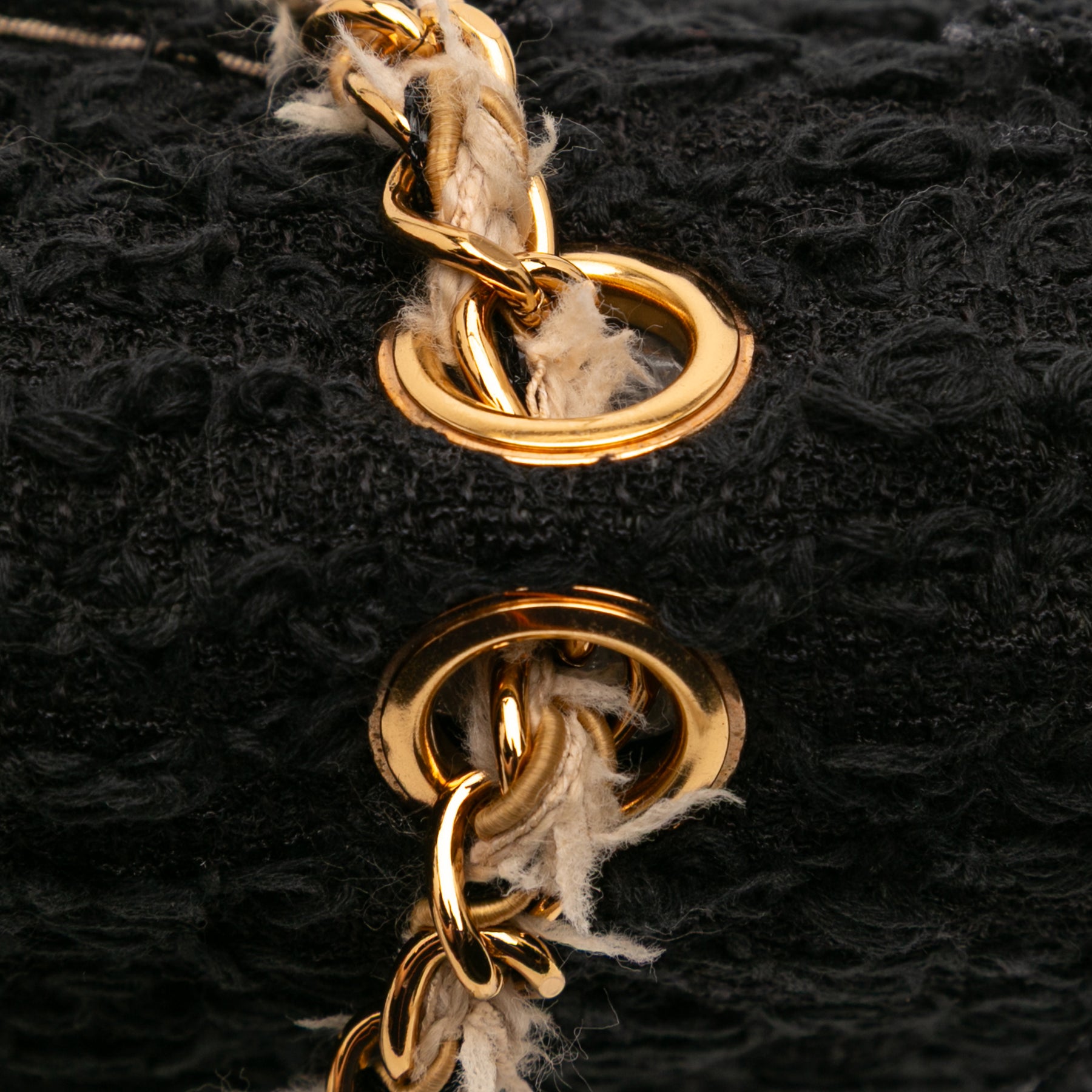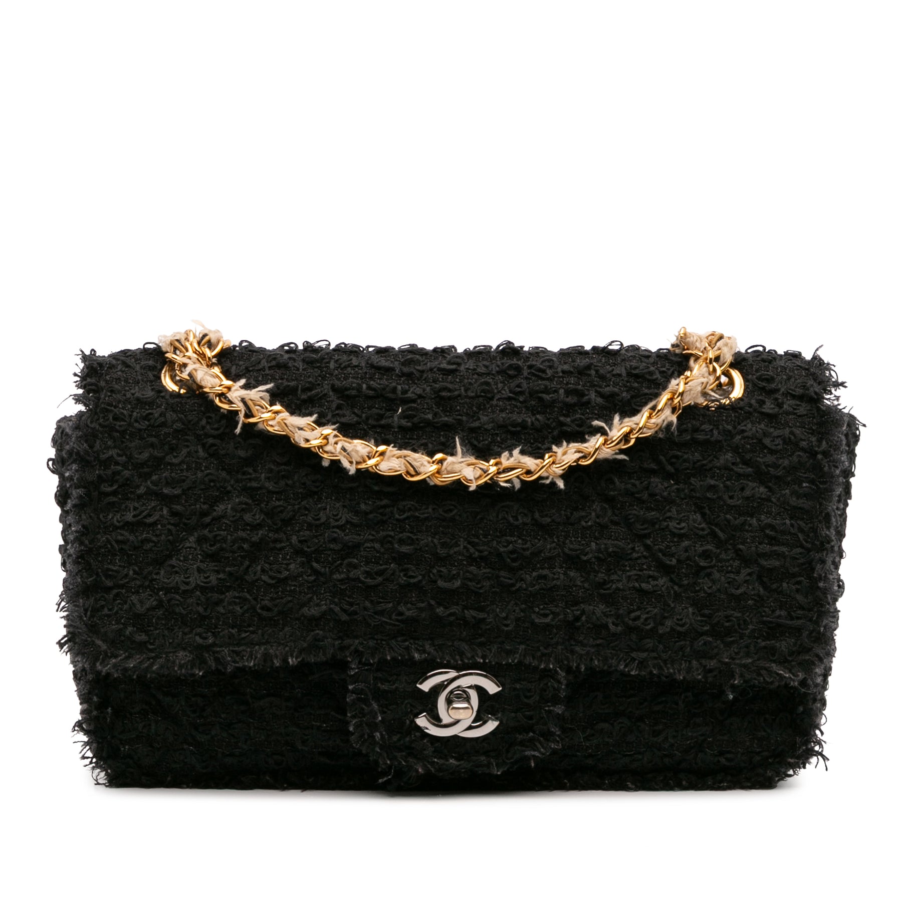 Ce sac à rabat est doté d'un corps en tweed, d'une bandoulière chaîne en tweed doré, d'un rabat avant avec des C entrelacés et un fermoir à vis, d'une poche extérieure plaquée au dos et de poches intérieures plaquées. Il est en excellent état.
