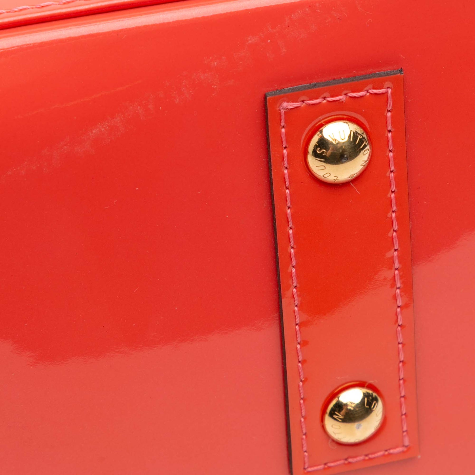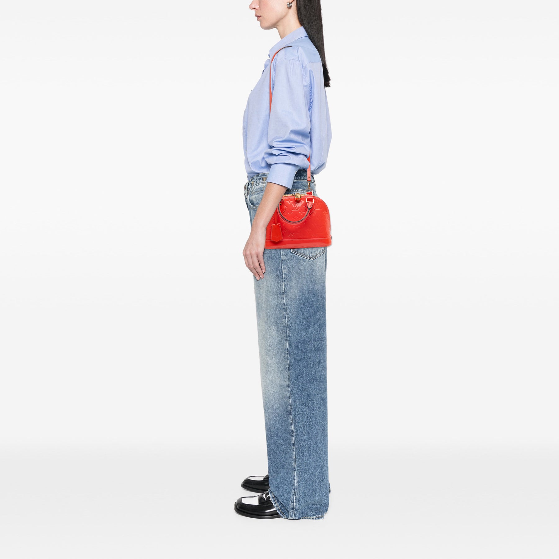 Le sac Alma BB est doté d'un corps en cuir verni, de poignées roulées en cuir, d'une bandoulière amovible en cuir, d'une fermeture zippée sur le dessus, d'une clochette et d'une poche intérieure plaquée. Il est en bon état.