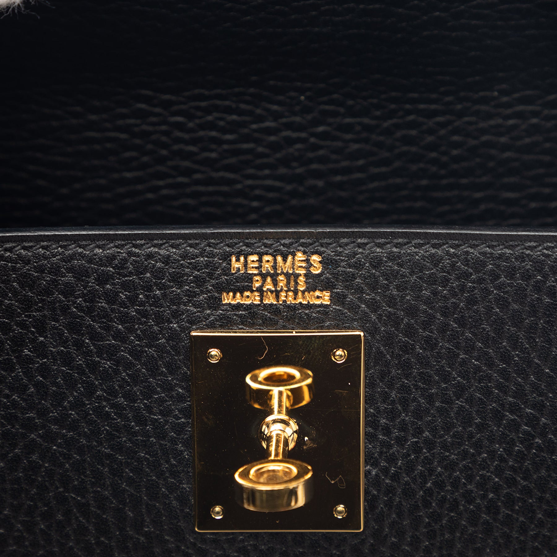 Le sac Kelly Sellier 32 est confectionné en cuir Ardennes noir et possède une poignée supérieure roulée, une bandoulière plate amovible, un rabat avec fermoir tourniquet et fermeture à tirette, ainsi que des poches intérieures zippées et plaquées. Il est en bon état.