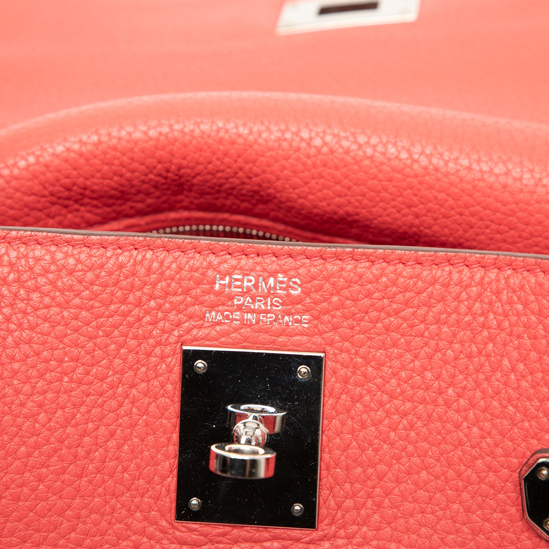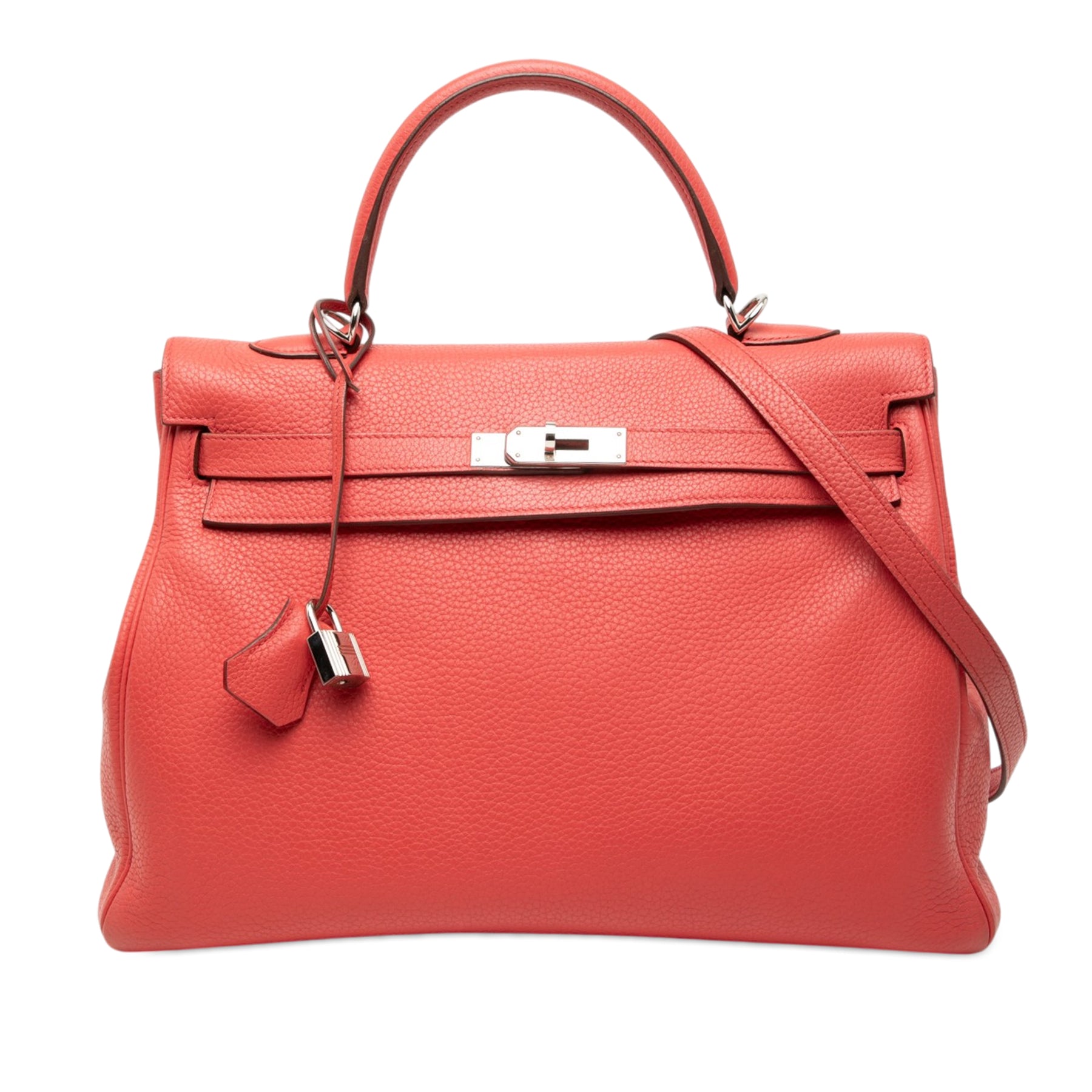 Le sac Kelly 35 est confectionné en cuir Clémence couleur Sanguine et possède une poignée supérieure plate en cuir, une bandoulière amovible, un rabat supérieur avec fermeture à tourniquet, ainsi que des poches intérieures zippées et plaquées. Il est en bon état.