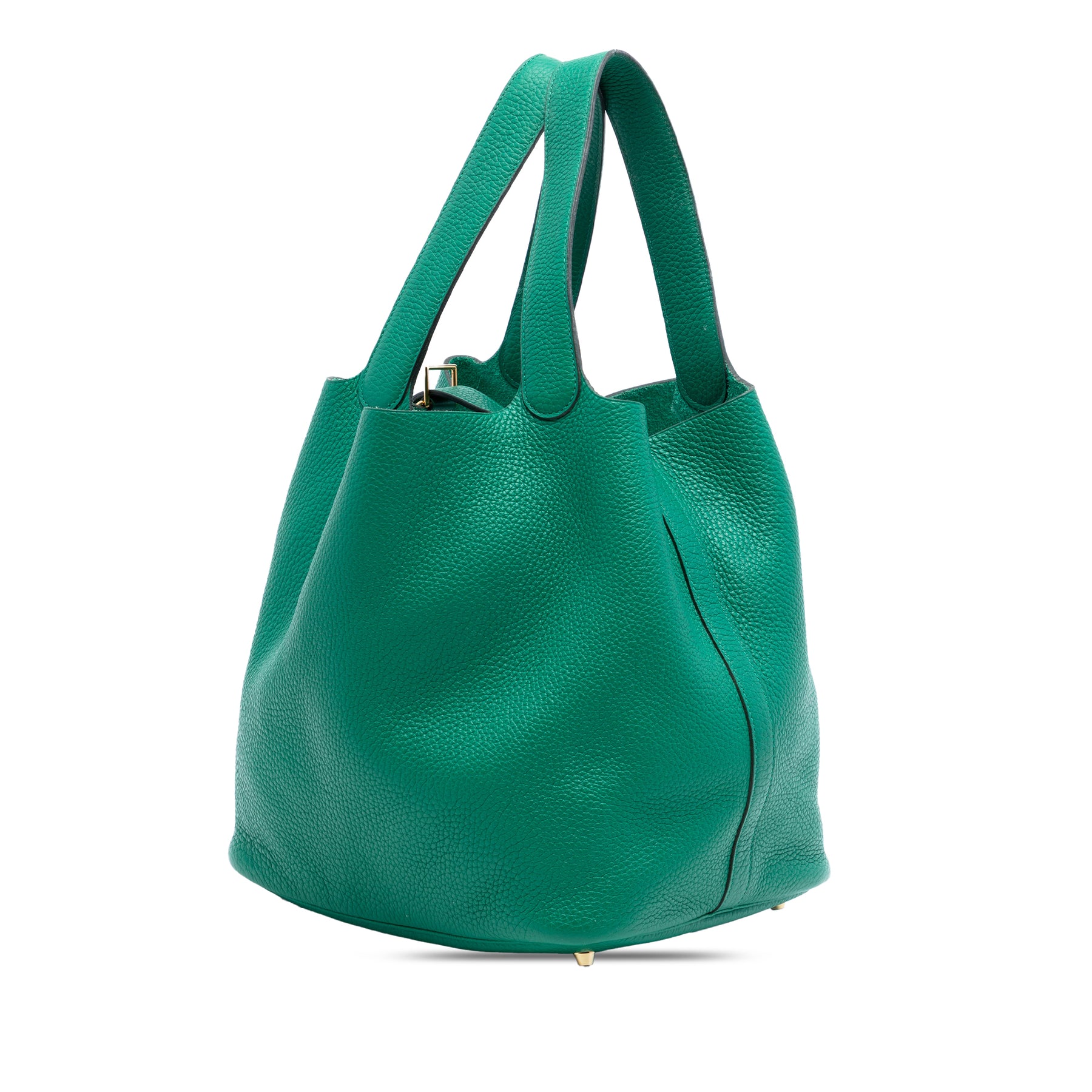 Le sac Picotin 26 est doté d'un corps en cuir Clémence couleur Vert Vertigo, de poignées plates en cuir et d'une ouverture sur le dessus avec une fermeture à boucle plate. Il est en excellent état.