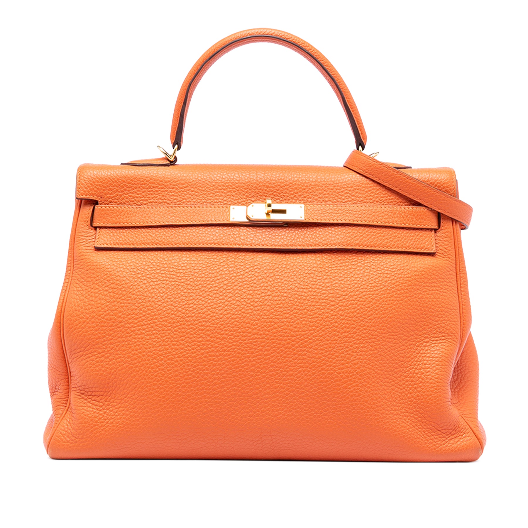 Ce sac Kelly 35 est confectionné en cuir Togo orange et possède une poignée plate en cuir, une bandoulière plate amovible, un rabat avec fermoir tourniquet, des finitions dorées, ainsi que des poches intérieures zippées et plaquées. Il est en bon état.