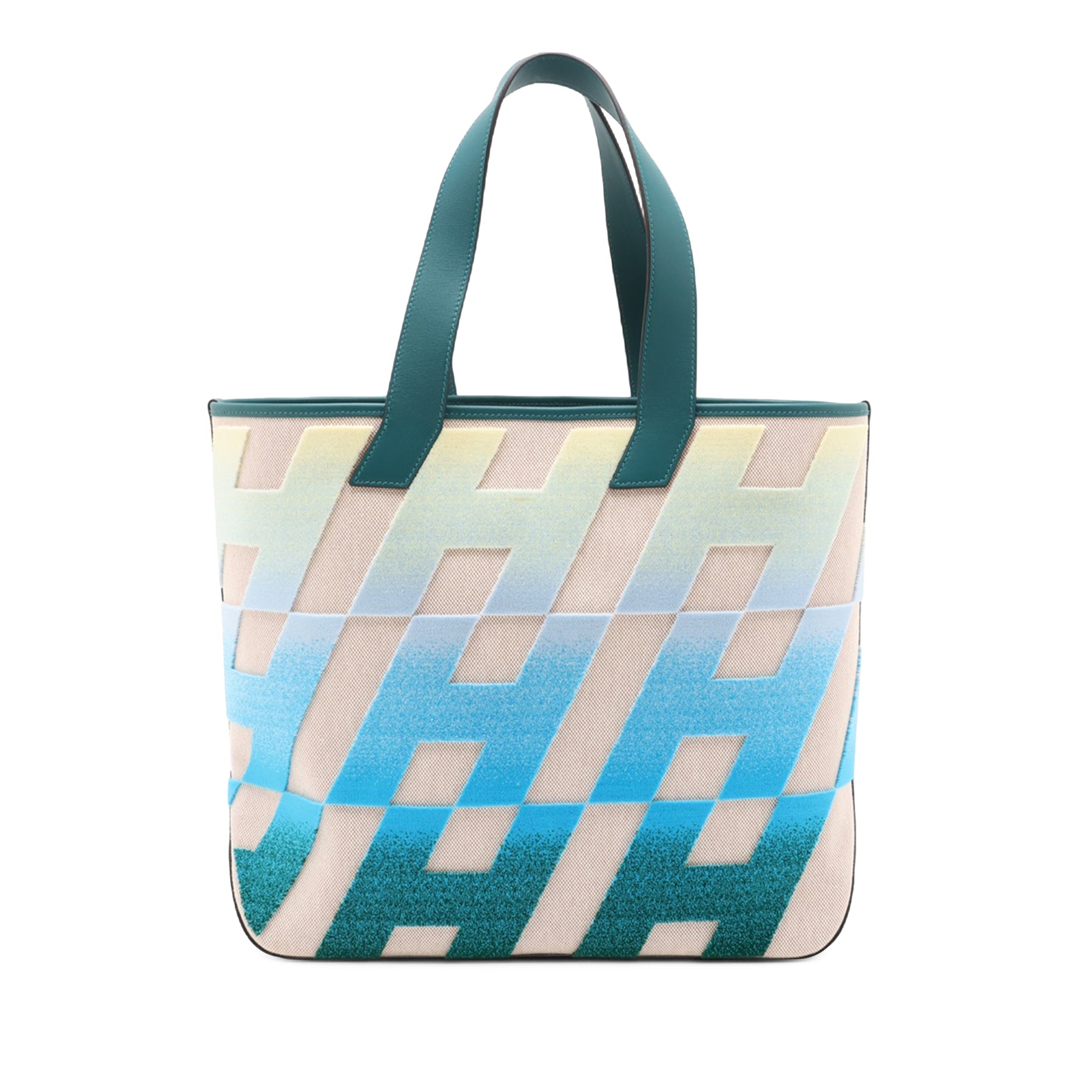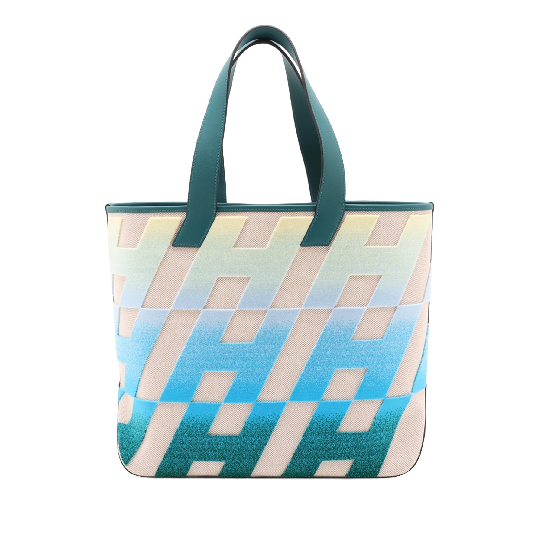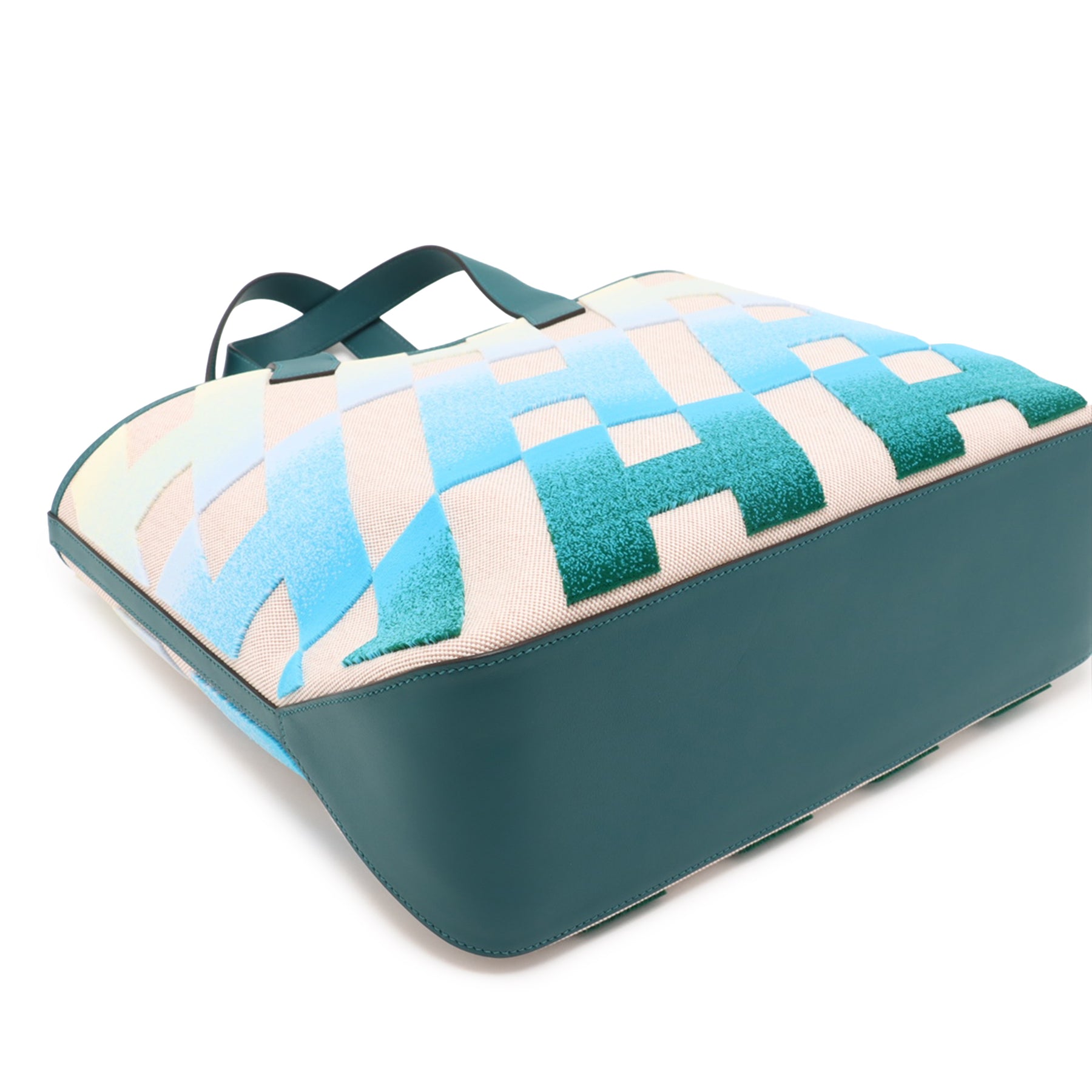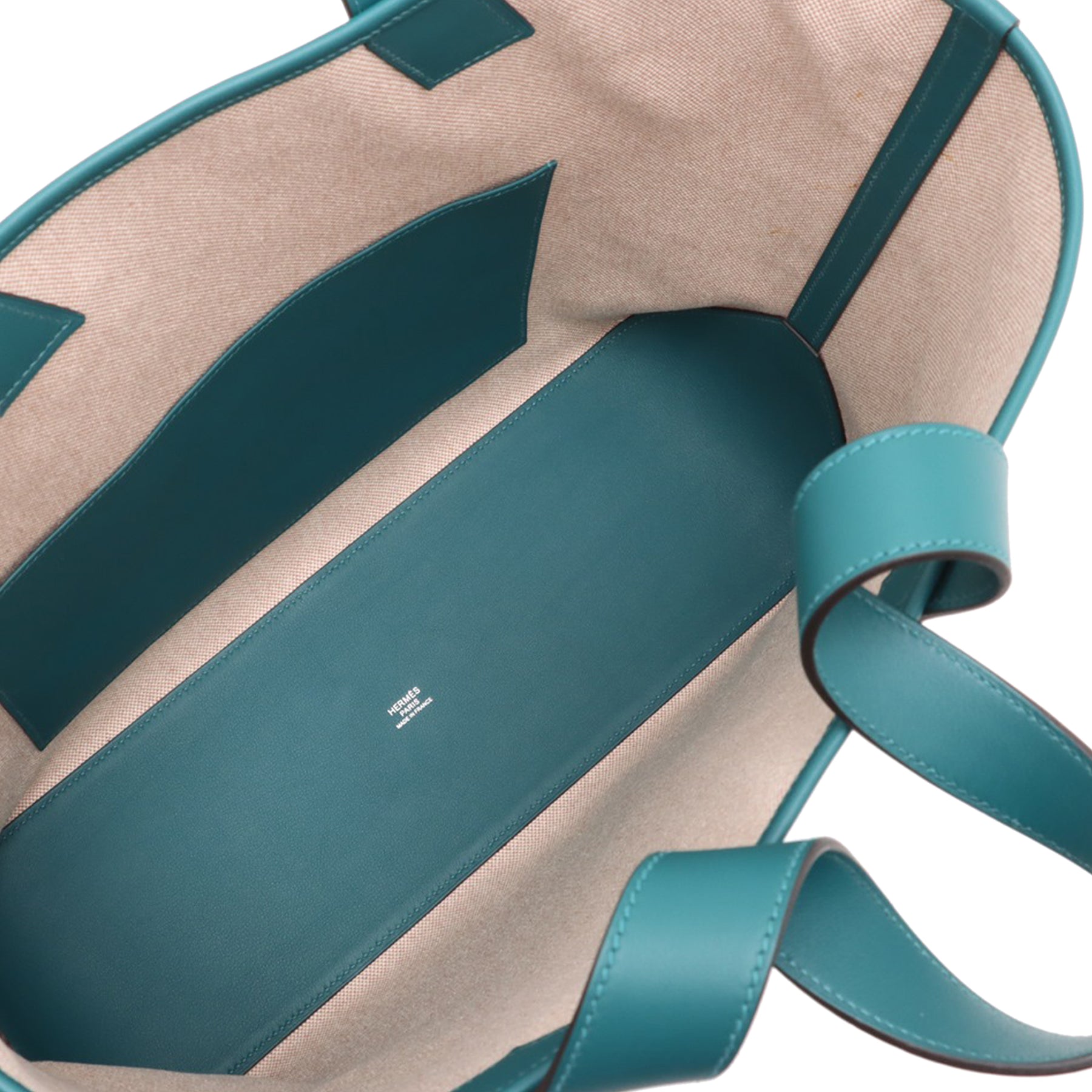 Le Cabas H en Biais est doté d'une structure en toile, de finitions Swift couleur Vert Bosphore, de poignées plates en cuir et d'une ouverture sur le dessus. Il est en excellent état.