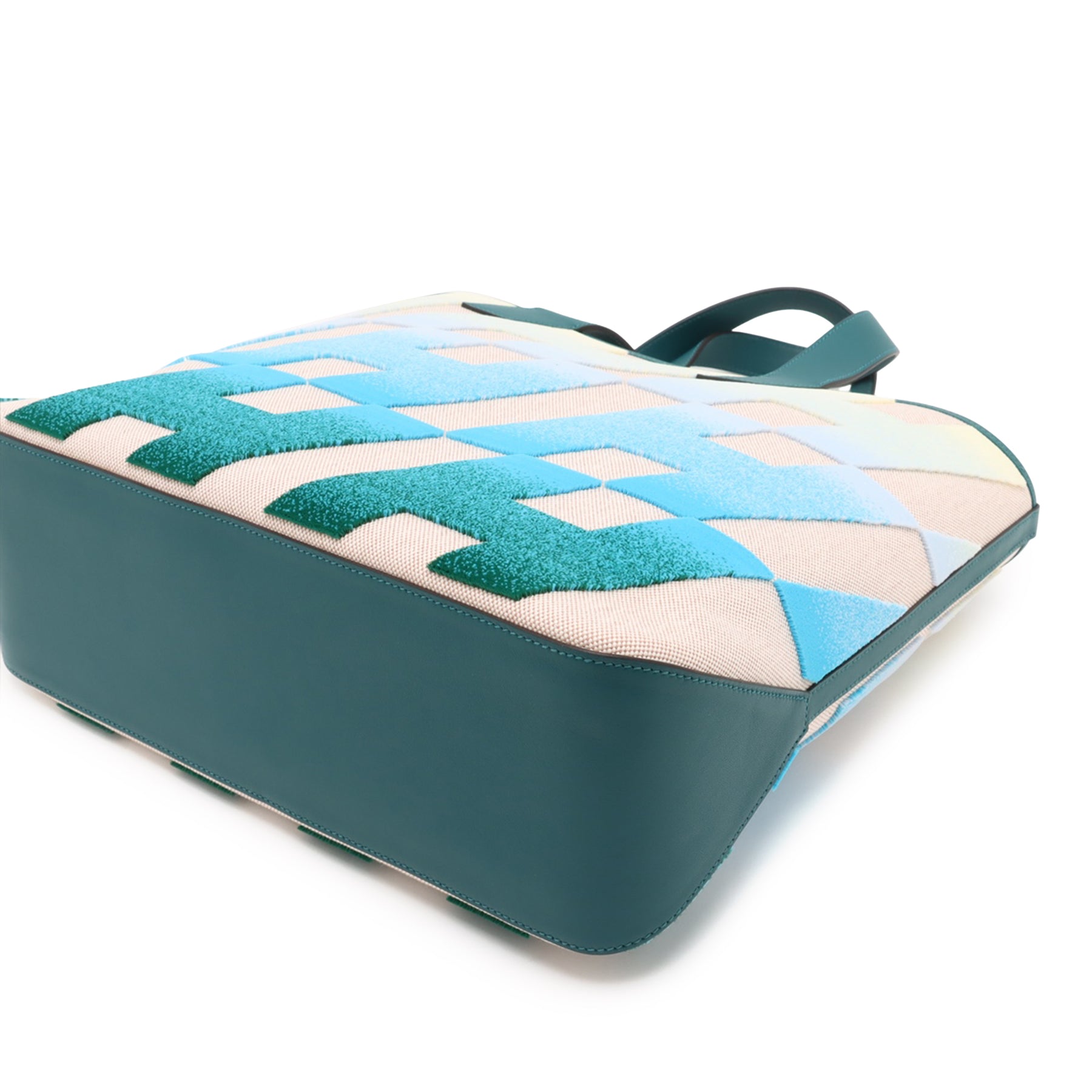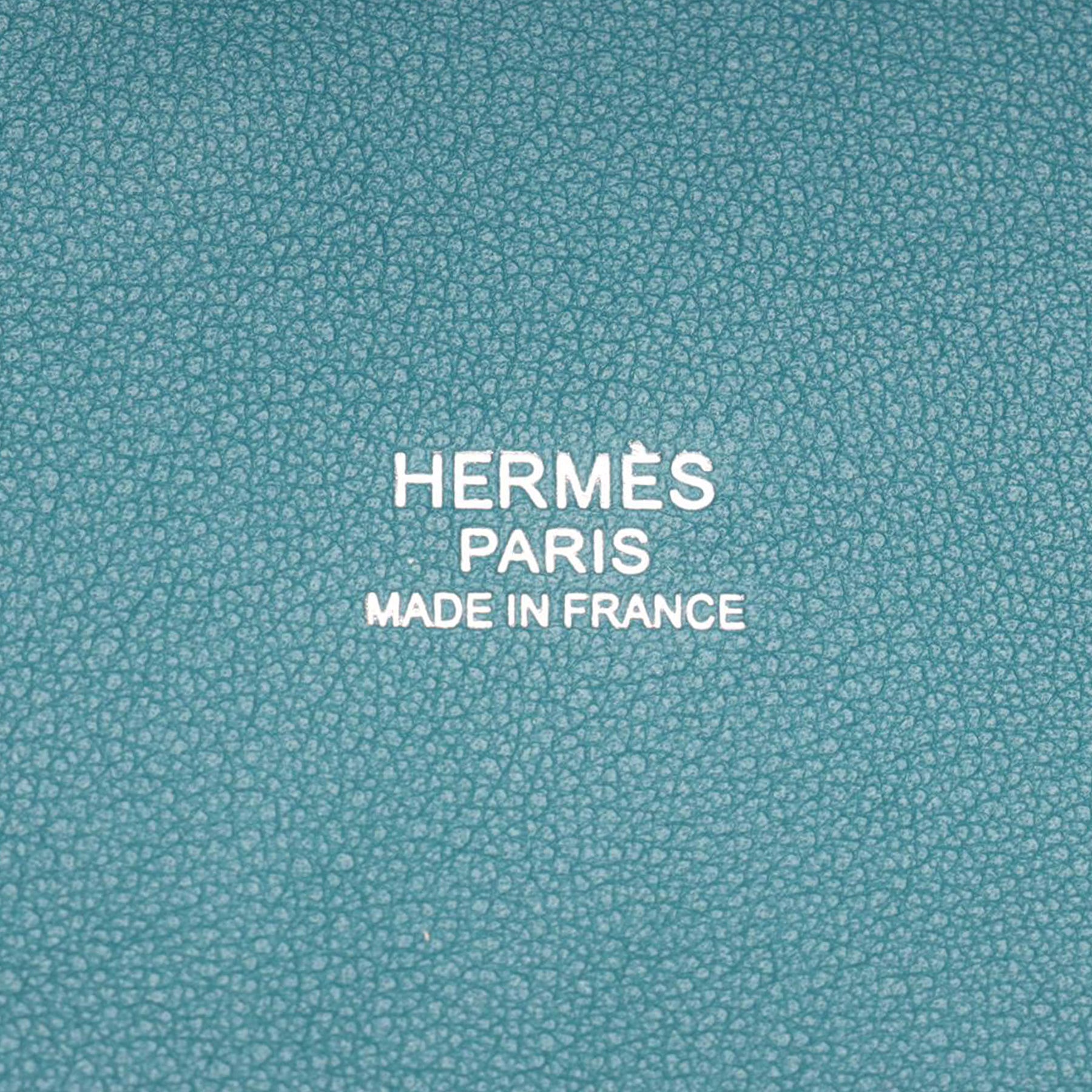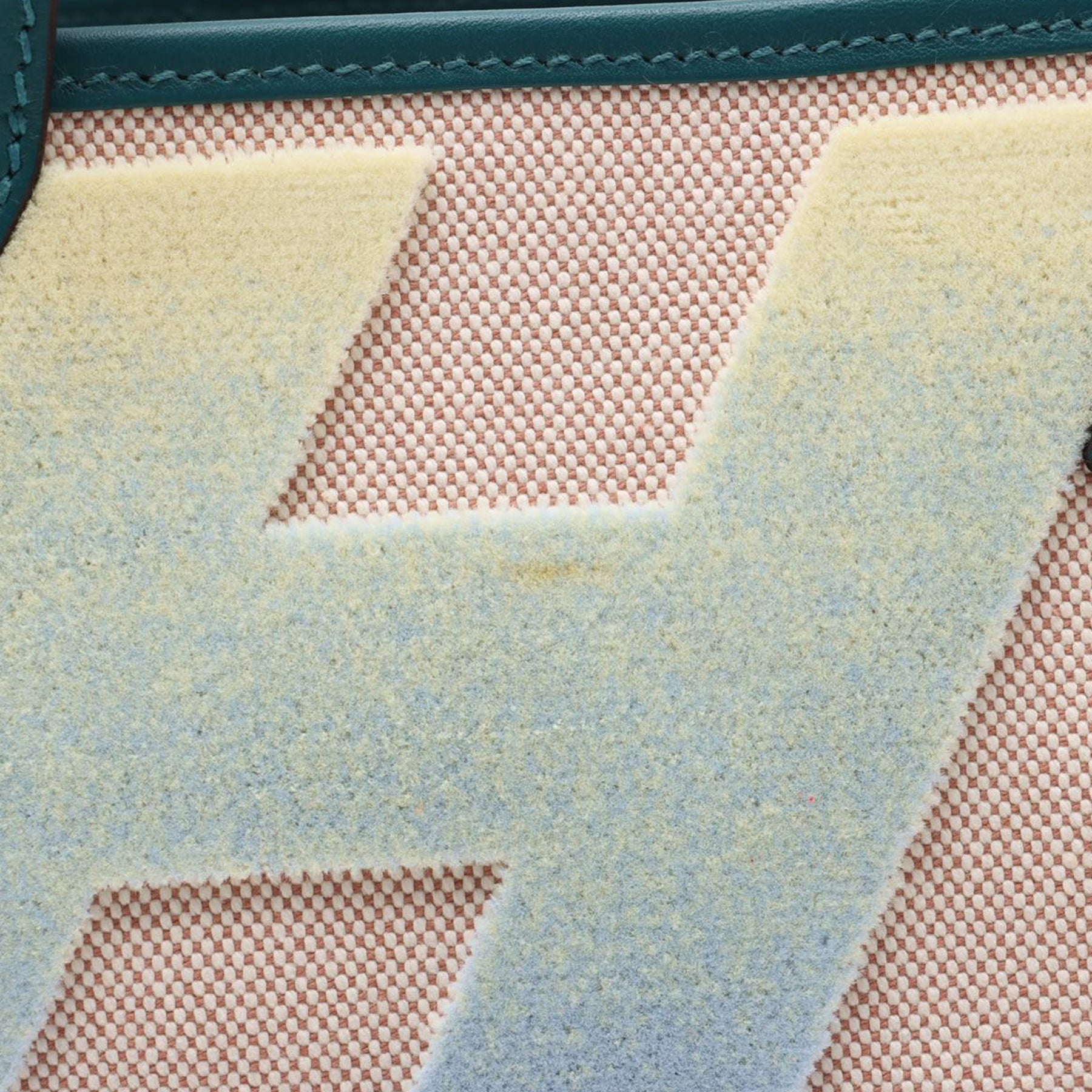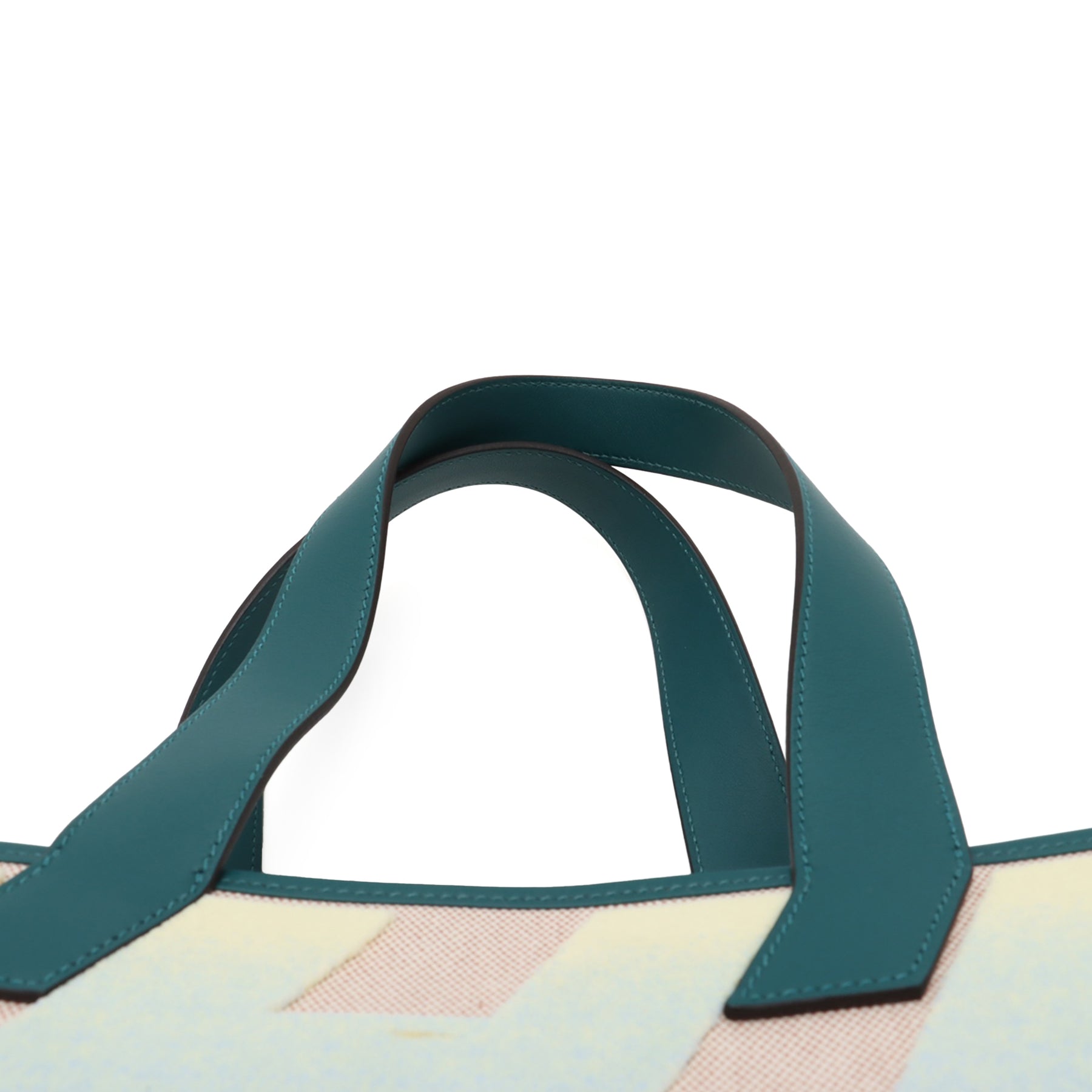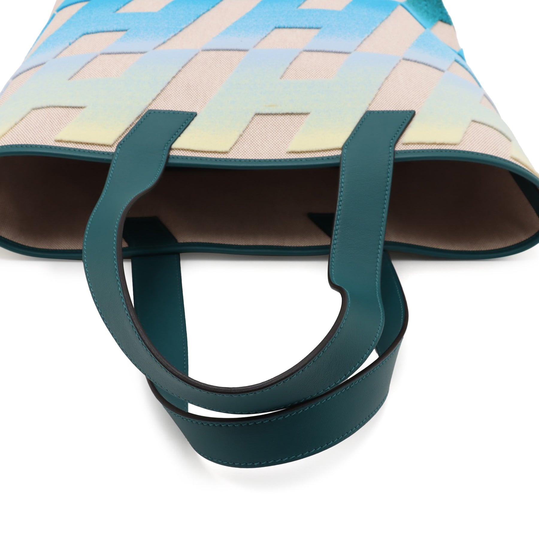 Le Cabas H en Biais est doté d'une structure en toile, de finitions Swift couleur Vert Bosphore, de poignées plates en cuir et d'une ouverture sur le dessus. Il est en excellent état.