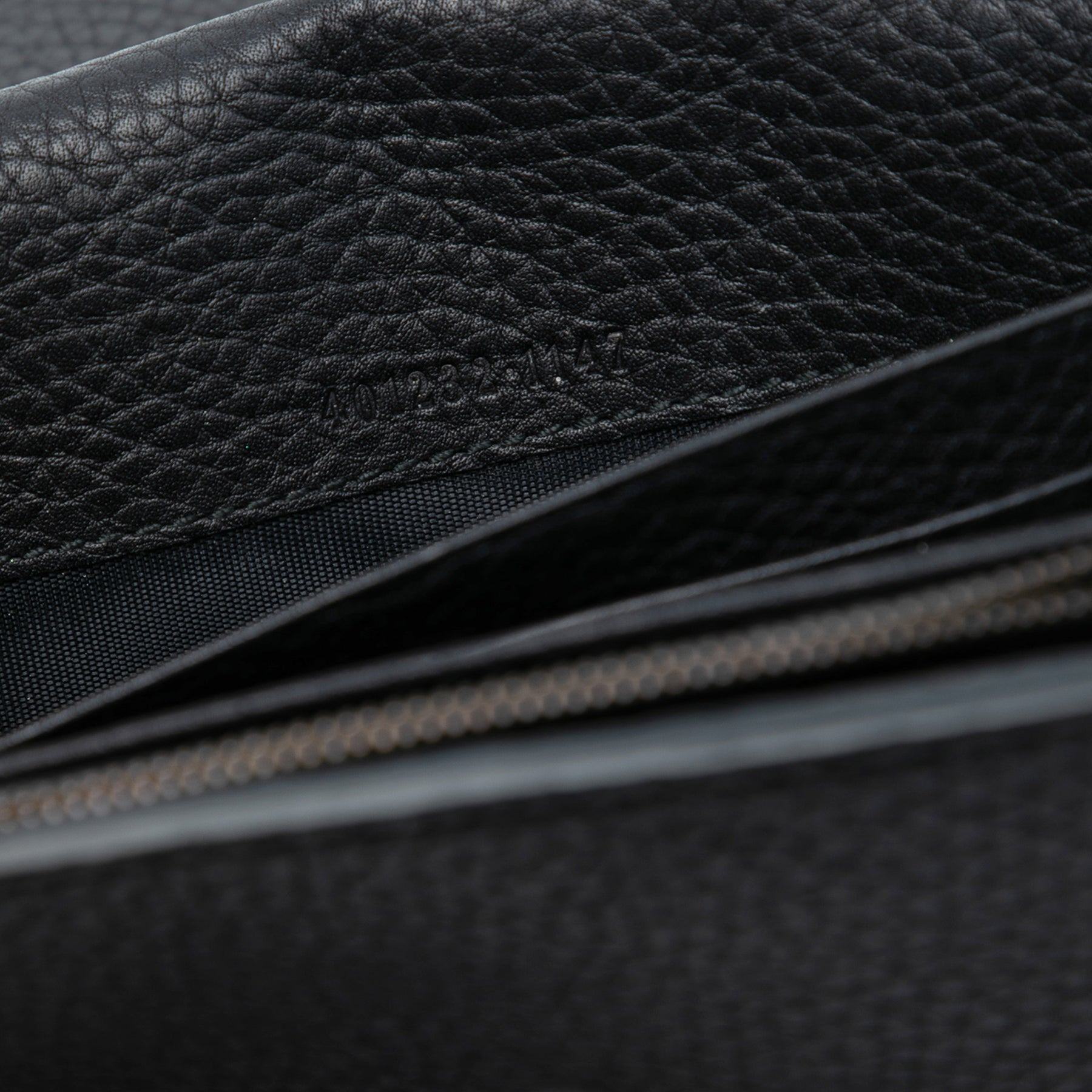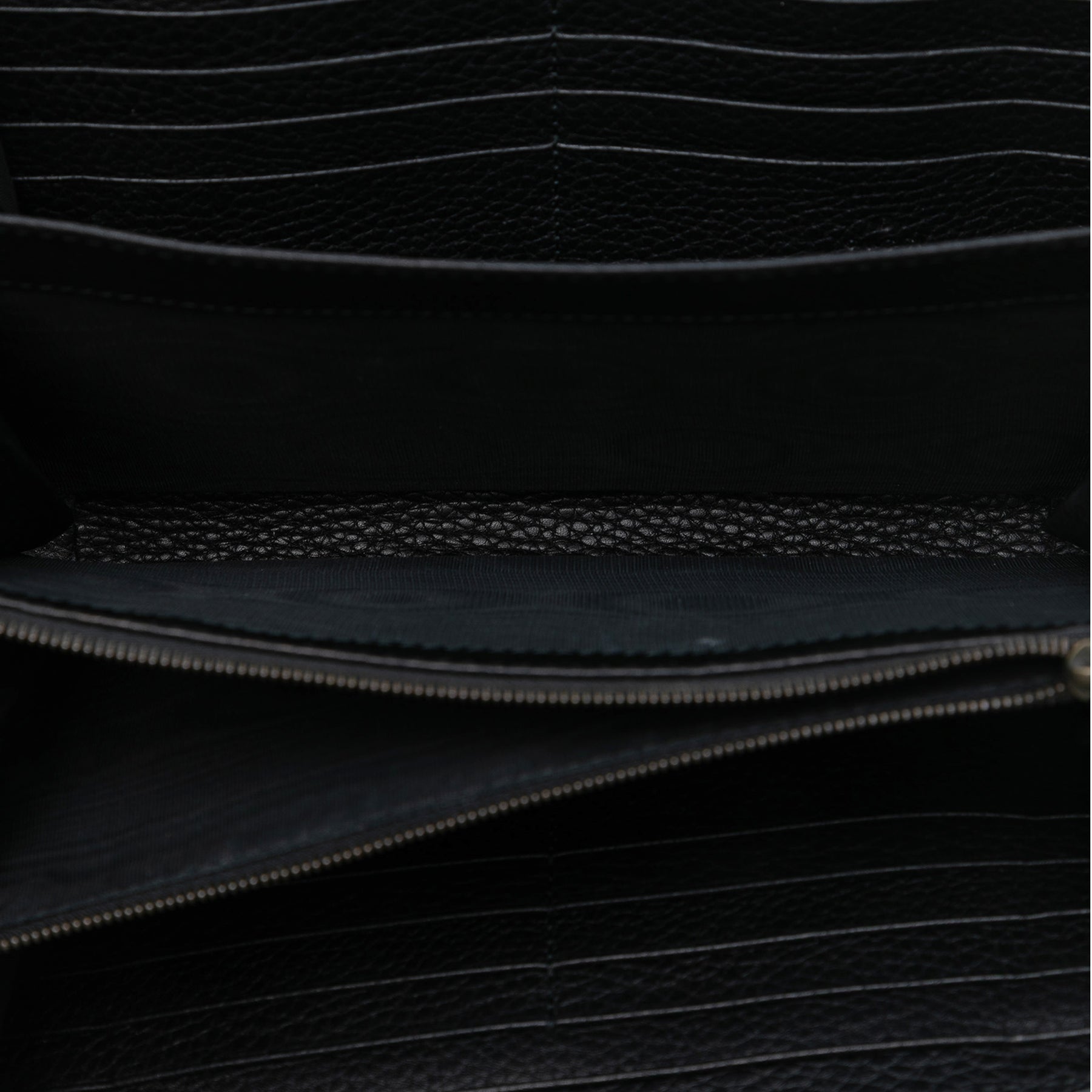 Ce portefeuille à chaîne est en cuir, possède un rabat avant avec fermeture à bouton-pression, ainsi que des poches intérieures zippées et plaquées. Il est en excellent état.