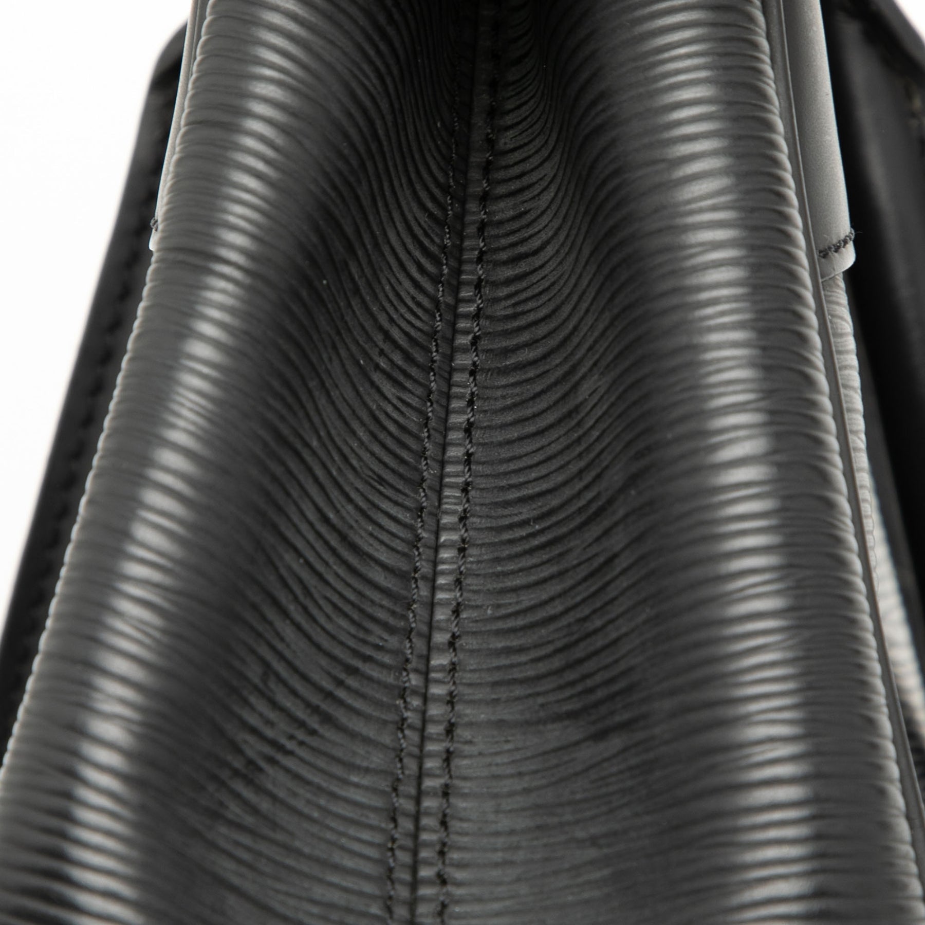 Le sac Passy PM est doté d'un corps en cuir Epi, de poignées roulées en cuir, d'une ouverture sur le dessus avec fermeture à mousqueton et de poches intérieures zippées et plaquées. Il est en bon état.