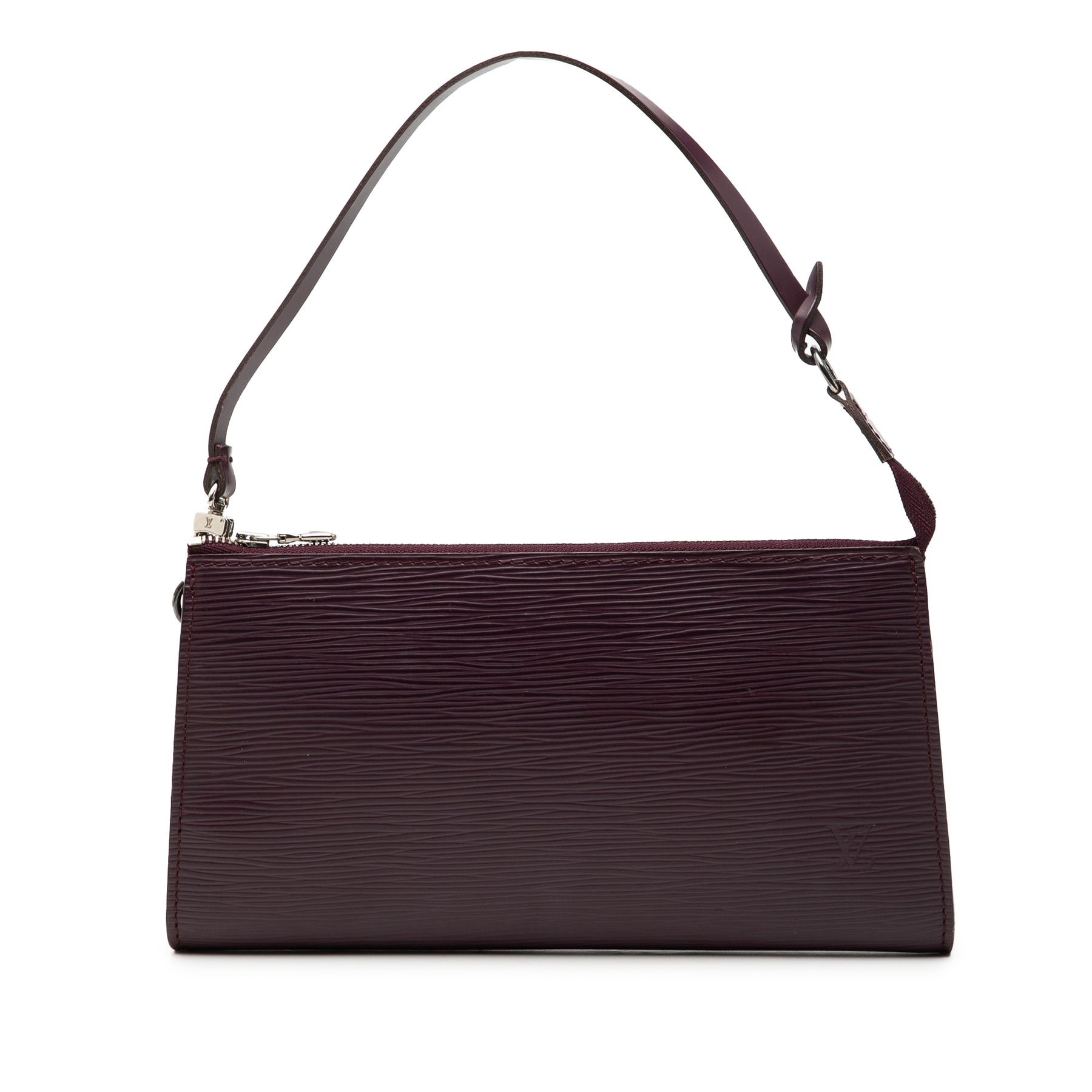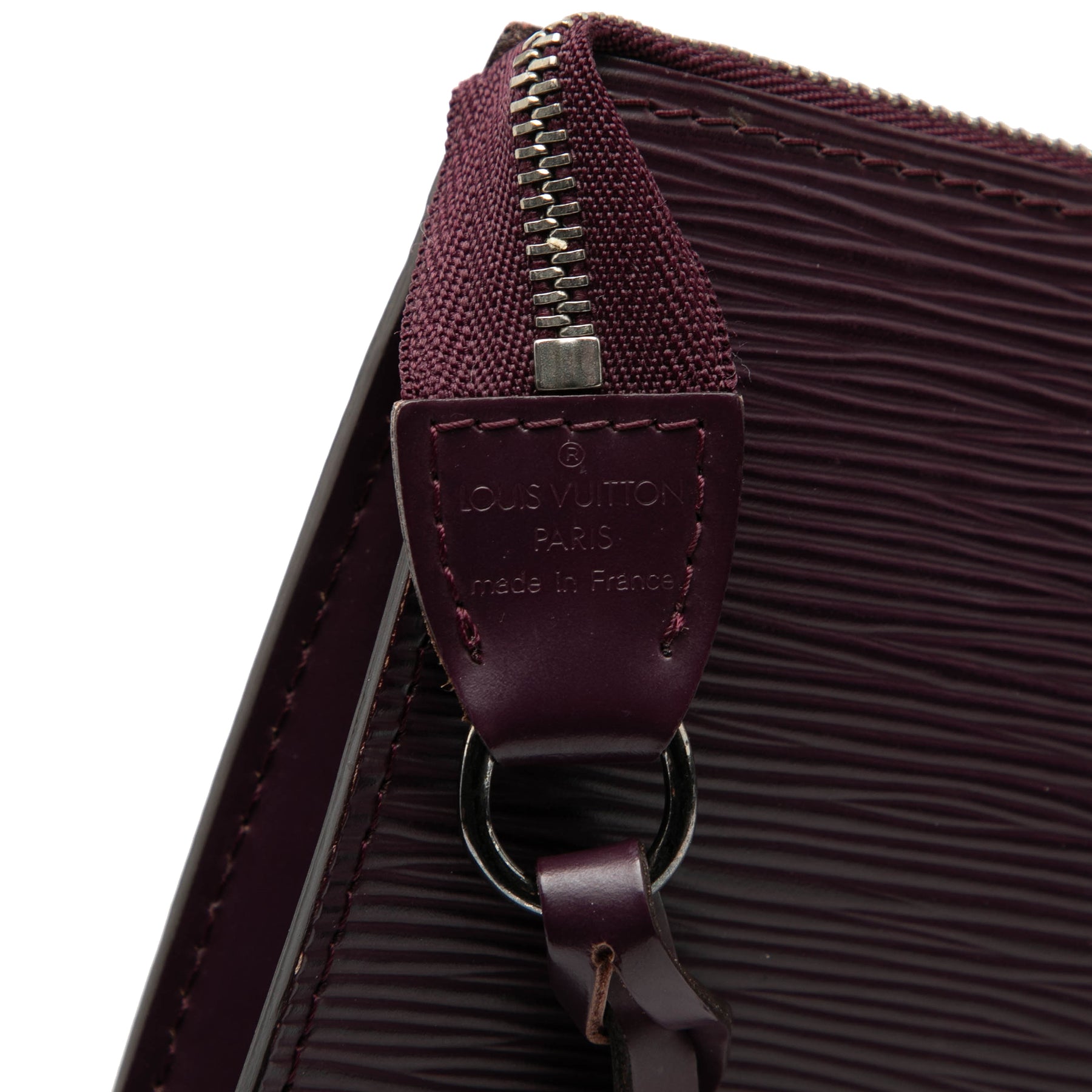 La Pochette Accessoires est confectionnée en cuir Epi, possède une bandoulière plate en cuir et une fermeture zippée sur le dessus. Elle est en bon état.