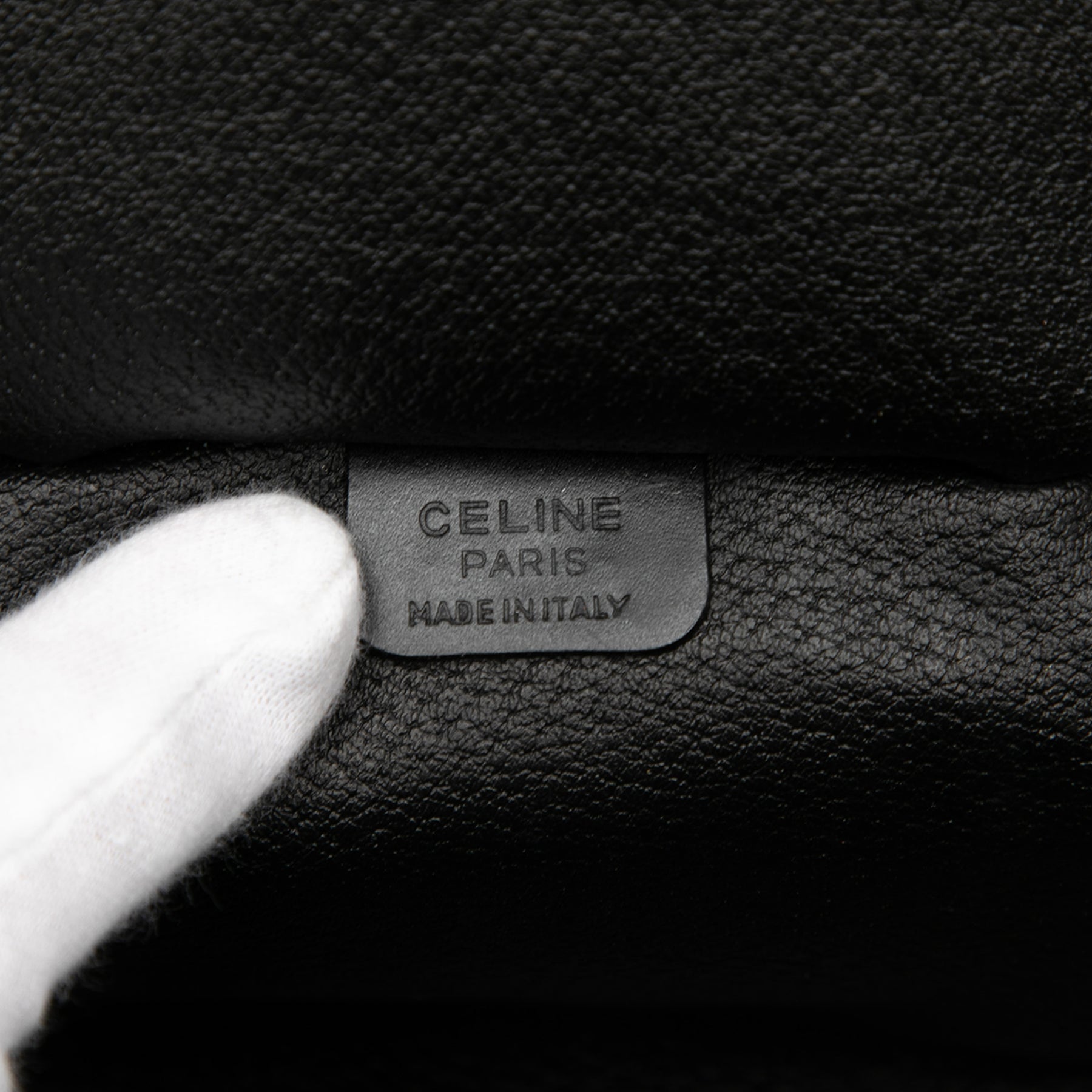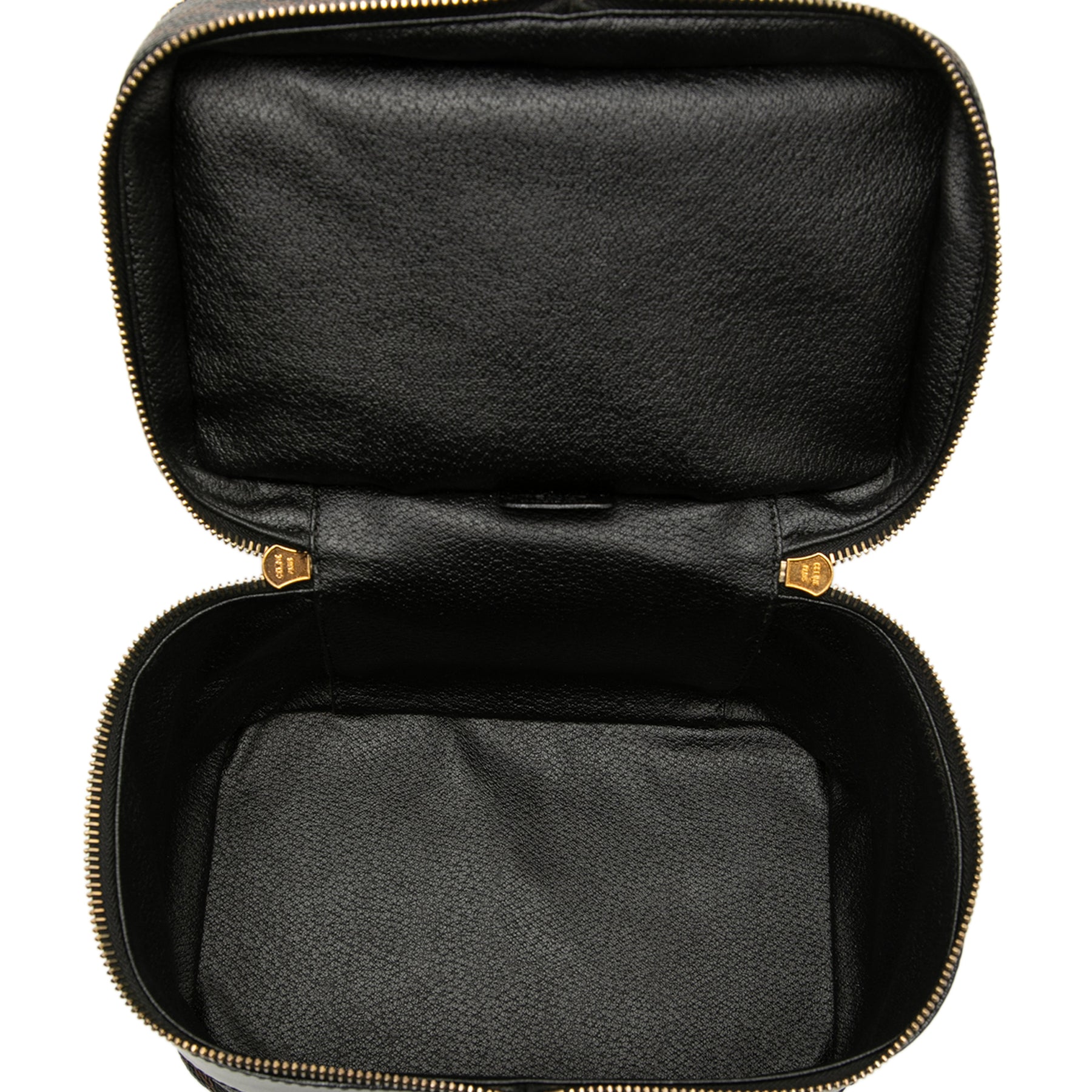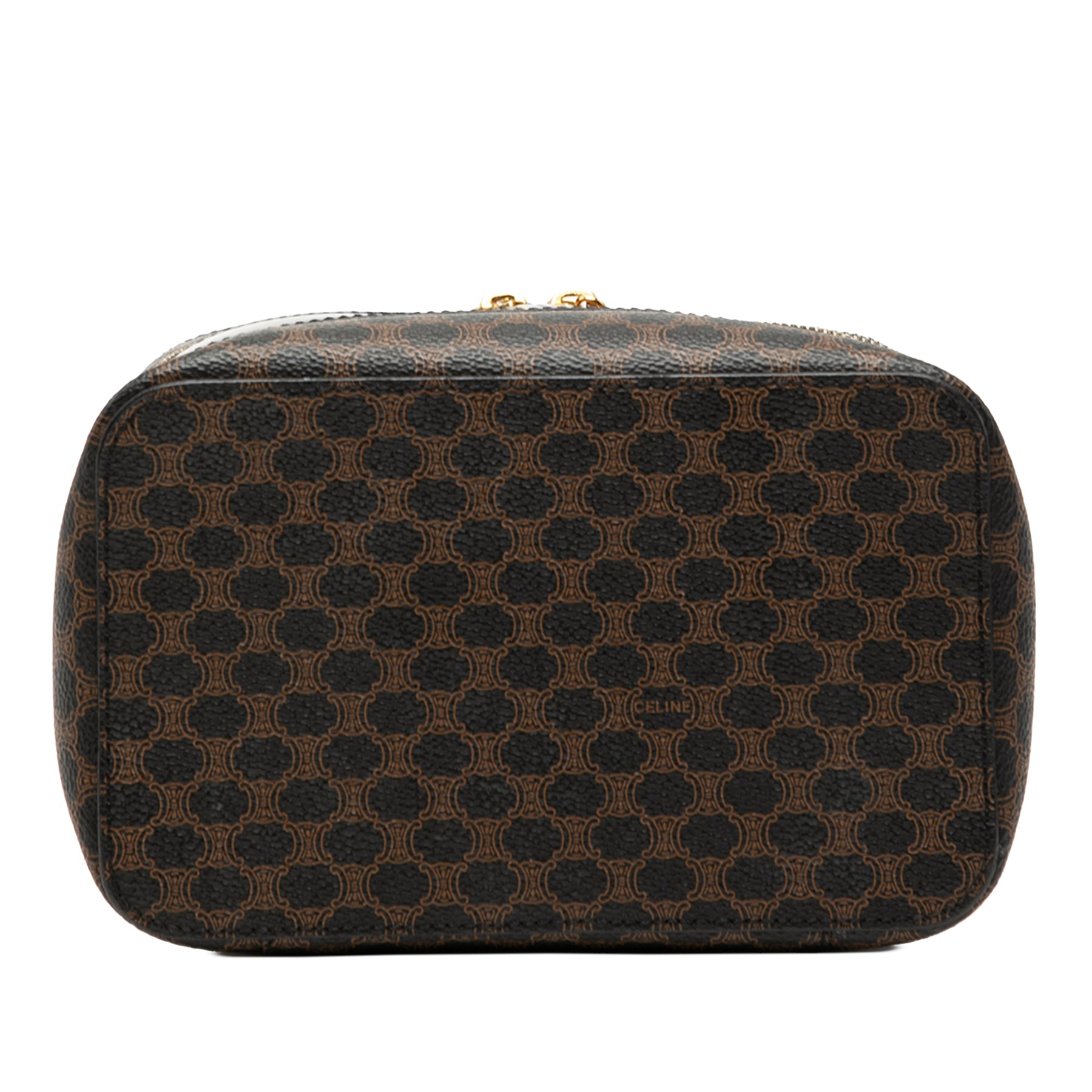 Ce sac vanity est confectionné en toile enduite avec des finitions en cuir, une poignée supérieure roulée en cuir et une fermeture à double zip. Il est en excellent état.